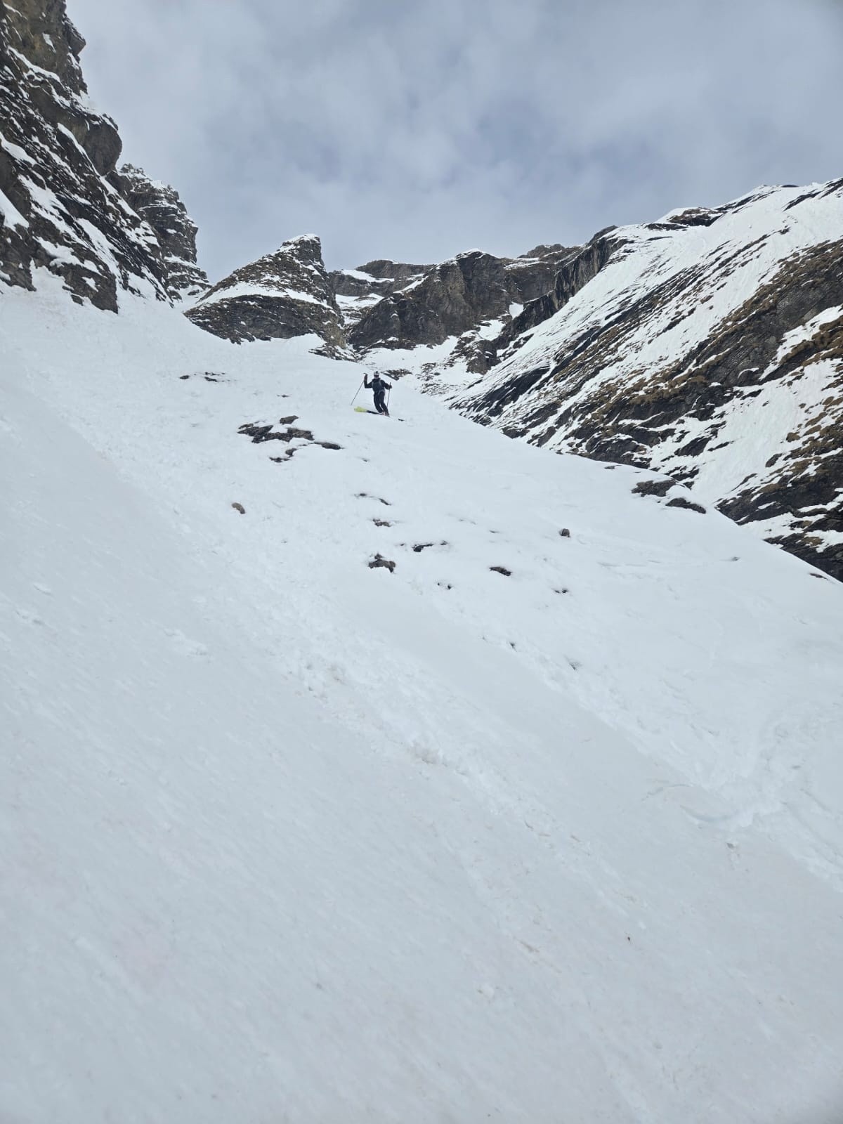 Conditions pour le ski : bonnes. Remplissage surprenant en sud/est, bon ski. Poudre lourde humidifiée, qui se skie assez bien. La suite est bien goulottée, neige plus dure et boulettes.
