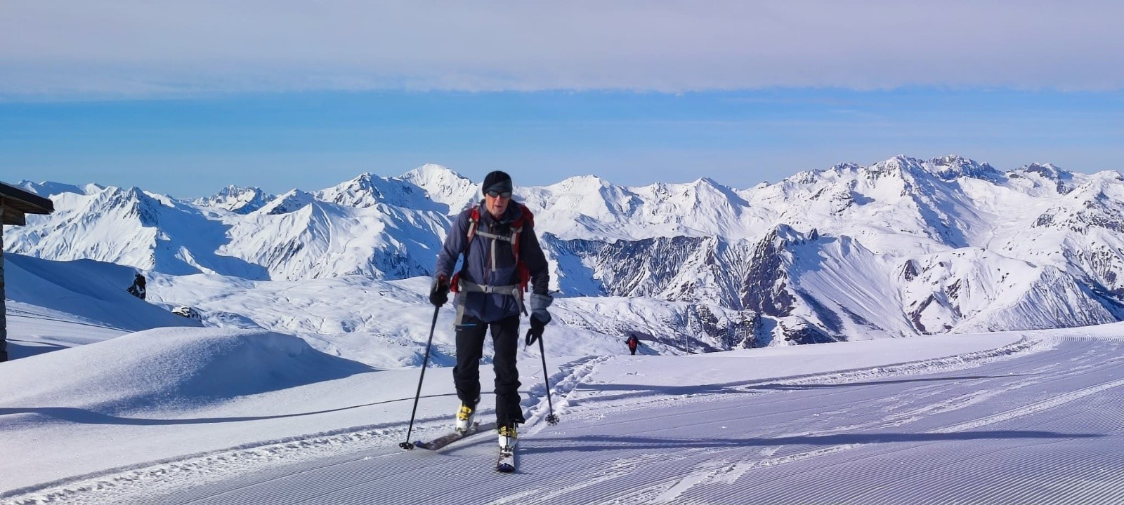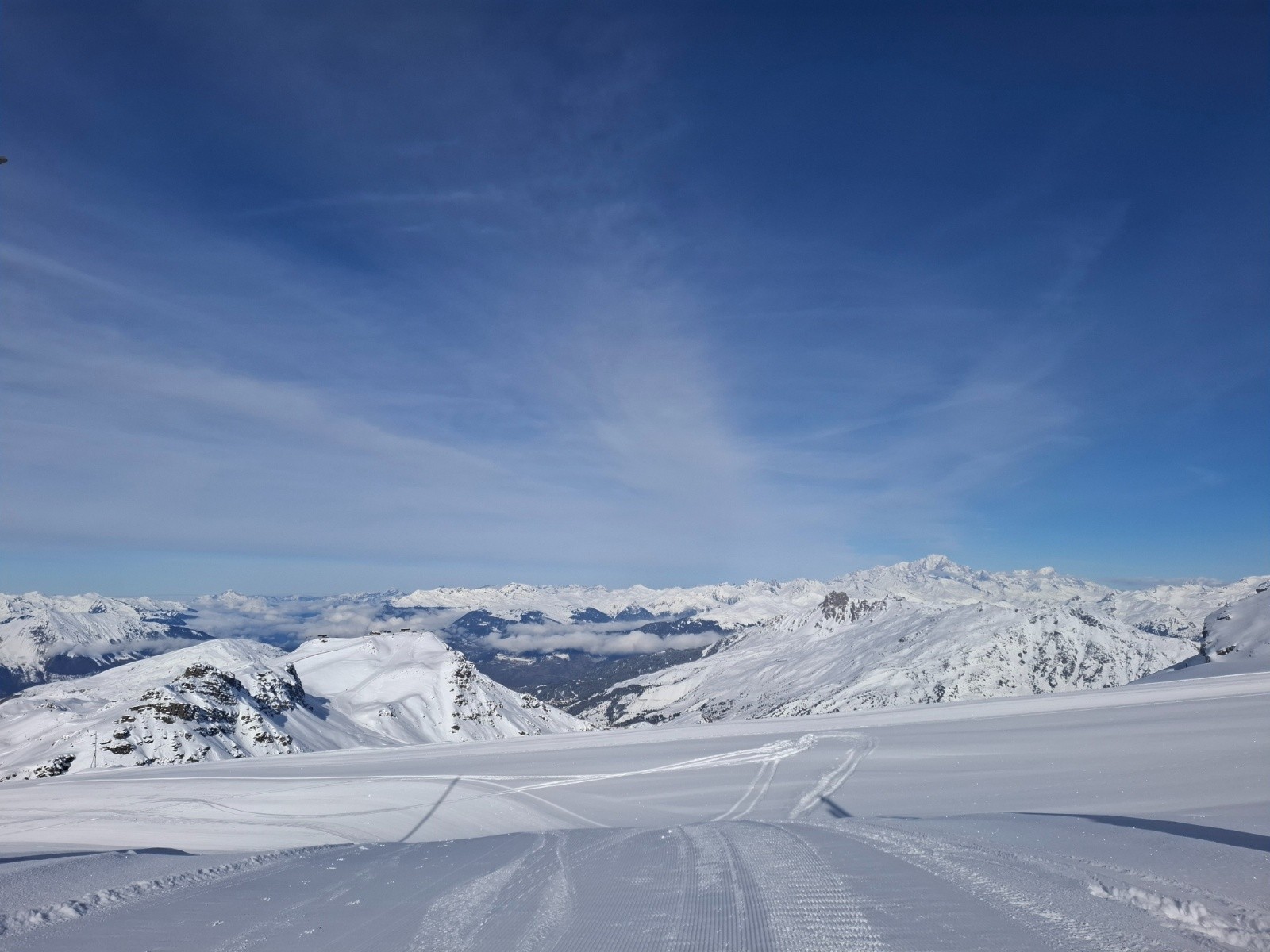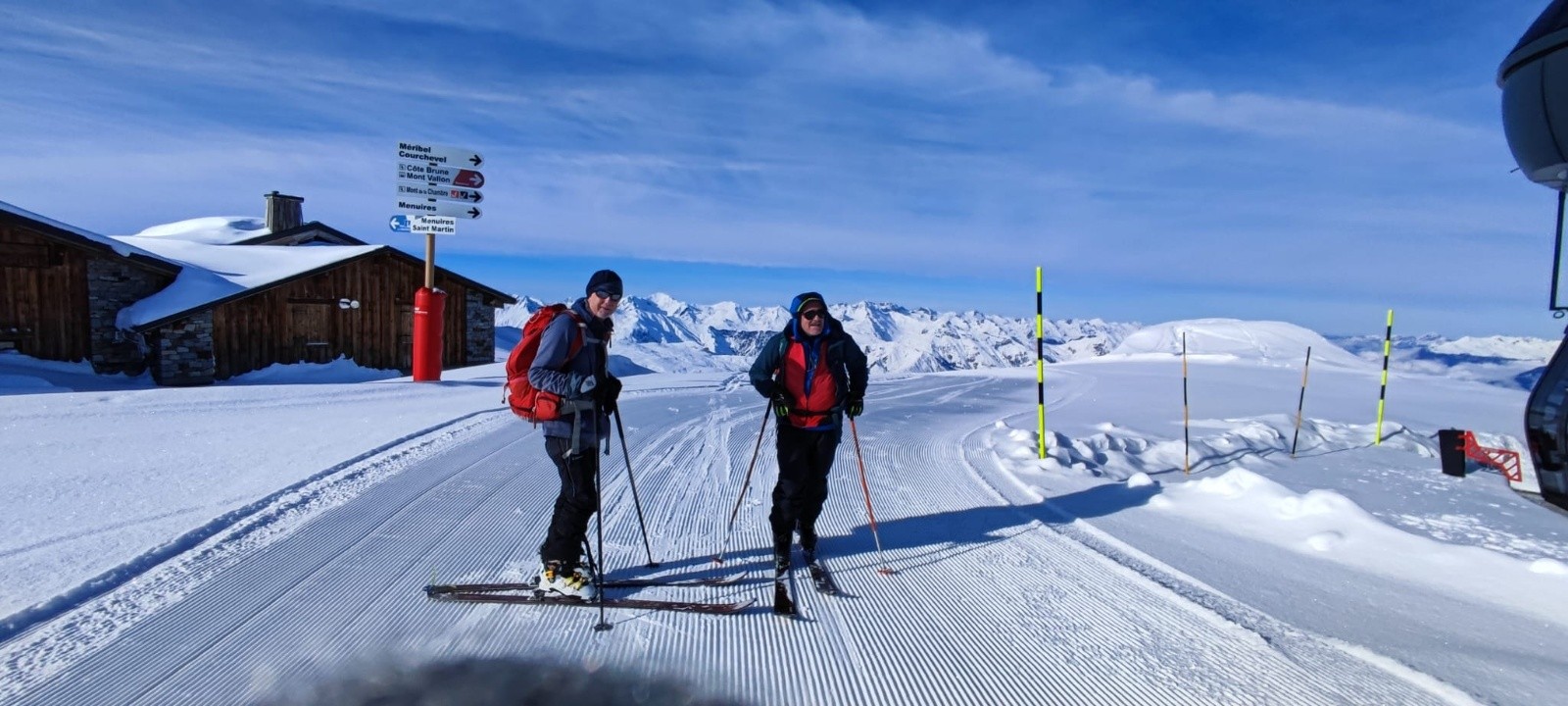 Récit : Direction Méribel Mottaret pour profiter des pistes avant l'ouverture de la station le weekend prochain. Pas très froid (-4° au départ ), personne sur le parcours à l'exception de quelques pisteurs qui sécurisent les pistes et une personne en mode "Ski Rando express" qui nous double en mode avion et que nous recroiserons encore 2 fois. Les pistes sont damées mais ne sont pas du tout gelées, du coup bonne accroche, aucun recul et la longu....e montée se fait sans soucis jusqu'au départ du télésiège du Bouquetin. Nous gardons les peaux pour rejoindre l'intermédiaire plan des mains et attaquons la montée de Cote Brune toujours sur les pistes pour rejoindre le Mont de la Chambre. Montée raide, un peu mode glacière car tout à l'ombre mais au sommet nous retrouvons le soleil. Personne à l'exception de quelques Skieurs au loin qui viennent des Menuires ou Val Thorens, c'est vrai que c'est beaucoup plus rapide par ce versant.😉