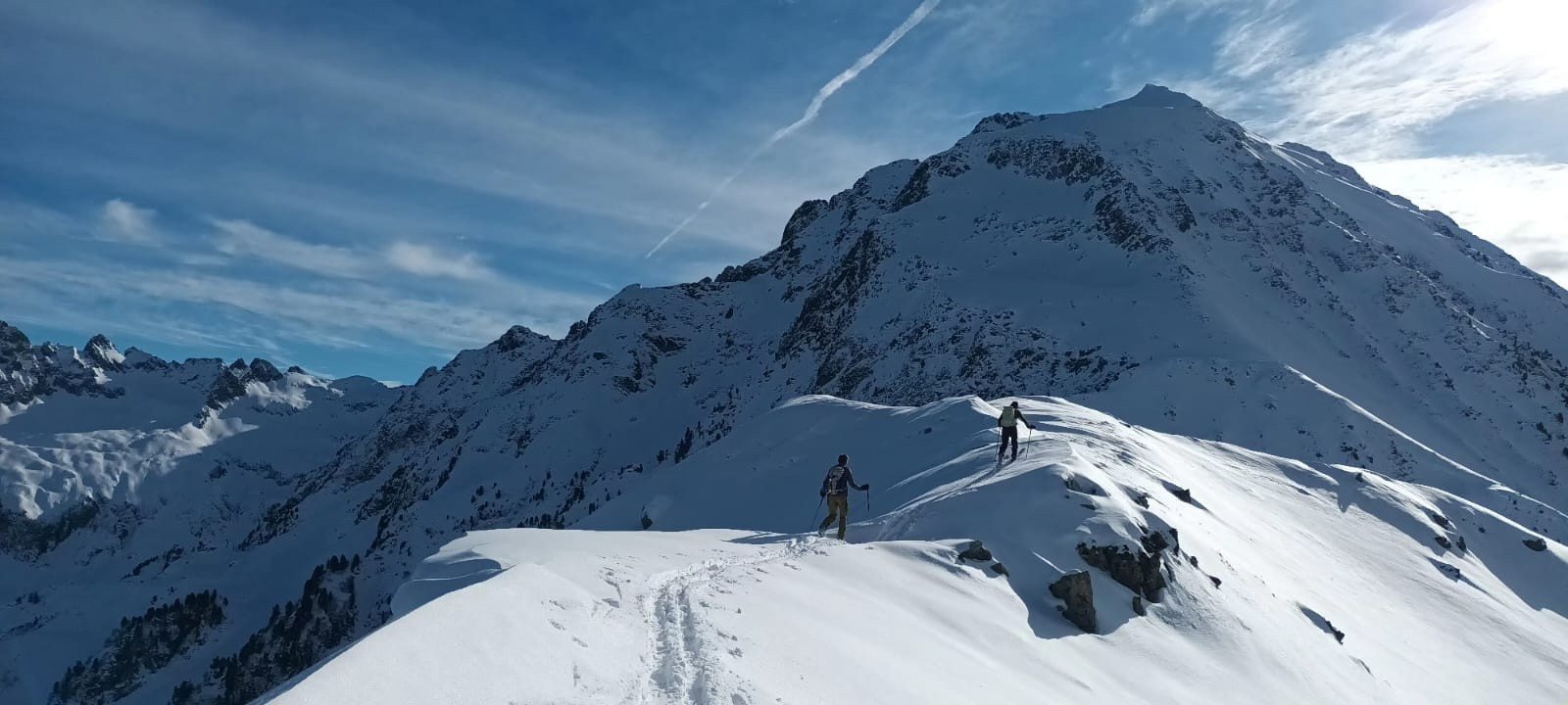 nous sommes montés sur l arête depuis le col de Clarens où nous avons rapidement dû enlever les skis il y avait déjà quelques marches mais nous nous enfoncions beaucoup quand même