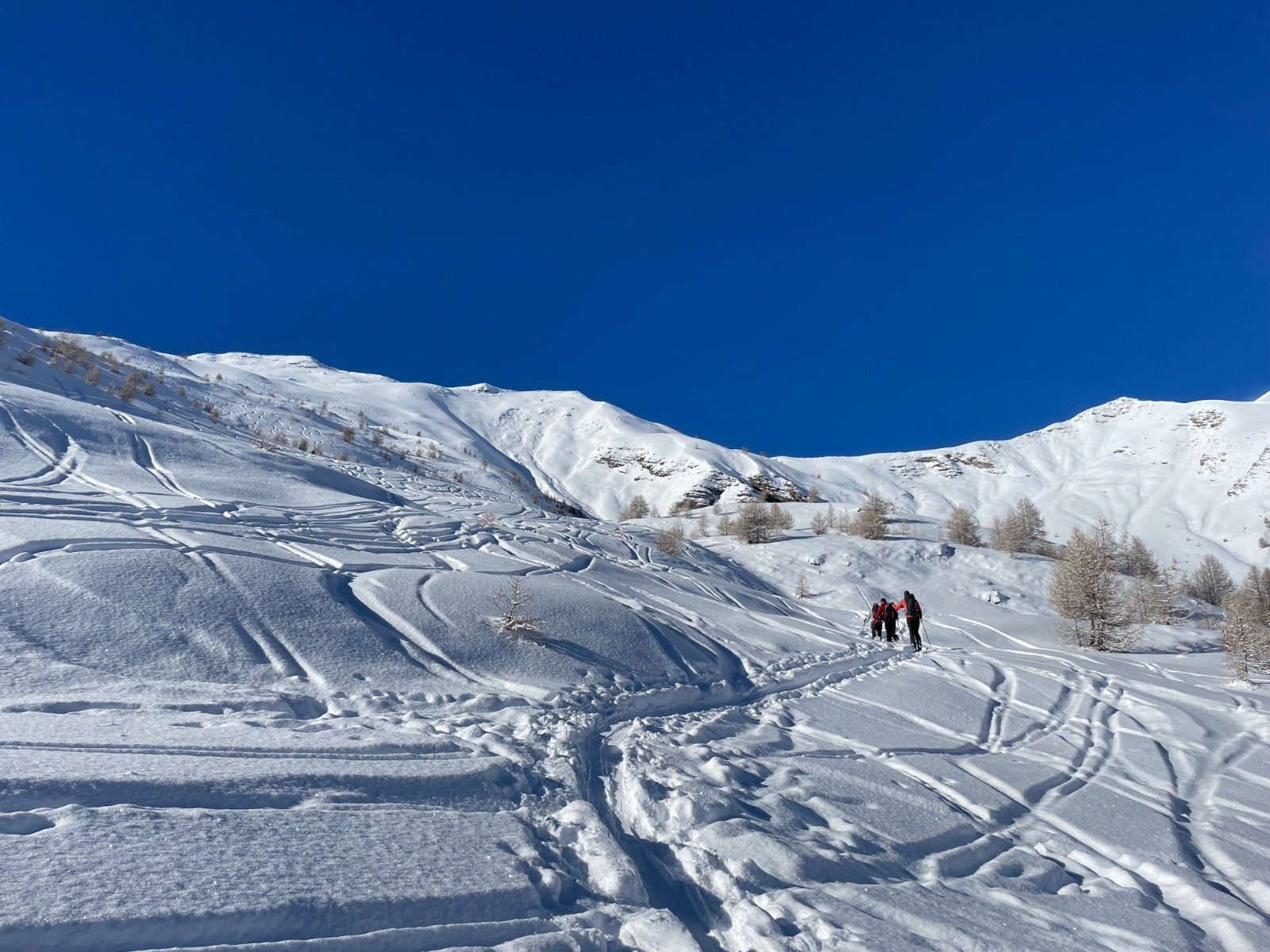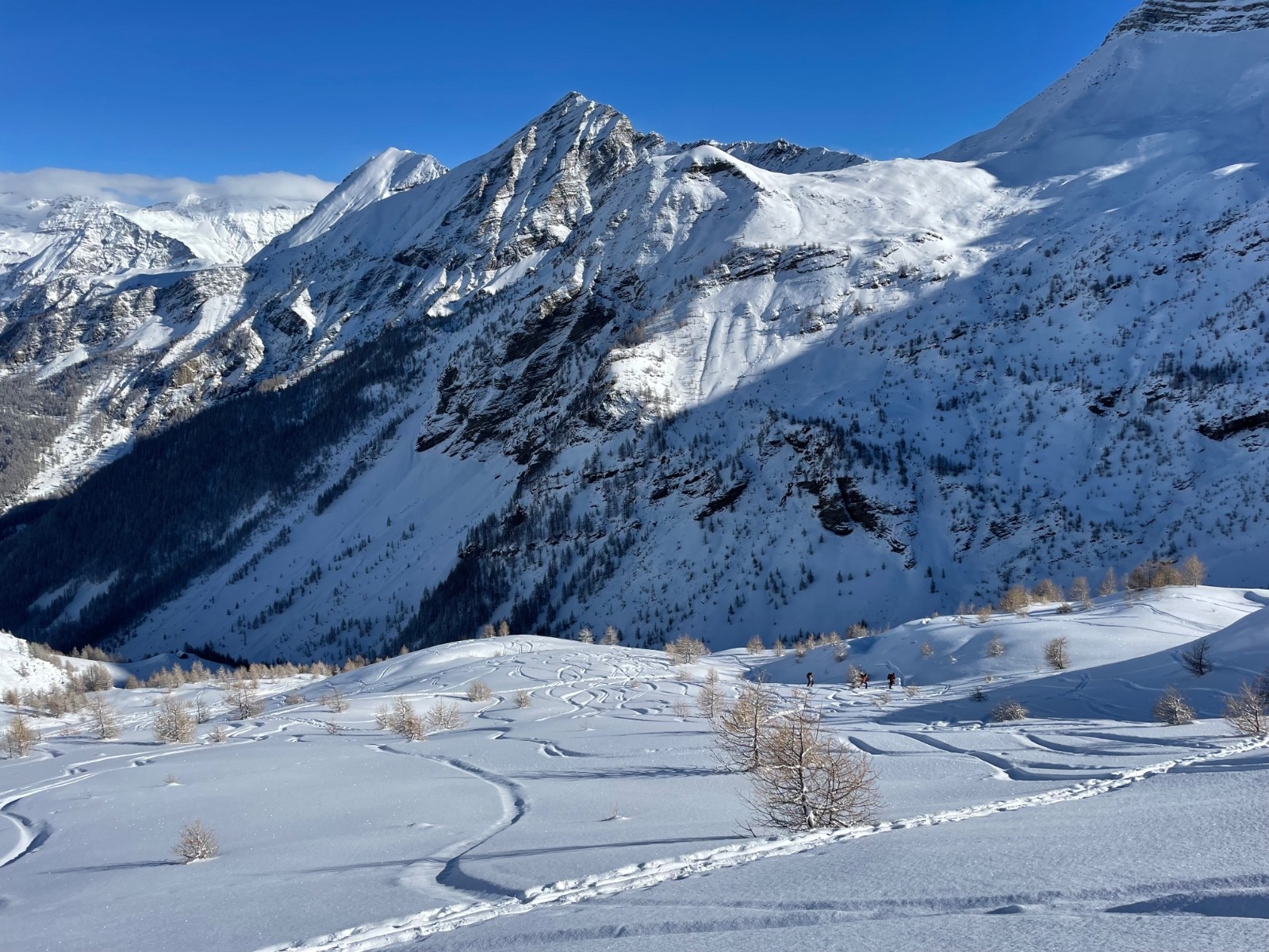 Belle neige tout du long mais l’absence de sous couche rend le fond du vallon hasardeux pour les carres…