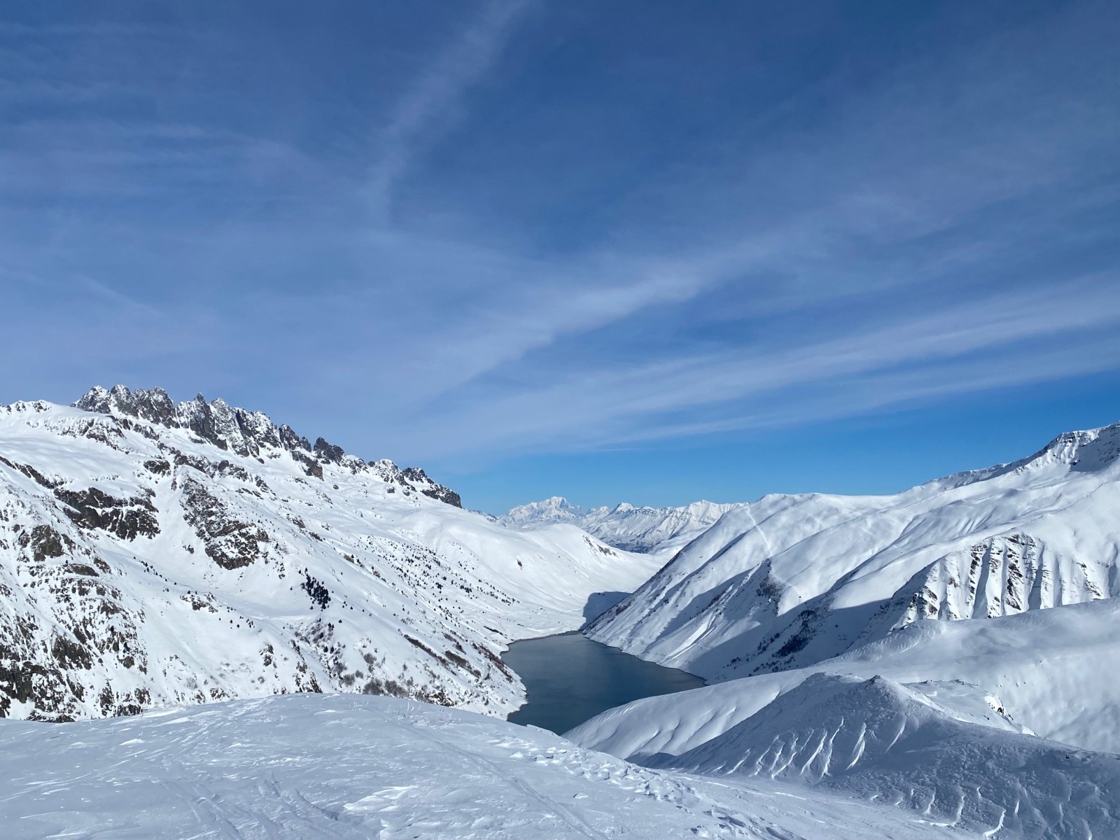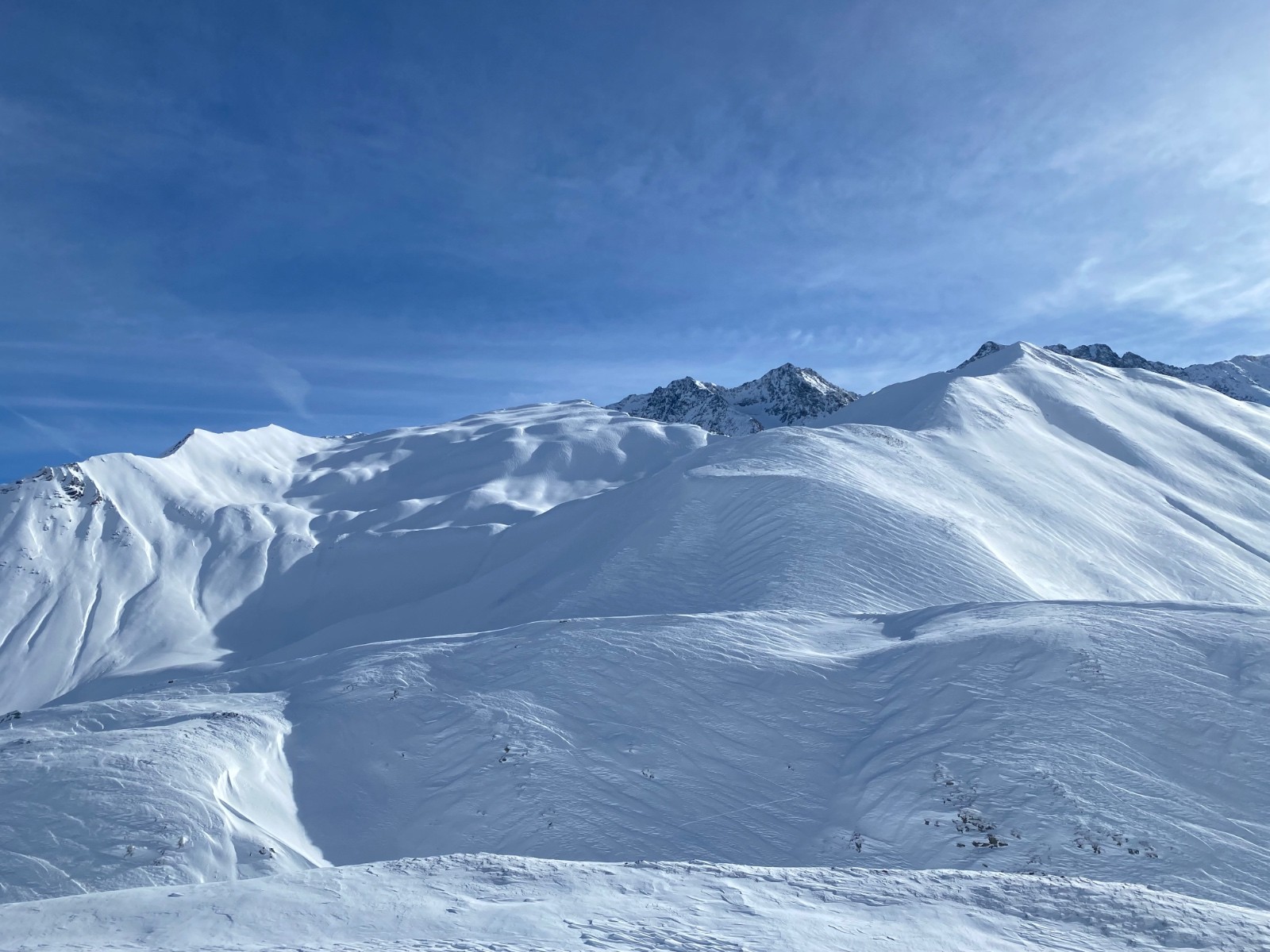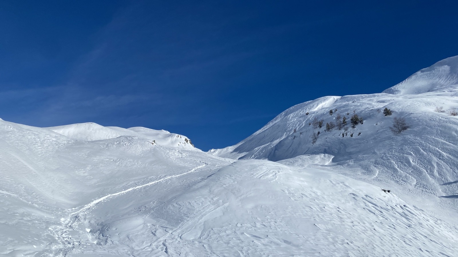 Belle ambiance dans le vallon bien enneigé : ciel bleu magnifique, soleil 🌞 et petite poudreuse de la nuit