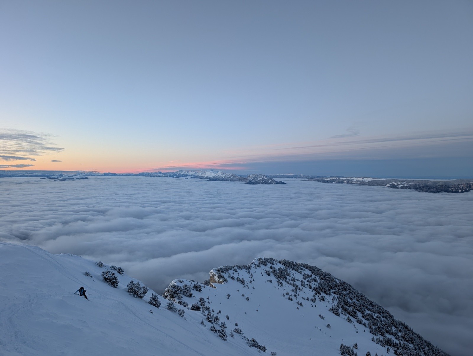 Conditions pour le ski : Bonne, tout passe bien sans toucher jusqu'en bas. Le haut est assez soufflé et laisse apparaitre les cailloux, prudence ou ne pas viser jusqu'en haut. On a longé les roches main droite au dessus des paravalanches pour trouver plus de cumul, là ca ne touchait pas...