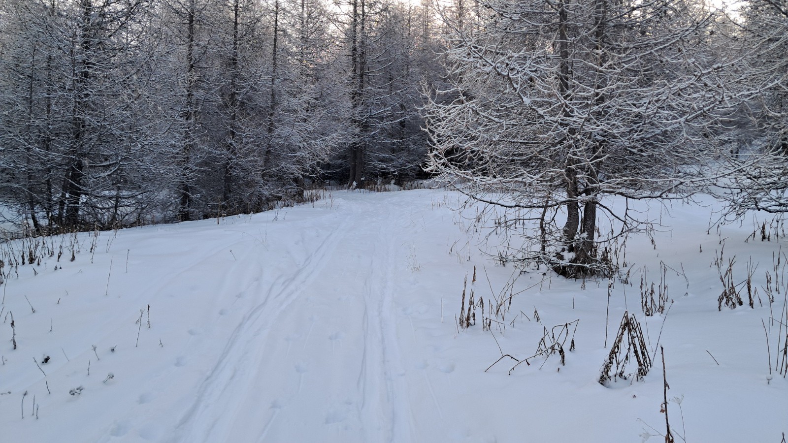 je me décide d'aller voir coté Vallon du Longet les conditions d'enneigement. En Arrivant au parking de Lariane 10 à 15cm de neige recouvre le sol ? petites et courtes éclaircies. un bref rayon de soleil ...alors j'y crois !! la couche de neige épaissie en montant pour finalement atteindre 50 à 60cm. <=20cm de poudre un peu dense posés sur neige sans cohésion. les bâtons s'enfoncent profond à chaque appui. Le ciel se bâche de + en + , faible chute de neige ; soit un petit cocktail donnant un jour blanc rendant le ski délicat . La forêt retrouvée je me lâche un peu pour enfin du bon ski *** à ****. Finalement agréablement surpris à l'arrivée des conditions d'enneigement .