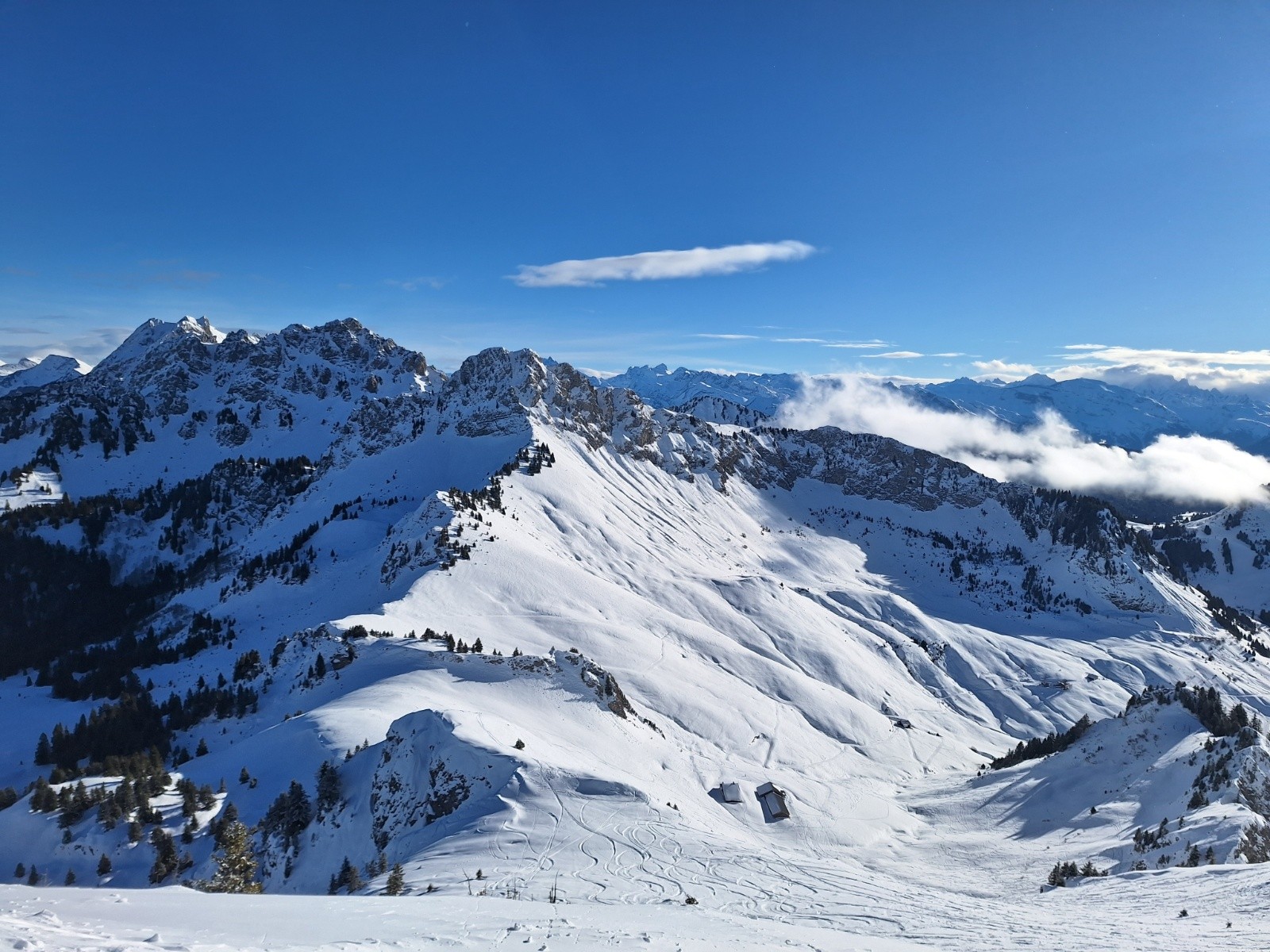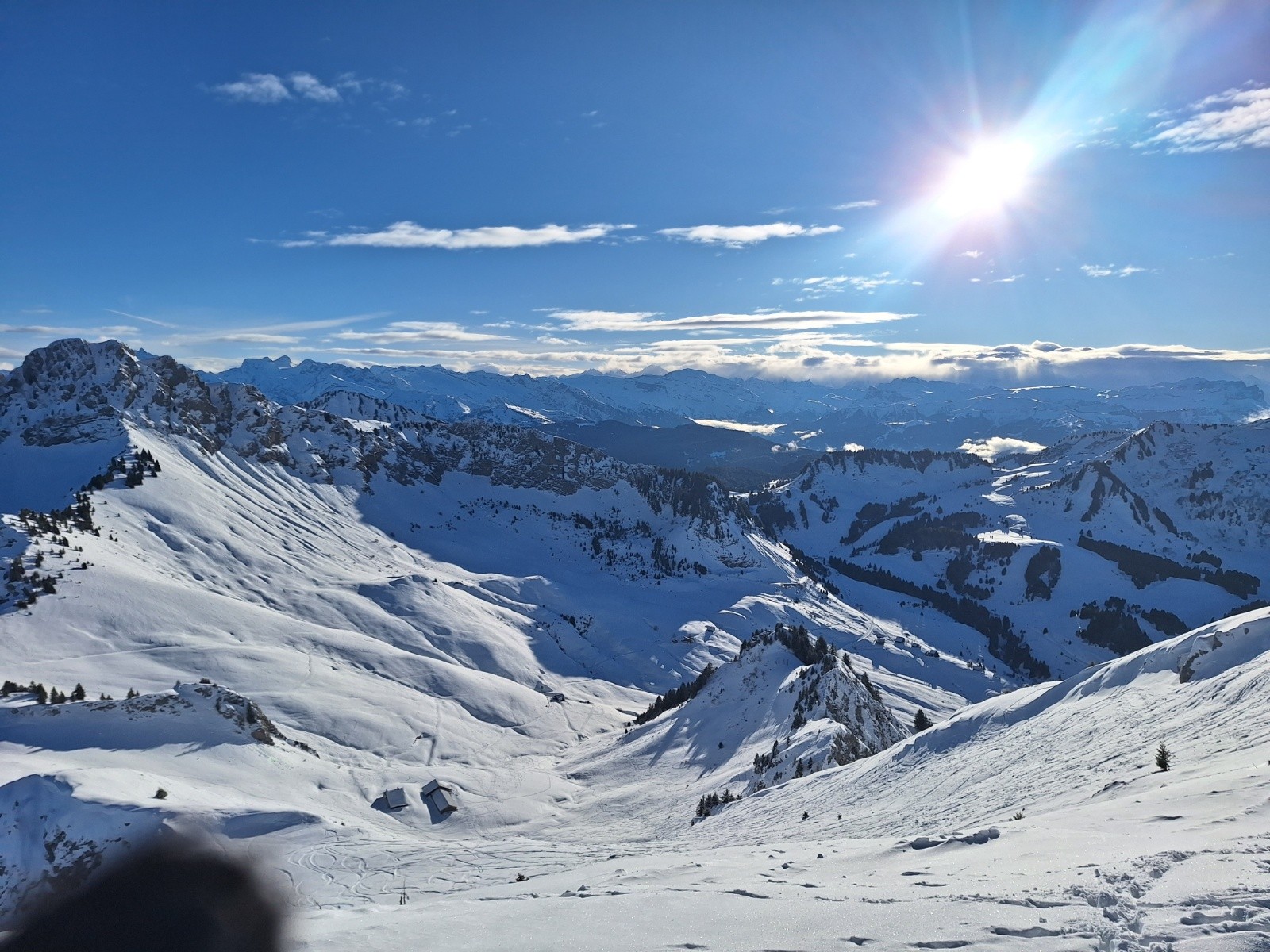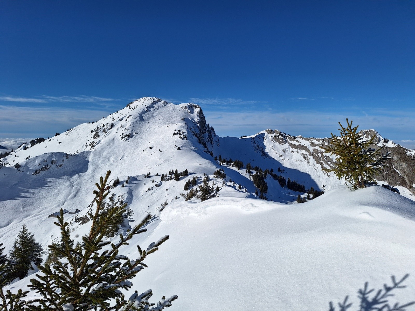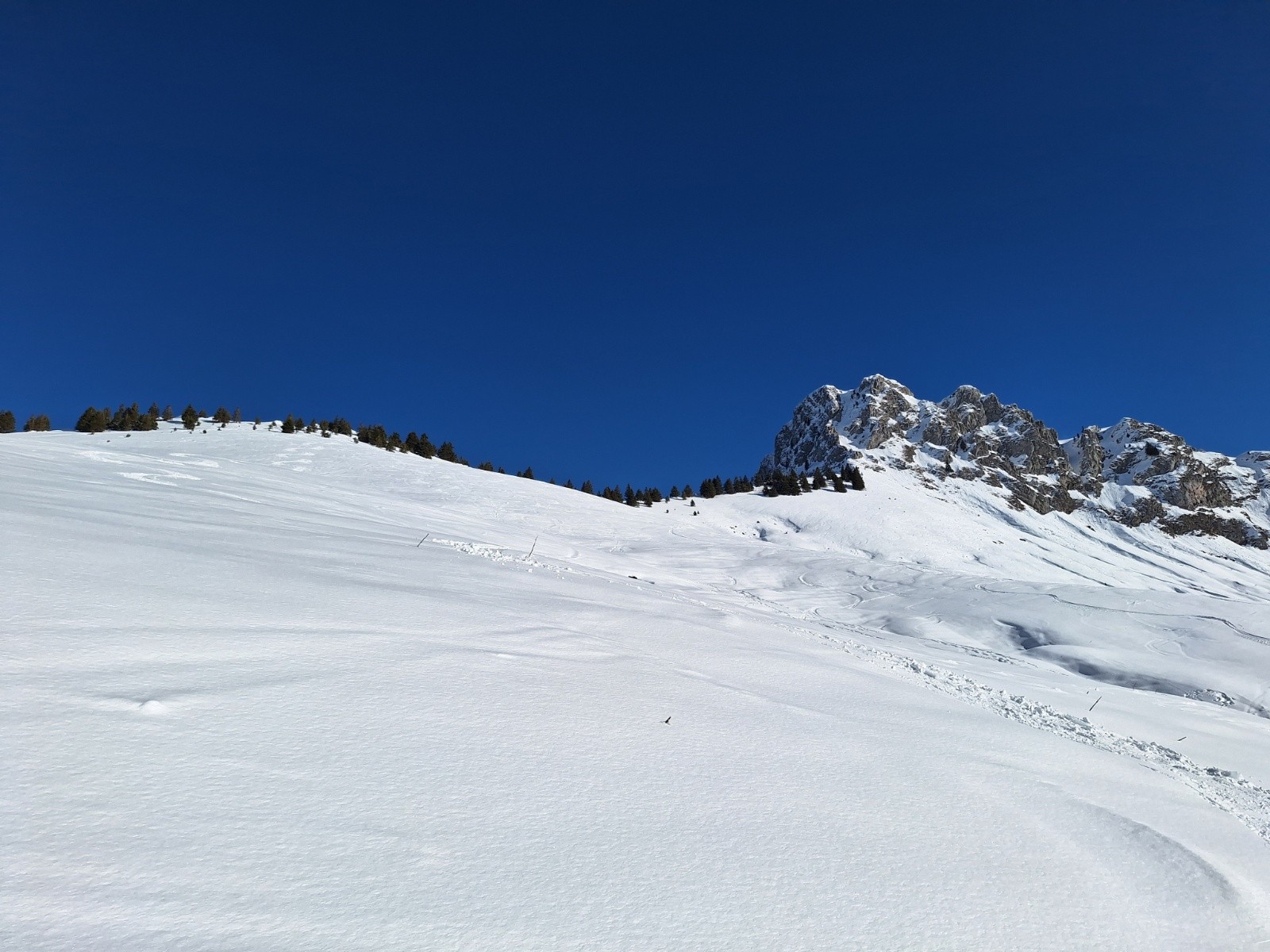 Comme le soleil semble déjà cogner, je veux aller voir ce qu'il en est à l'ombre. Je reste donc bien main gauche et descend par la crête... ce qui me permettra de baptiser mes nouveaux skis sur un requin sournois... rien de critique... et puis c'est toujours la 1ère rayure qui fait le plus mal 😅