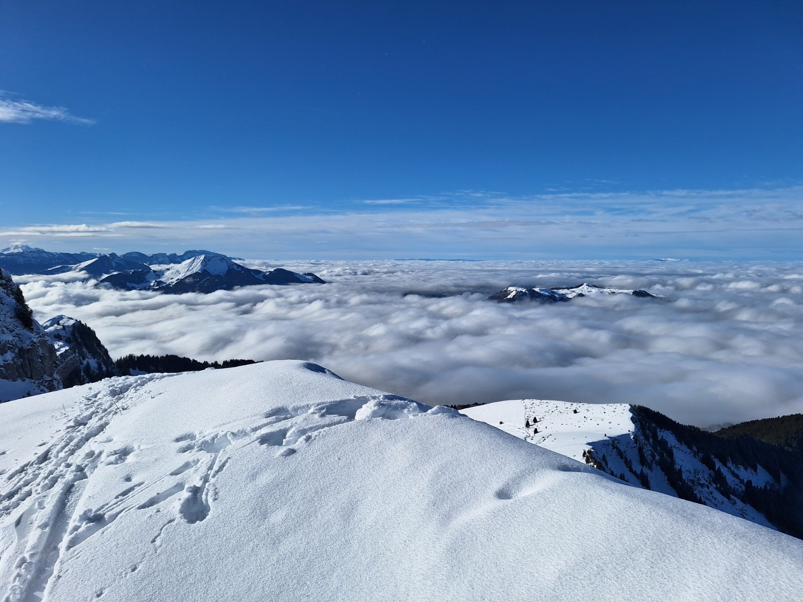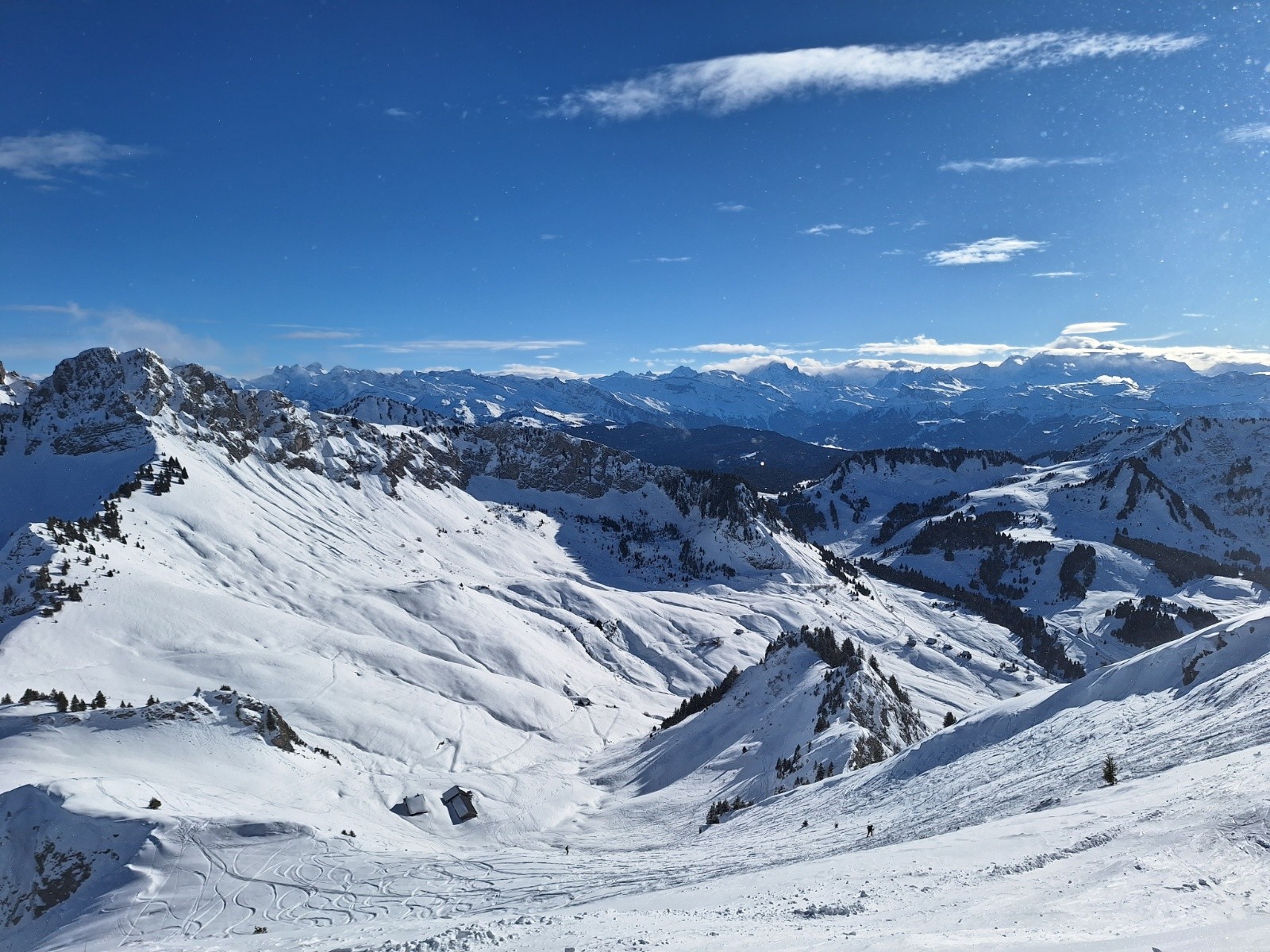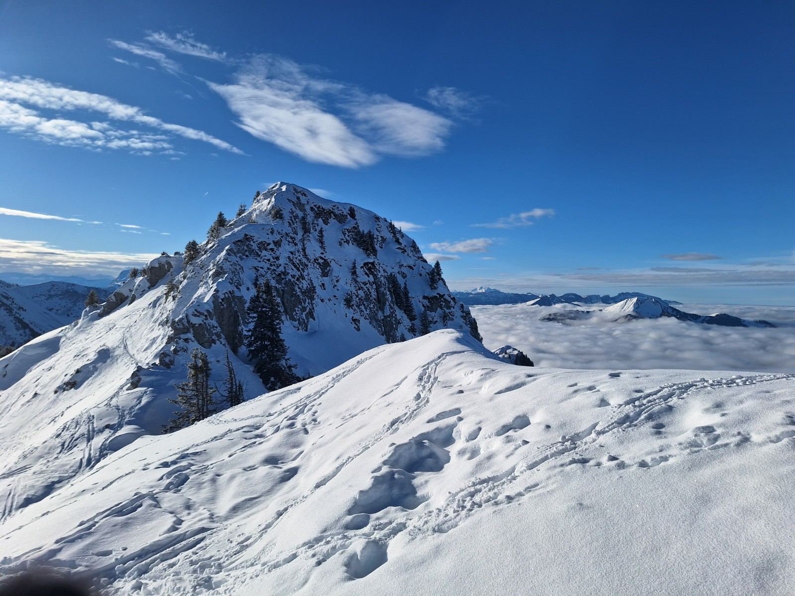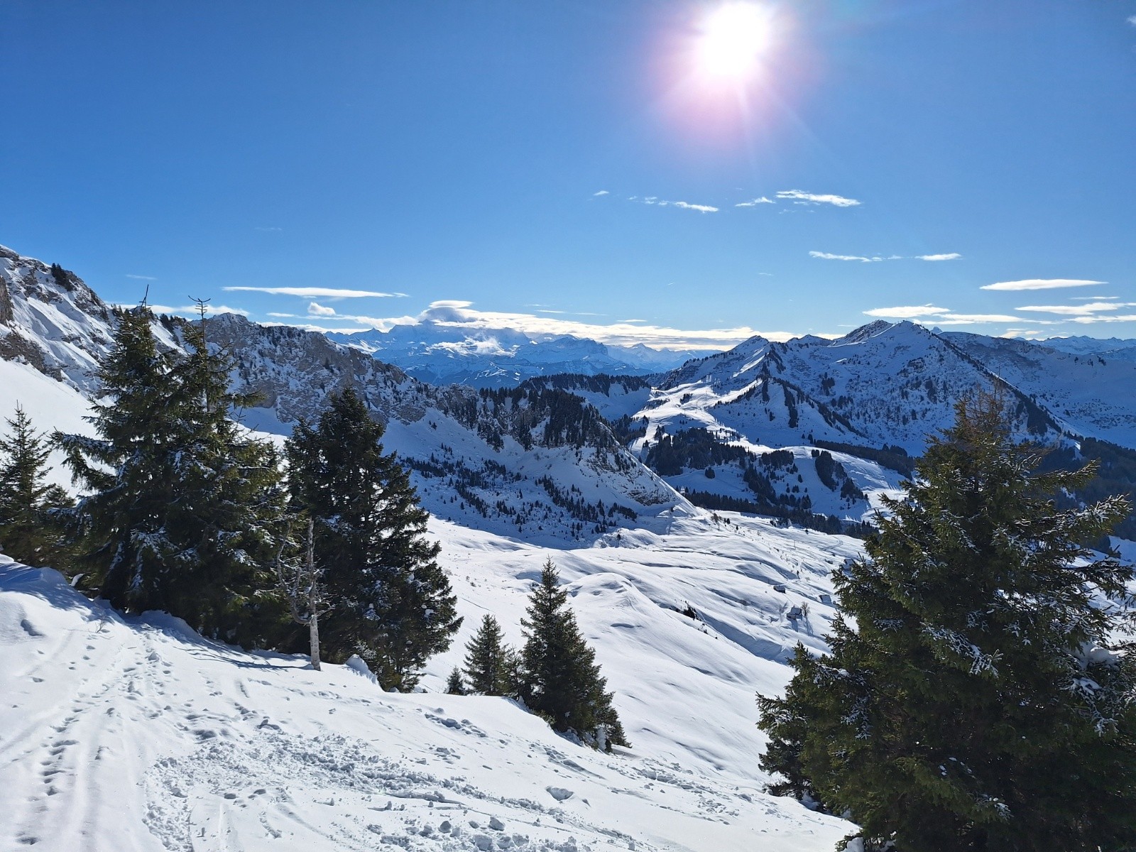 Comme le soleil semble déjà cogner, je veux aller voir ce qu'il en est à l'ombre. Je reste donc bien main gauche et descend par la crête... ce qui me permettra de baptiser mes nouveaux skis sur un requin sournois... rien de critique... et puis c'est toujours la 1ère rayure qui fait le plus mal 😅