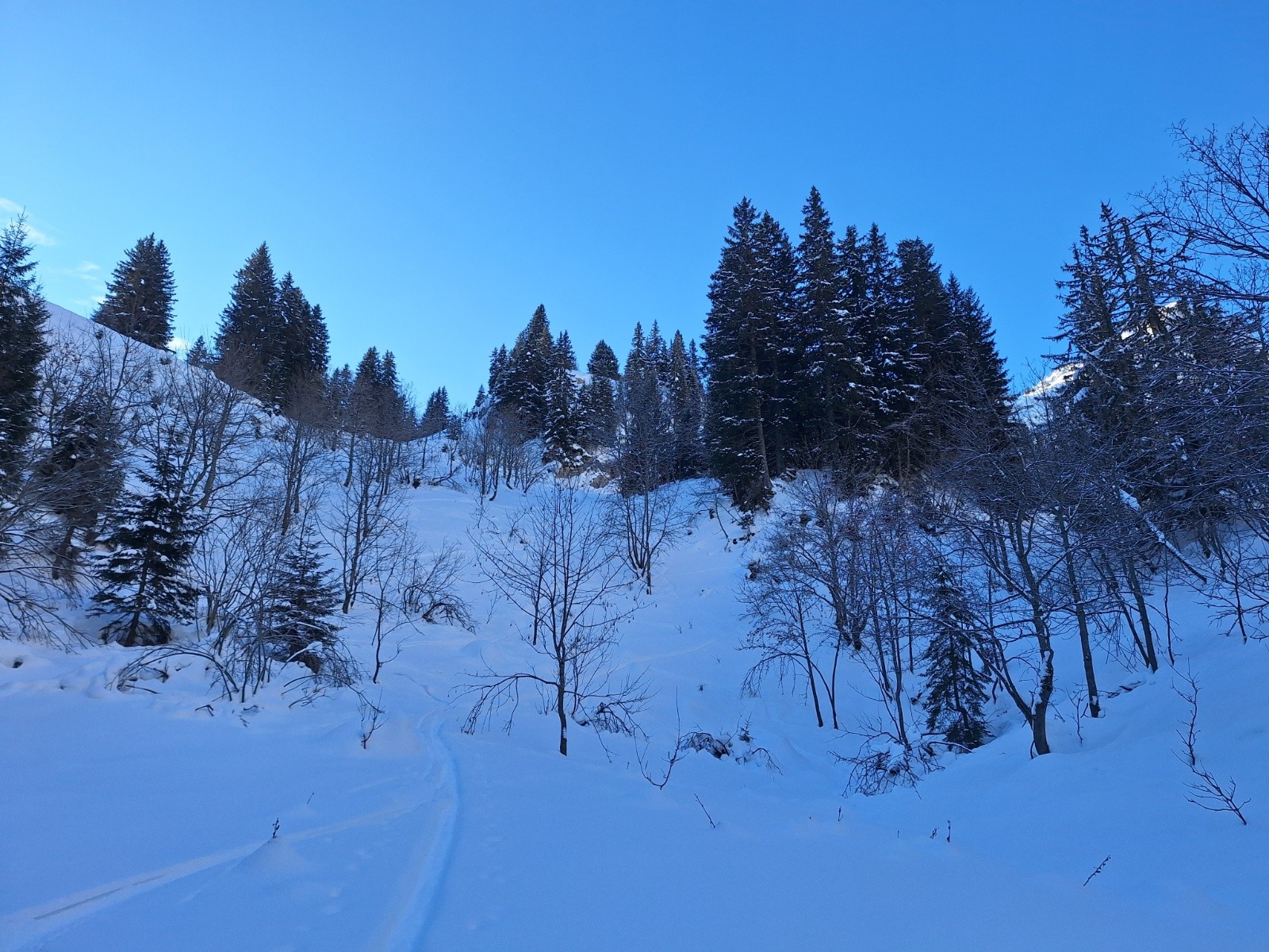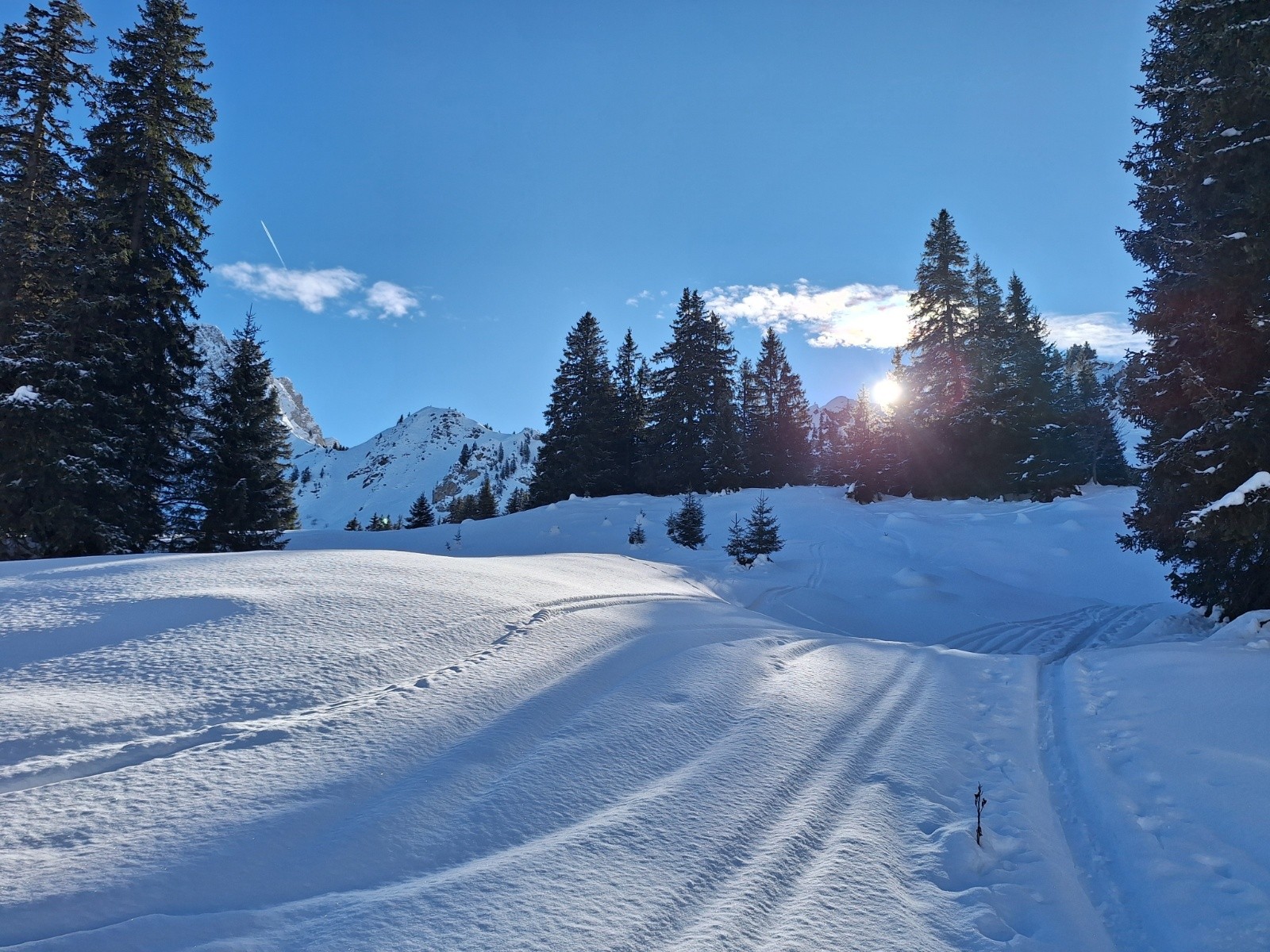 J'arrive pourtant dans les 1ers au parking. Je prends la piste de fond, direction Chalune, puis plus les mètres passent, plus je trouve ça long au regard du timing que j'ai... Chalune, ça reste quand même pas mal de traversées 😁 du coup, dans un souci d'optimisation, je mets le cligno à gauche et pars rejoindre le chemin qui mène au chalet de Chavan.
