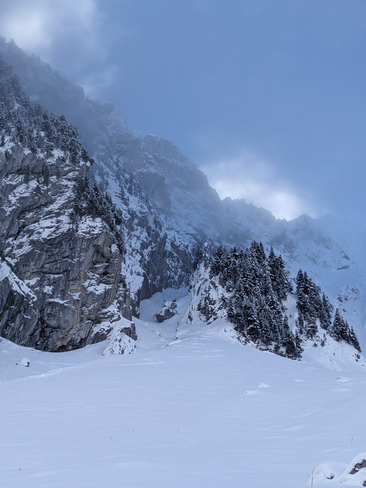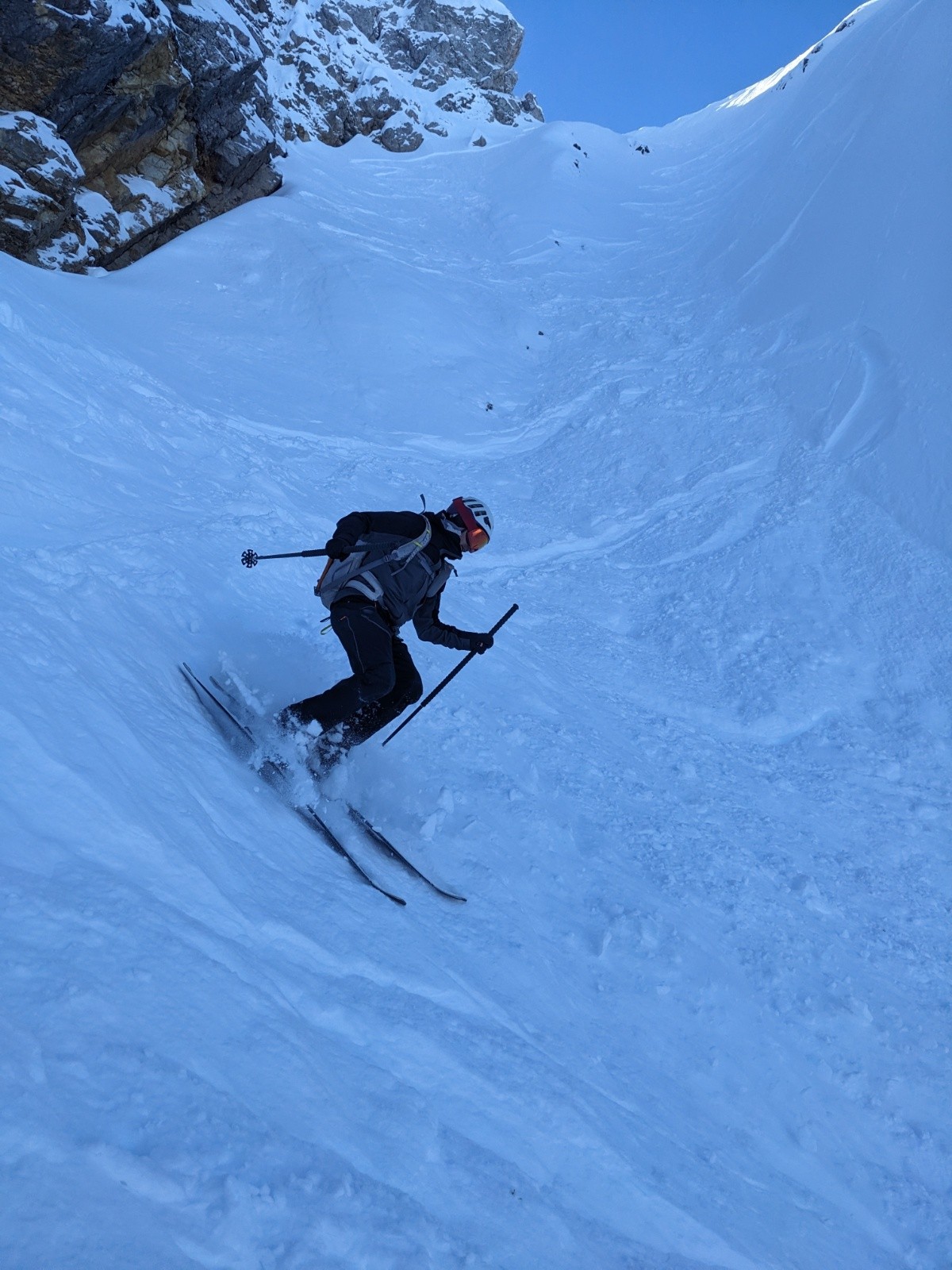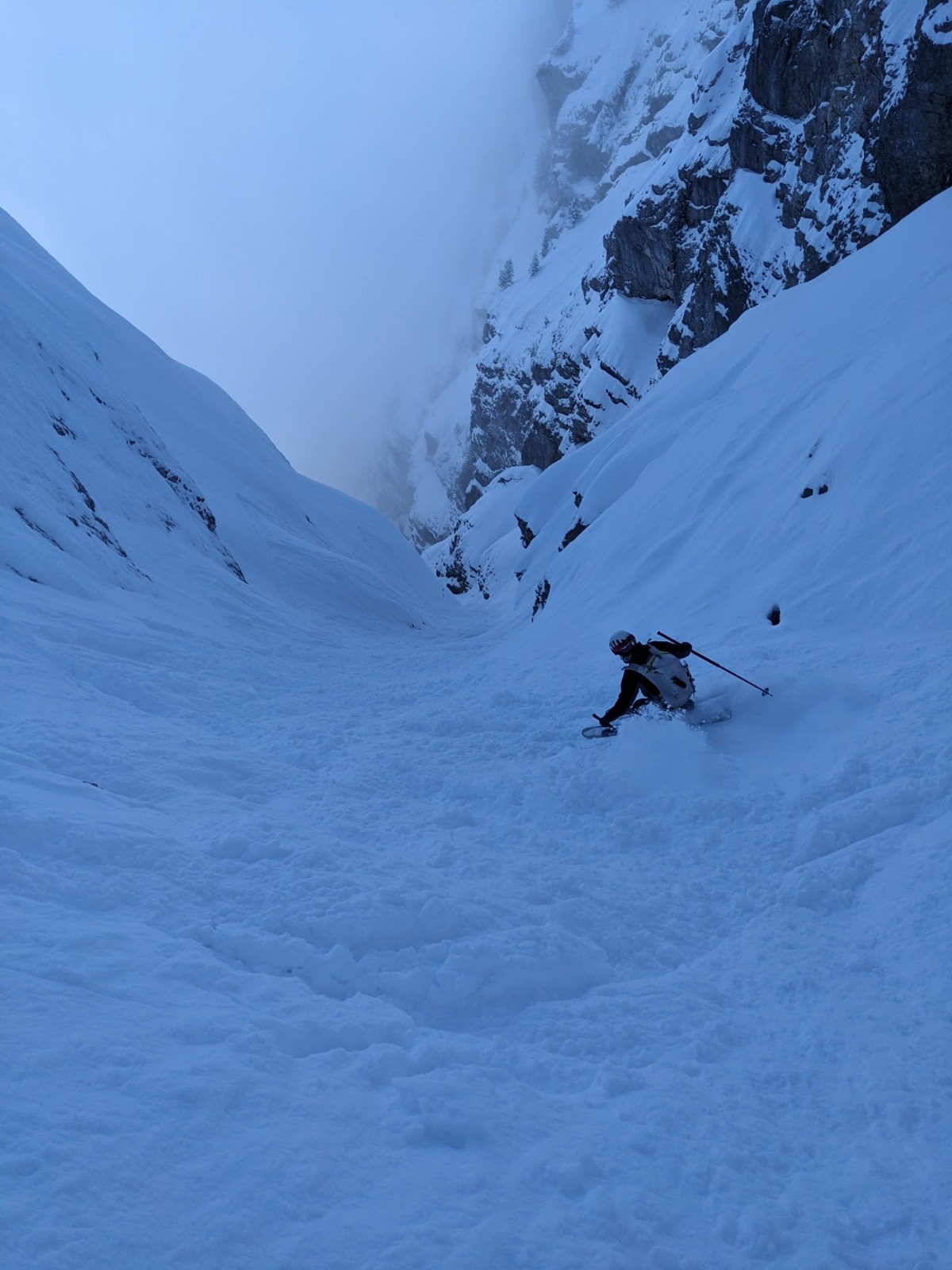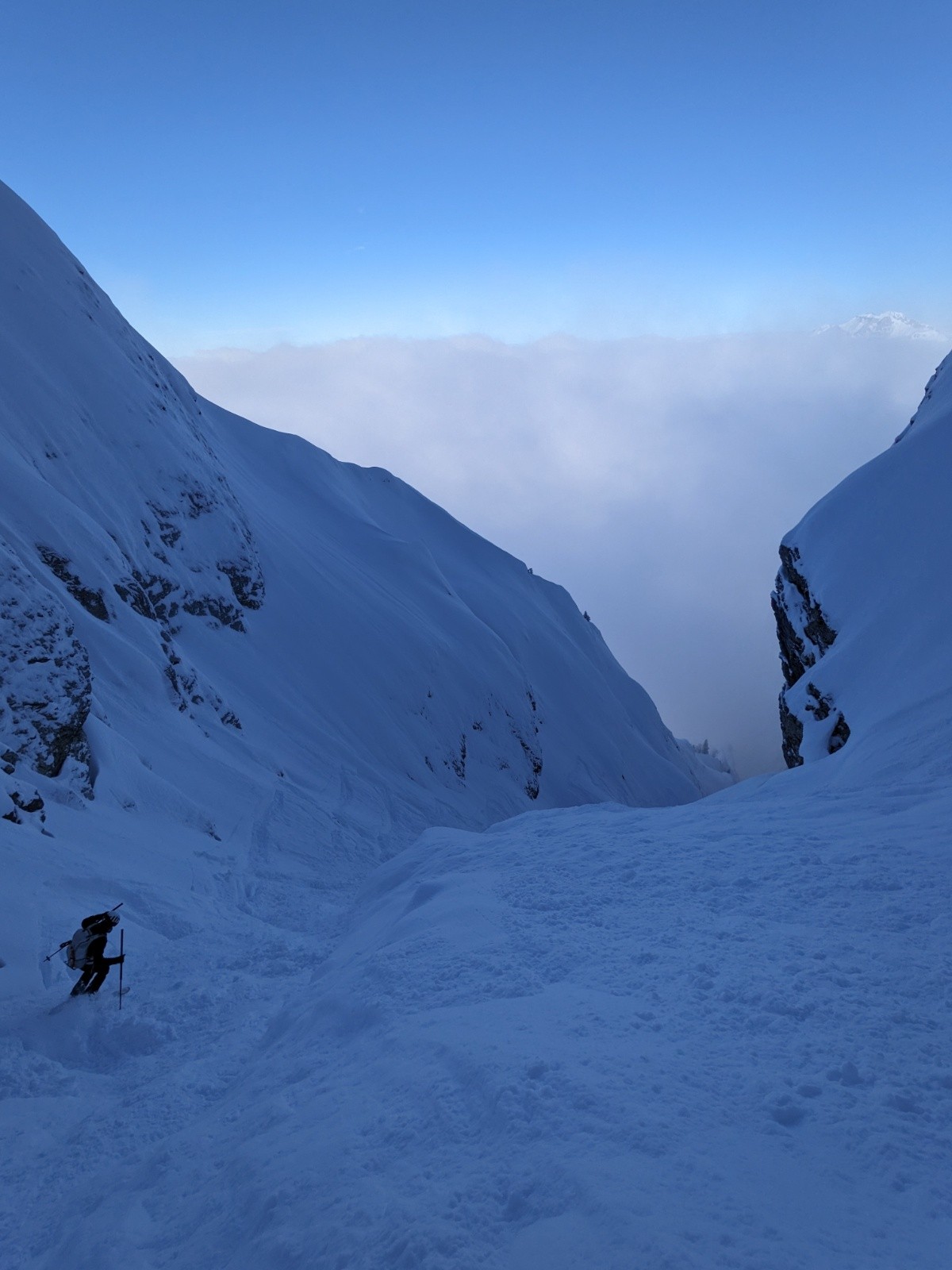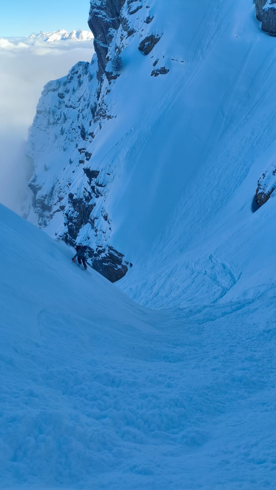 Le couloir est en bon condition, poudre rassurante et belle ambiance avec les nuages. C'est beau et ça deroule bien ! On teste dans le couloir jusqu'au bout.