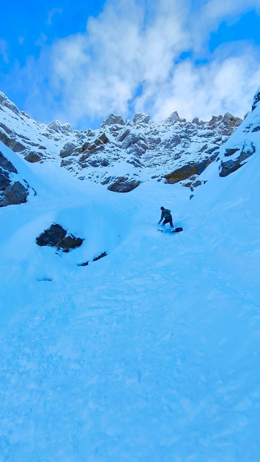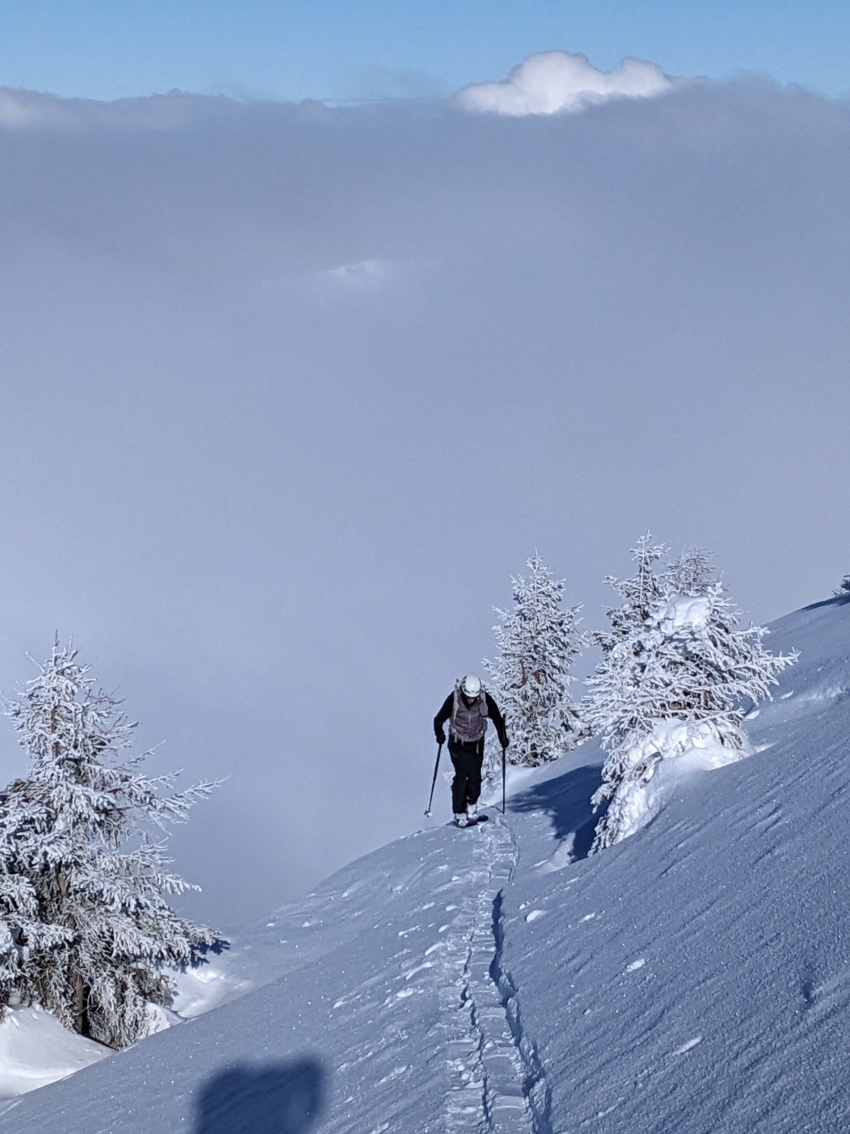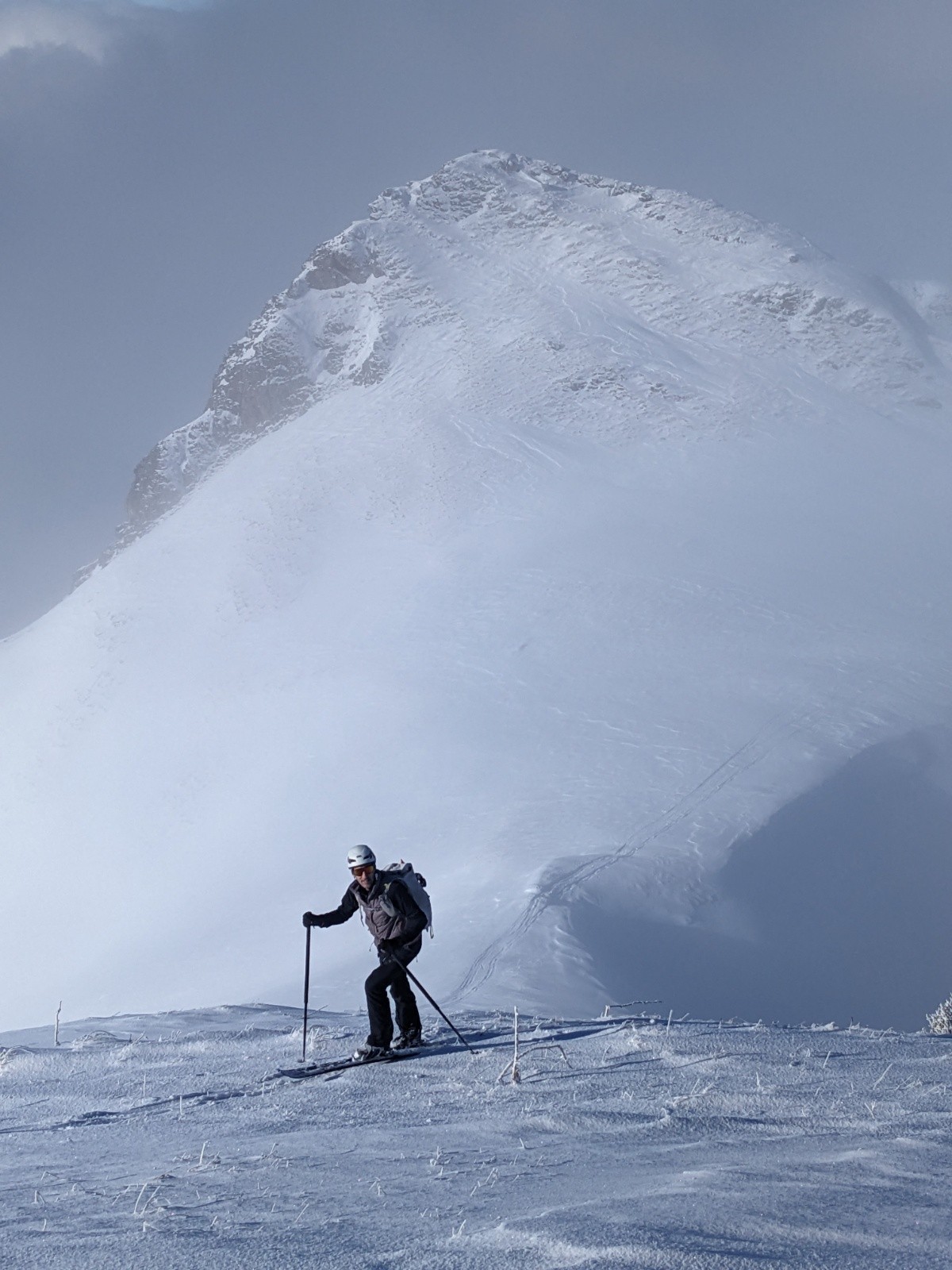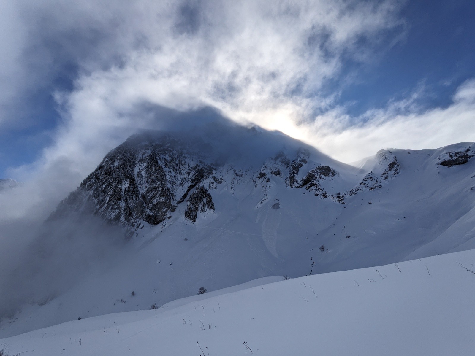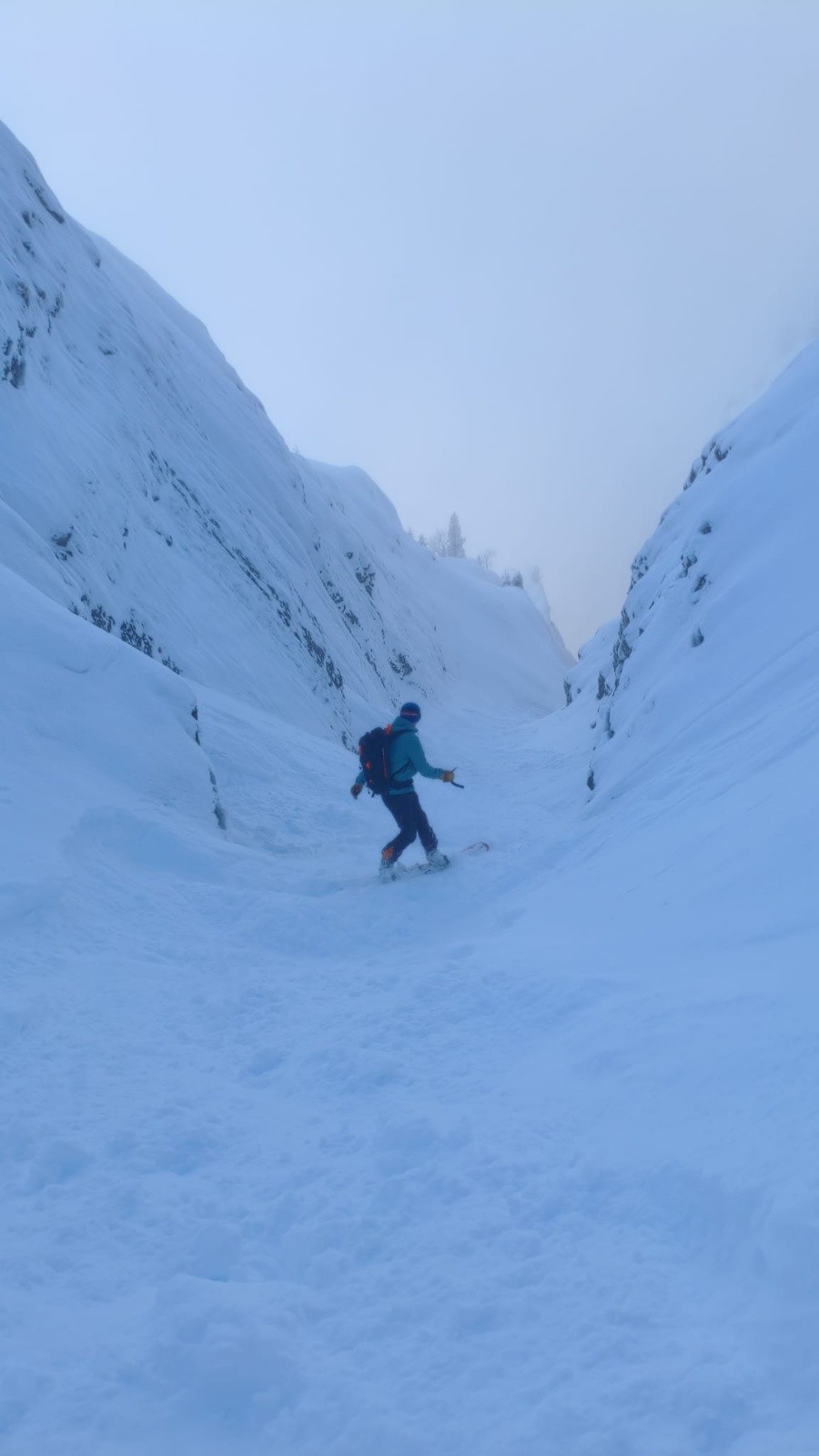 Le couloir est en bon condition, poudre rassurante et belle ambiance avec les nuages. C'est beau et ça deroule bien ! On teste dans le couloir jusqu'au bout.