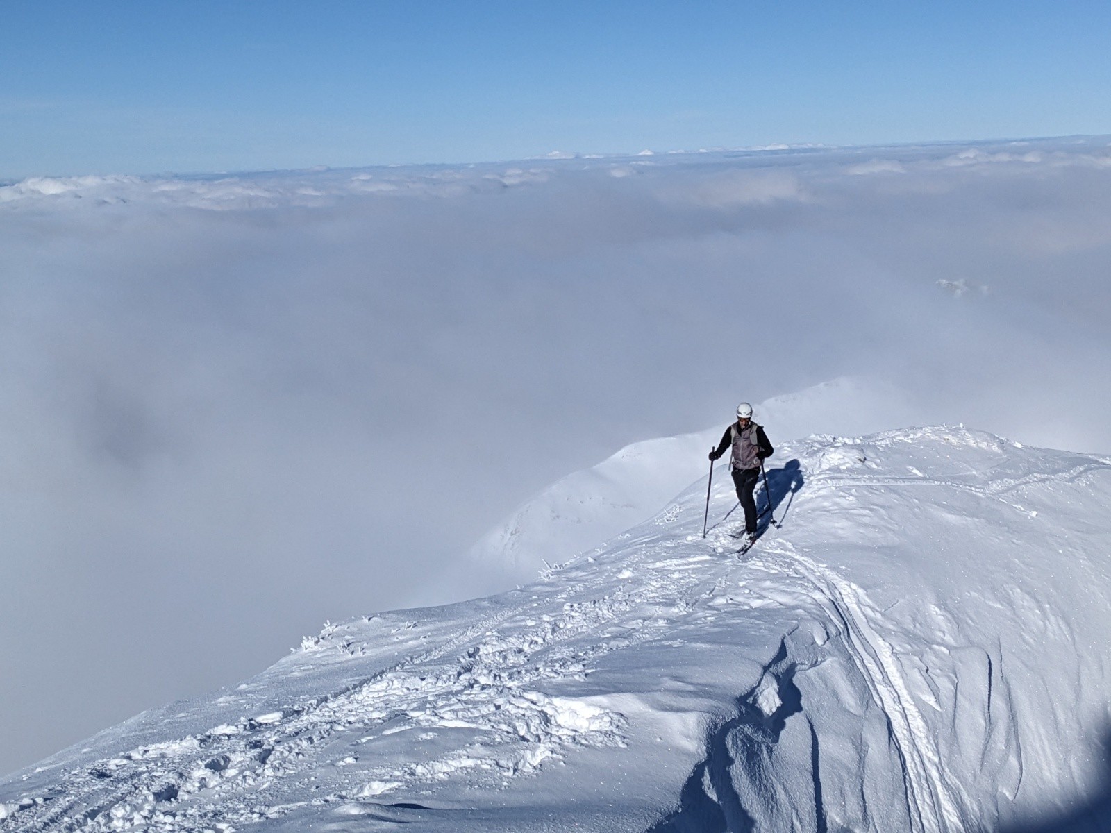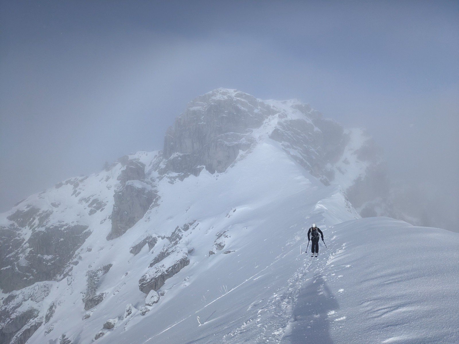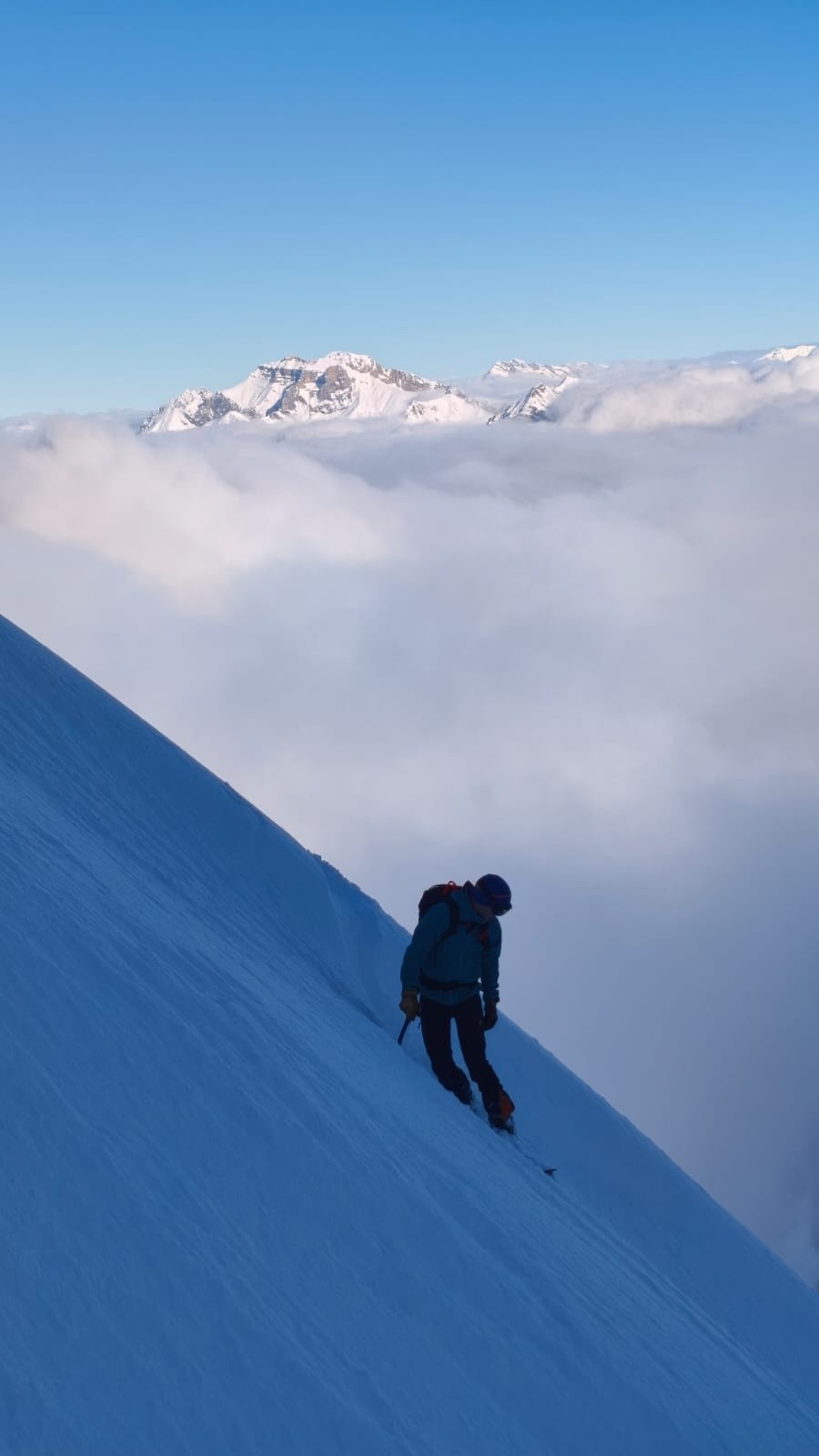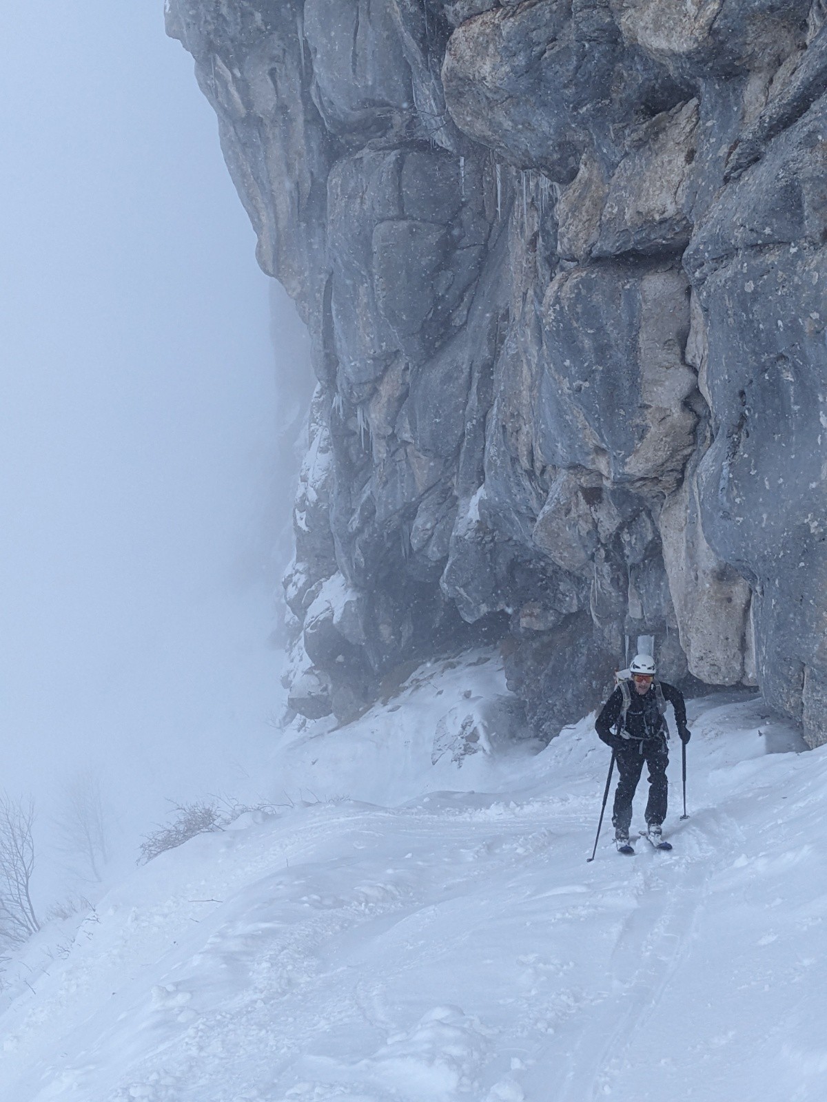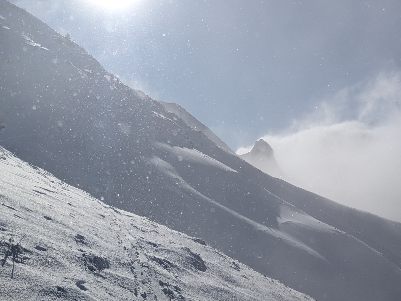 Le couloir est en bon condition, poudre rassurante et belle ambiance avec les nuages. C'est beau et ça deroule bien ! On teste dans le couloir jusqu'au bout.