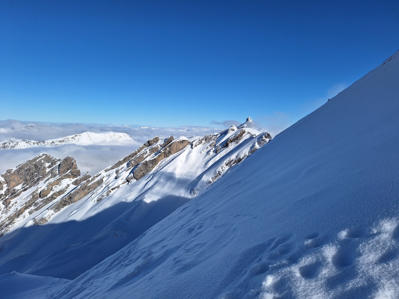Retour vers les sommets, et notamment celui de Tête Pelouse. Je pars au traçage puis au retraçage jusqu'au sommet de la combe qu'on atteint sans encombres. L'heure a malheureusement tourné plus vite que prévu, il ne me reste plus tant de marge 😬