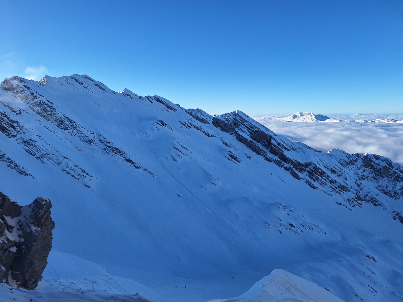 Météo/températures : Beau temps au dessus de la mer de nuages posée à 1500m. Bien froid à l'ombre, comme d'habitude dans les combes en hiver!