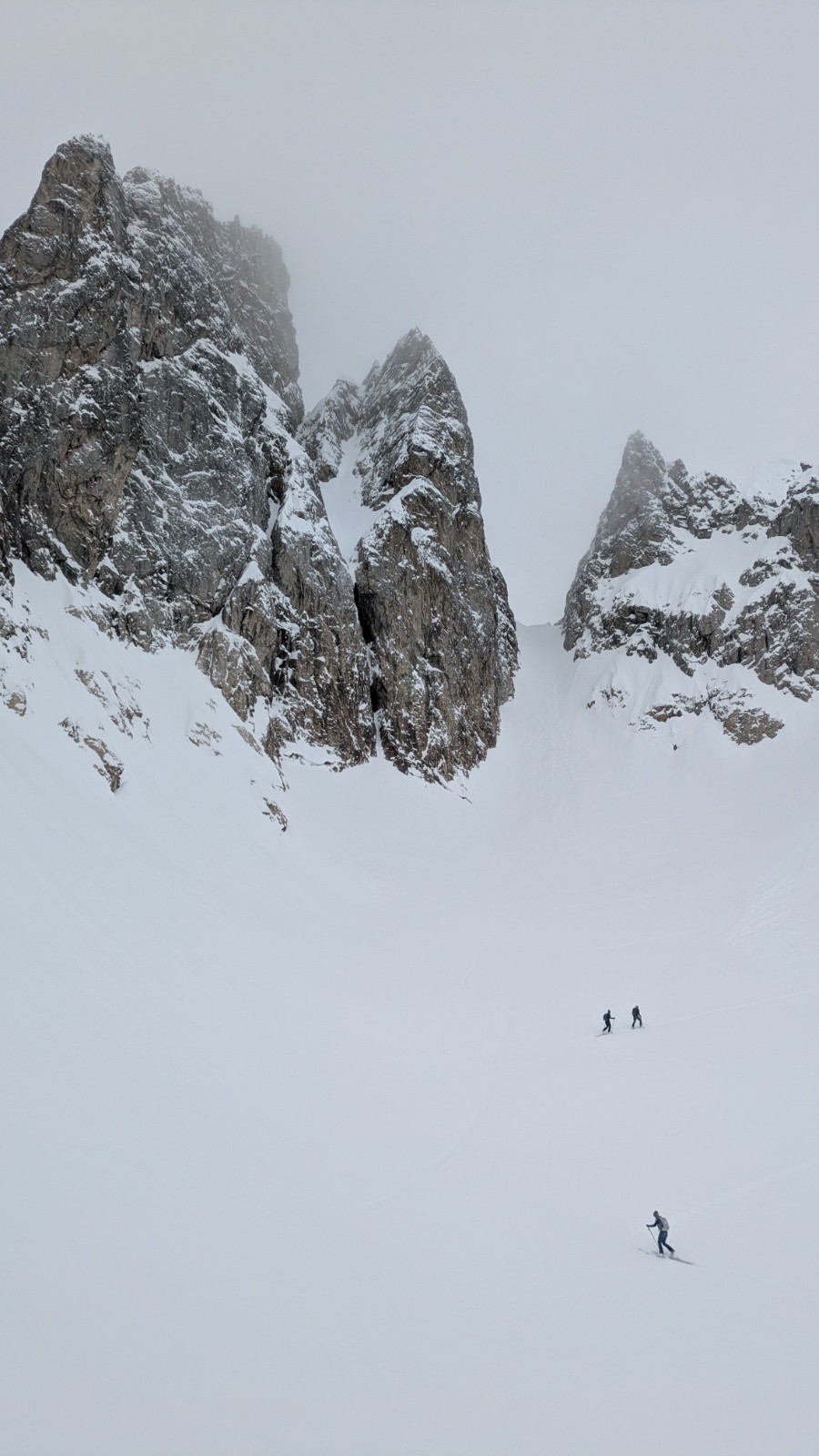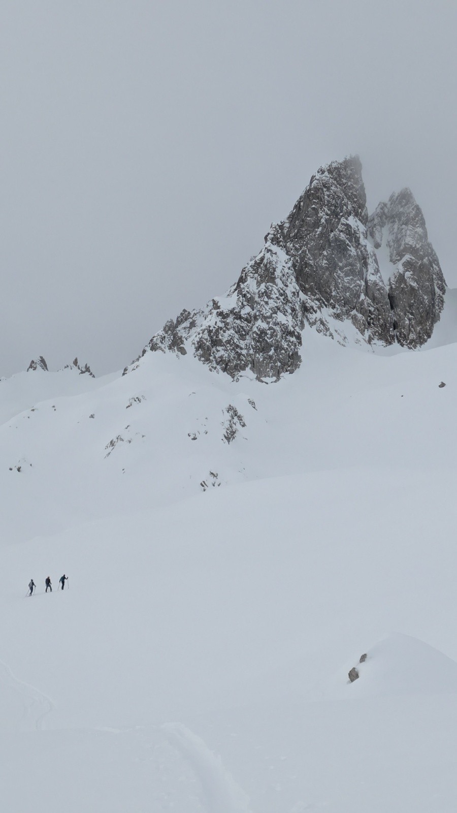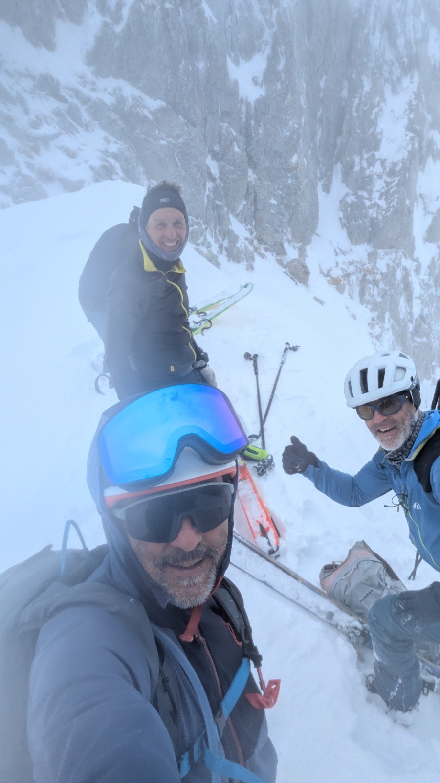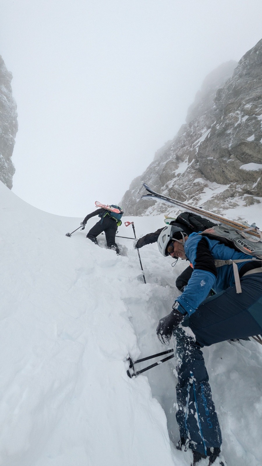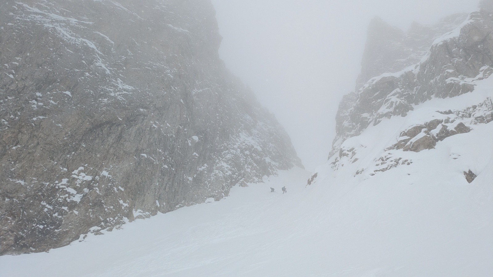 D'autres idées de tricotage en espérant le maintien d'une météo correcte. Bâchage complet une fois au col. Descente dans les traces pour chercher un peu de visibilité