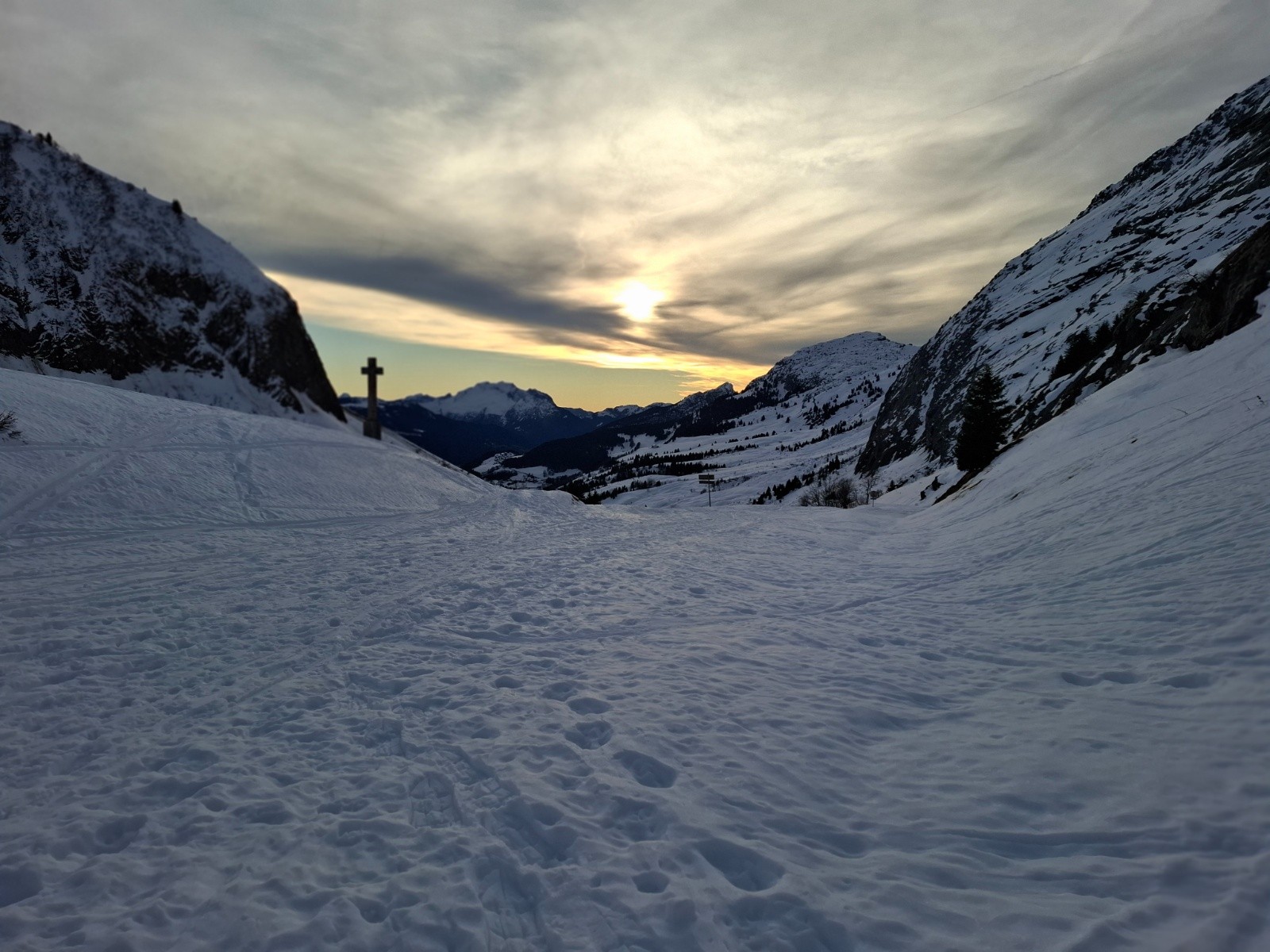 Conditions pour le ski : Médiocres à Moyennes. Neige lourde et trempée au Rasoir (E, SE). Gelée puis croutée sur le haut de Balafrasse (N, NE). Seul le milieu et bas de Balafrasse ainsi que la bas du col de la Colombière toutes en expo (O, SO) étaient très correctes.