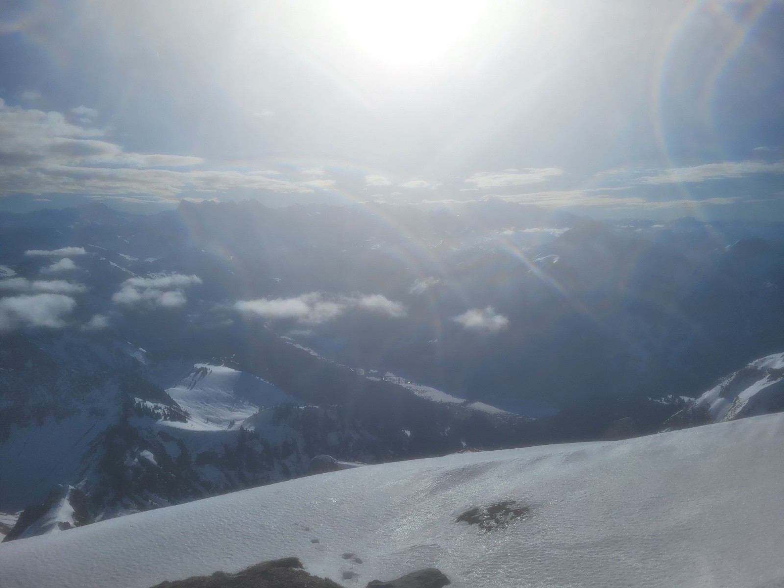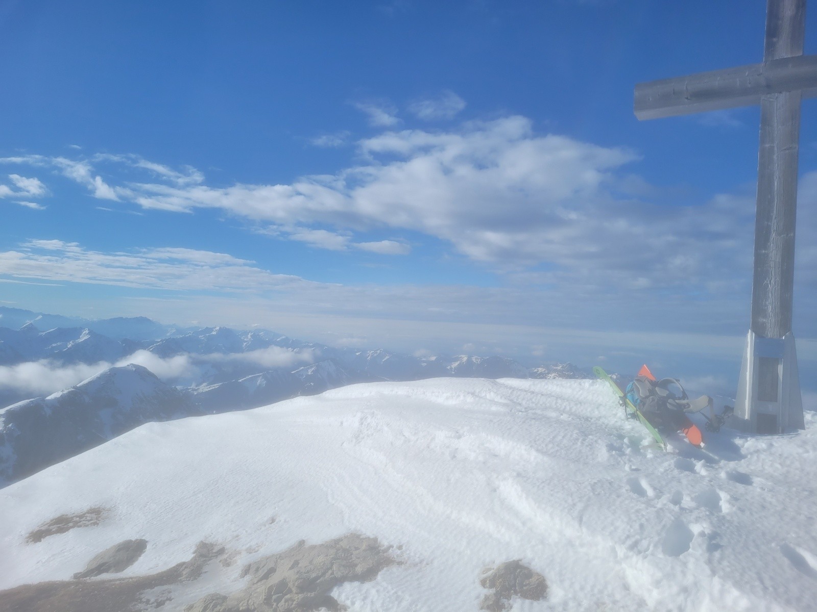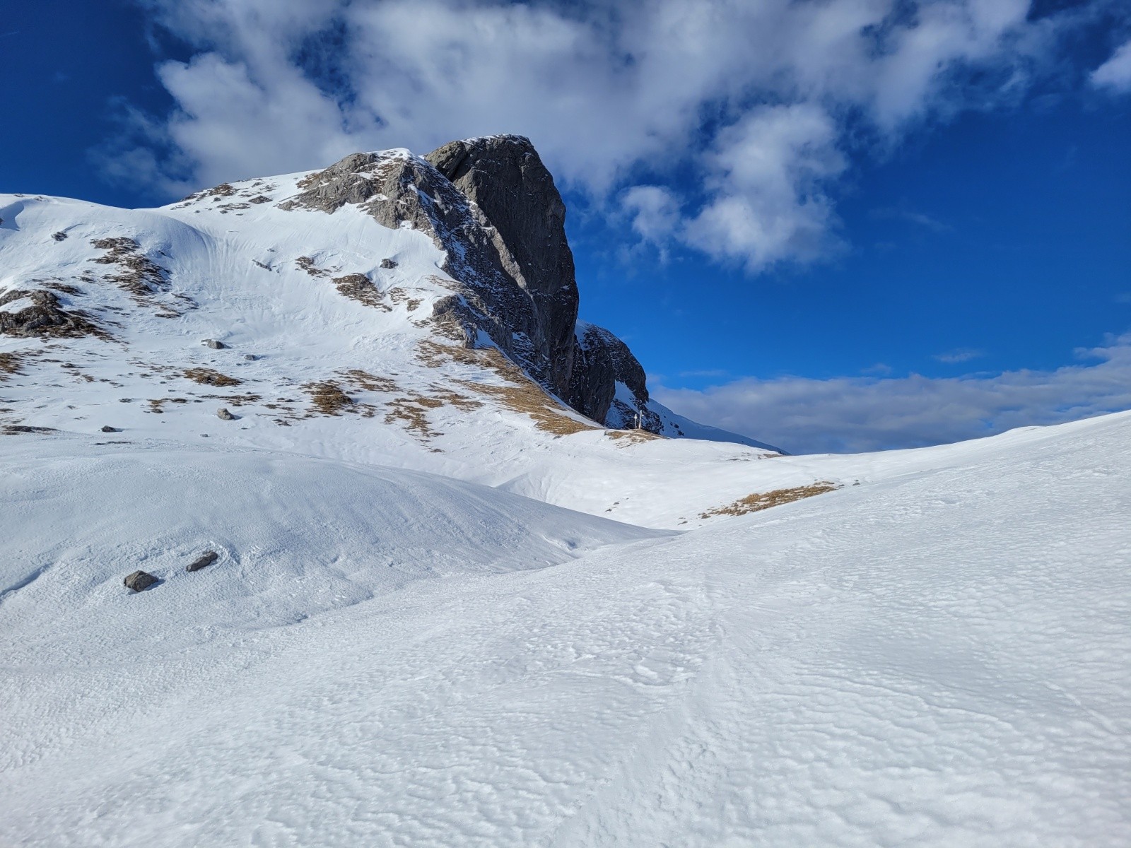 Itinéraire suivi :Montée par Chevenne et son torrent encaissé, avec une portion bien déneigée. Ensuite il faut chercher un enneigement constant au-dessus des Chalets de Topper, puis sous la Calaz, ça passe encore, mais l'herbe n'est vraiment pas loin ! Plan Berger un peu plus enneigé mais des rochers affleurent encore par endroit. Les corniches sont bien stabilisées avec la pluie et le regel. On atteint le sommet plutôt facilement au-dessus du Pas de Chaudin mais pour moi à pied, j'avais la flemme de mettre les couteaux.