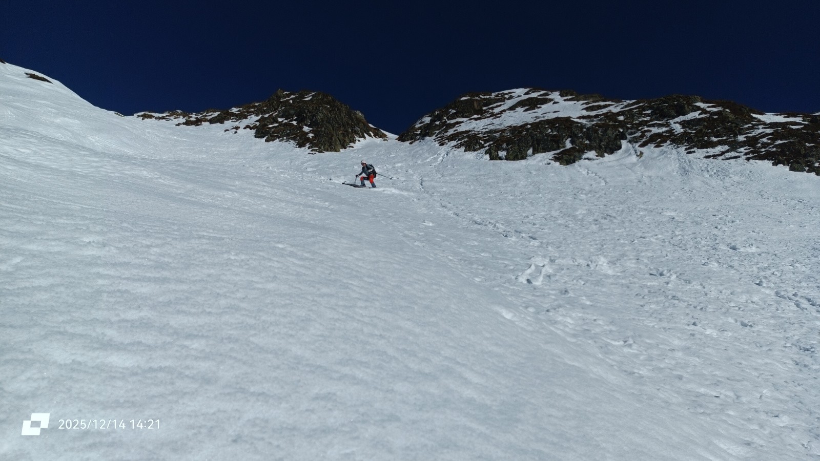 Remontée en direction du couloir du Bec d'Arguille qui voit enfin le soleil. Sans grande conviction pour ma part, on remonte jusqu'à son pied. Croûte portante, avec peu d'accroche, et vu comme le secteur tarde à décailler j'ai pas bien envie de me mettre terreur dans l'affaire. Dommage c'est une jolie pente mais ce sera pour une autre fois. Emeric plus à l'aise opte pour le couloir suivant 5 prédécesseurs. Je tricoterai dans le vallon en l'attendant. Il trouvera finalement un début de décaillage en visant bien face au soleil, ski concentré tout de même.