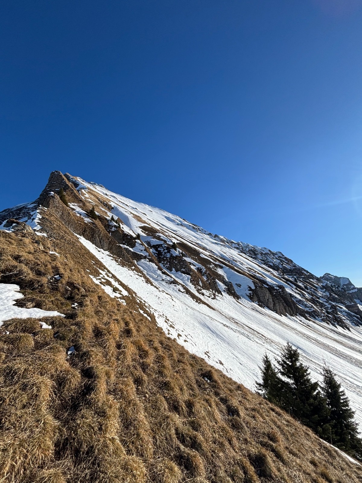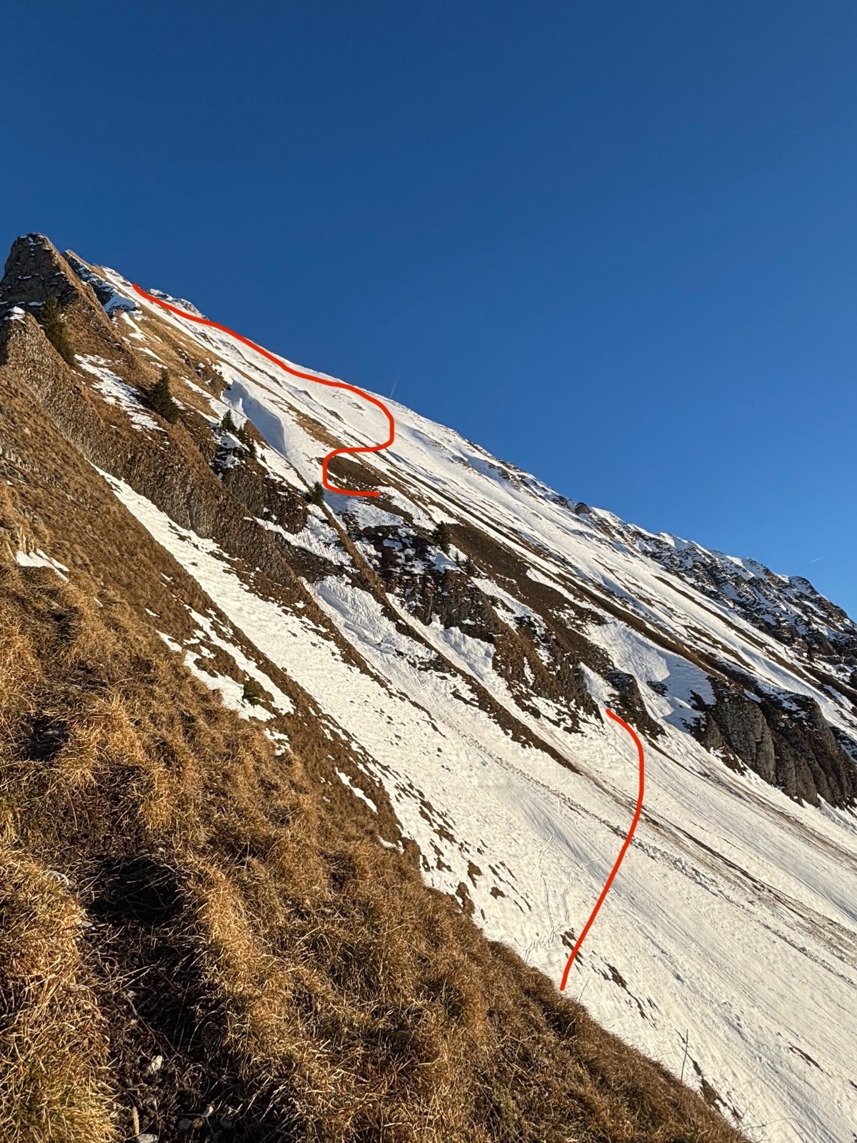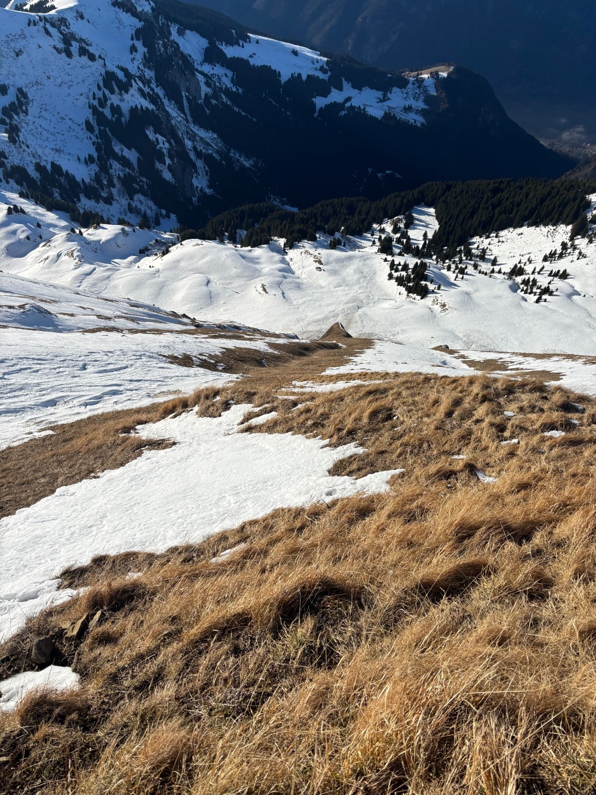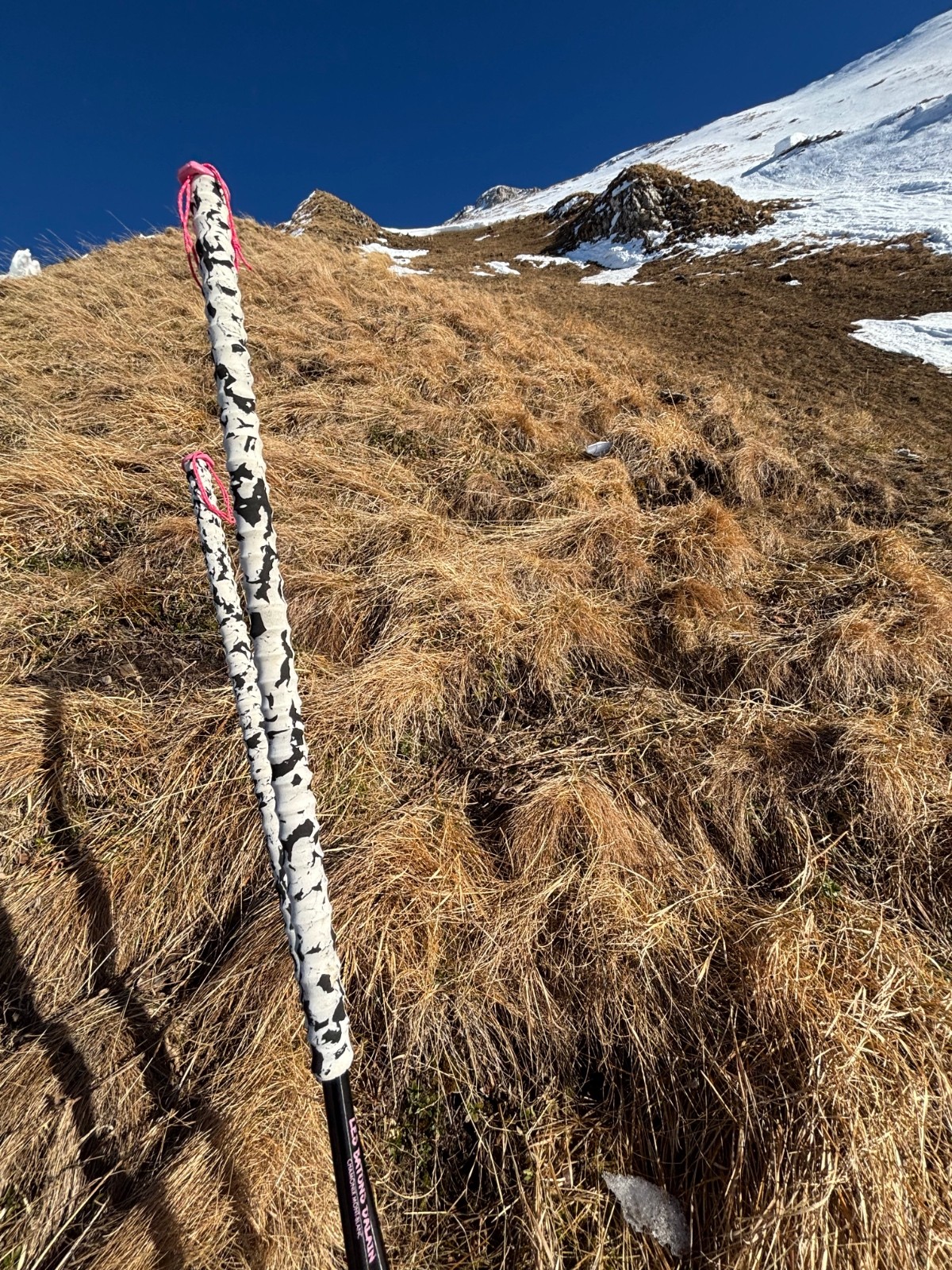 Col - Sommet : Ah mince c'est sec comme tout, bon en longeant la face je trouve un couloir qui passe et qui donne accès aux pentes supérieures. Quelques traversées herbeuses puis je profite de l'herbe pour monter plus rapidement. Dépôt des skis 50m sous le sommet que je rejoins à pieds.