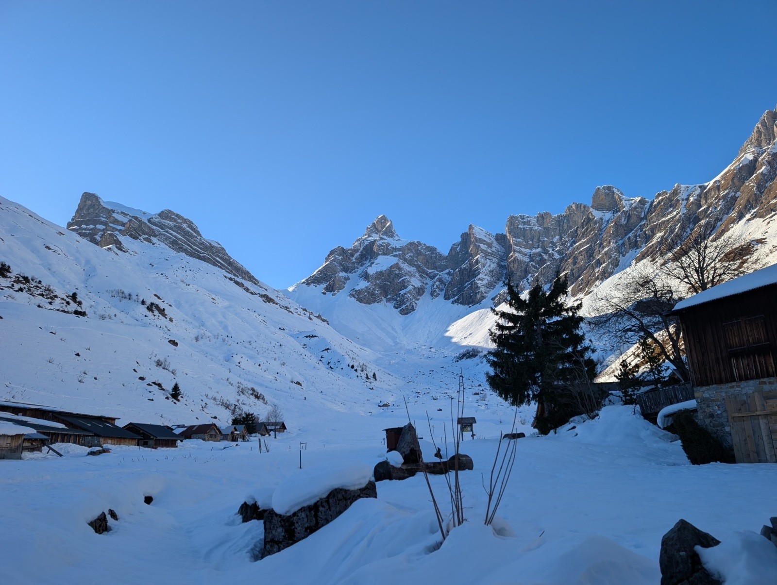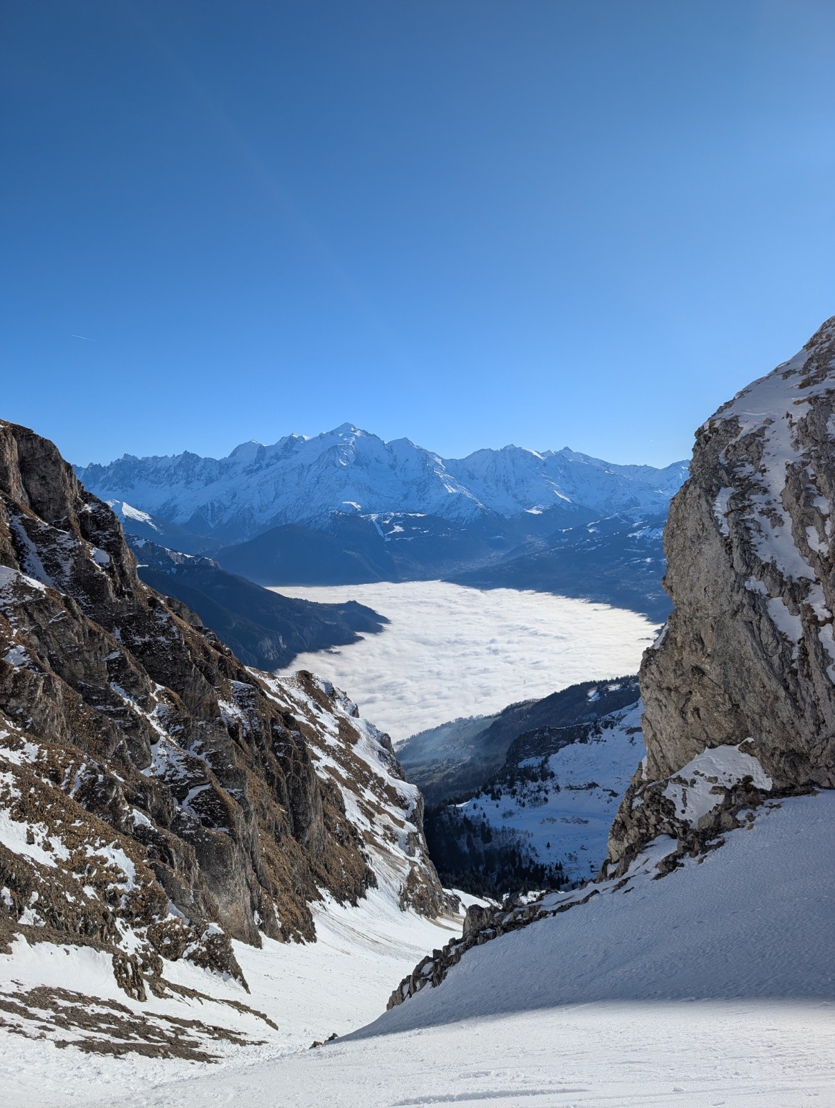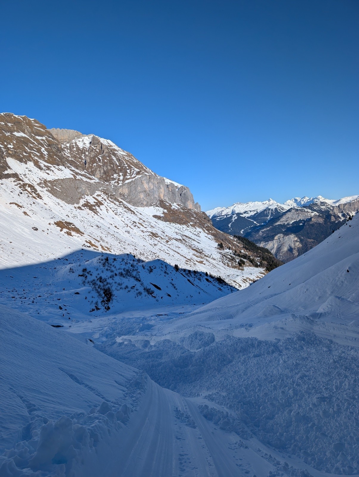 Itinéraire suivi : La montée au col de la Forclaz se faisait encore bien, en slalomant entre les trous d'herbes (bien repérer pour la descente). La trace était bien faite et ça tenait encore bien. Je n'ai pas poussé jusqu'à la pointe. Ca avait l'air soufflé. Descente moquette, tout juste dérangé par les boulettes d'anciennes purges