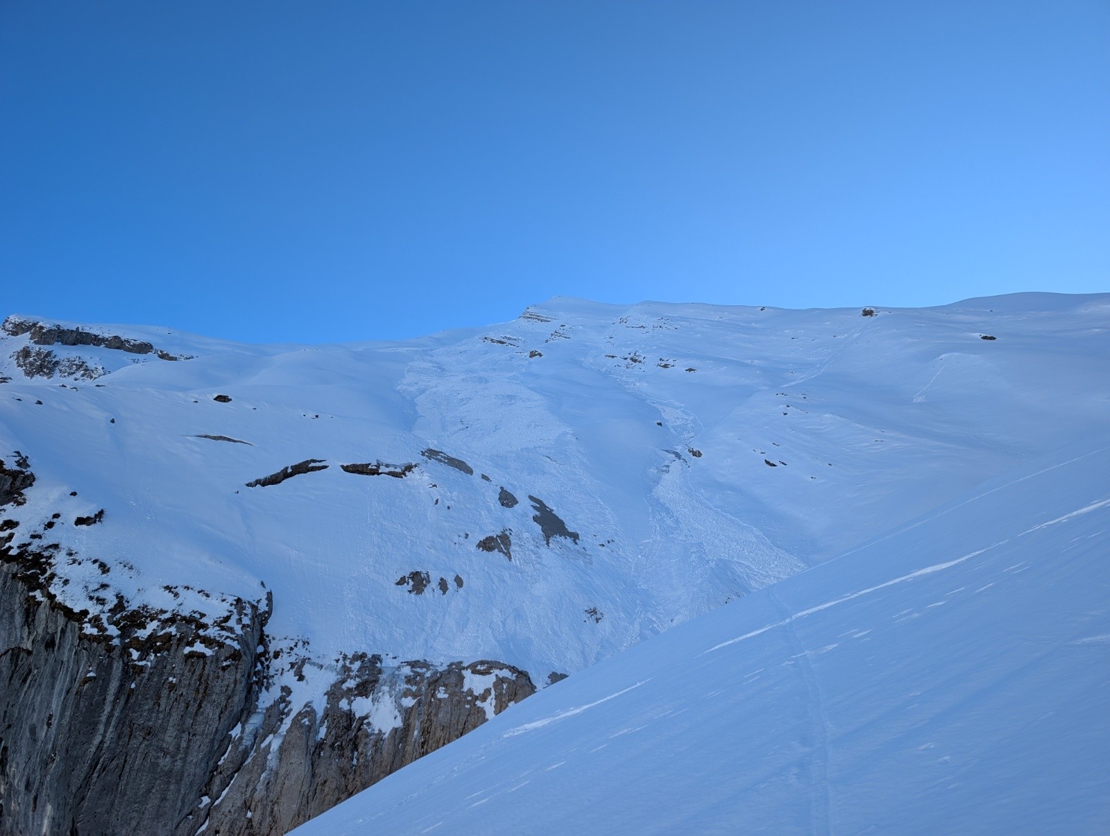 Conditions nivo et activité avalancheuse : glissements à l'herbe face sud. Le couloir Est des Nants a purgé et gaché le bas de la combe. Face nord des 4 têtes ravagée par de nombreuses coulées, une grosse coulée récente est partie des pentes ensoleillées du col de Doran et a raviné jusqu'au replat - traversée compliquée
