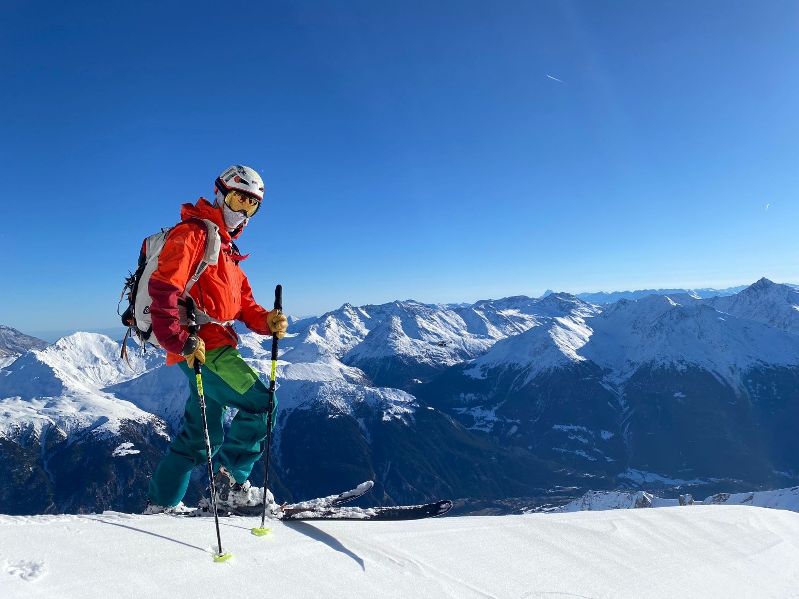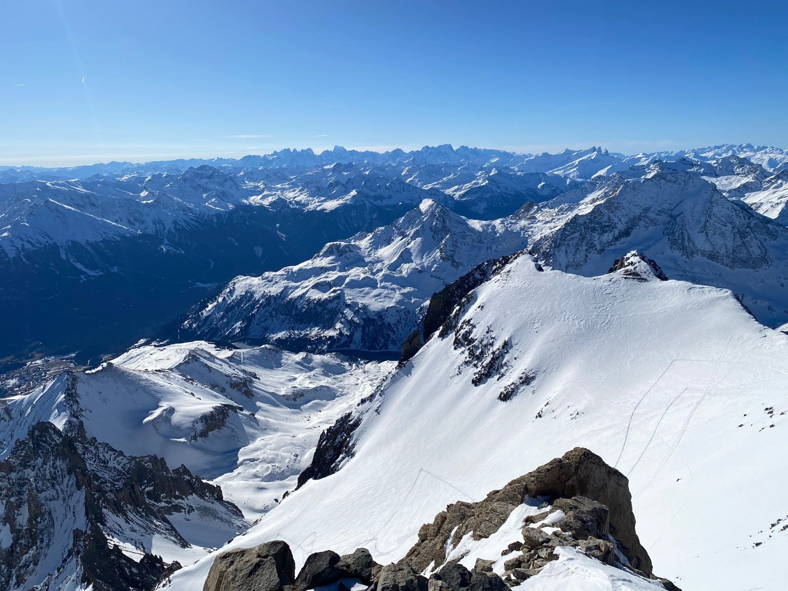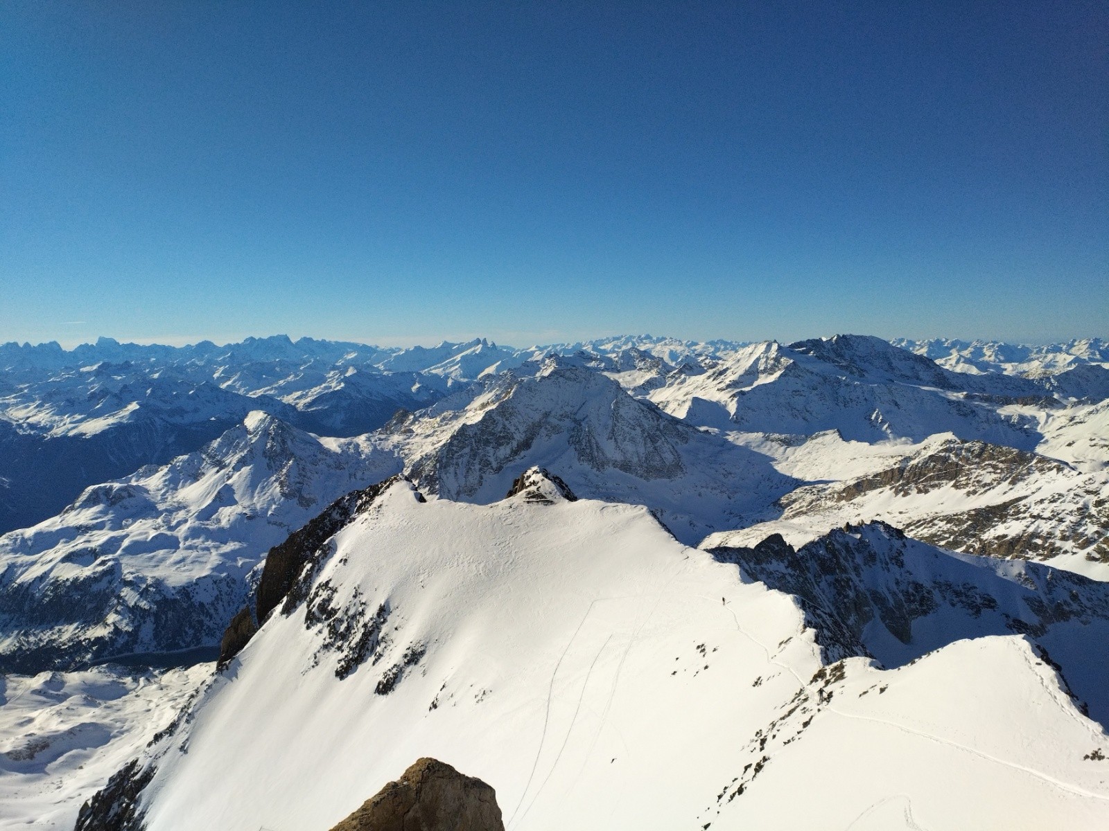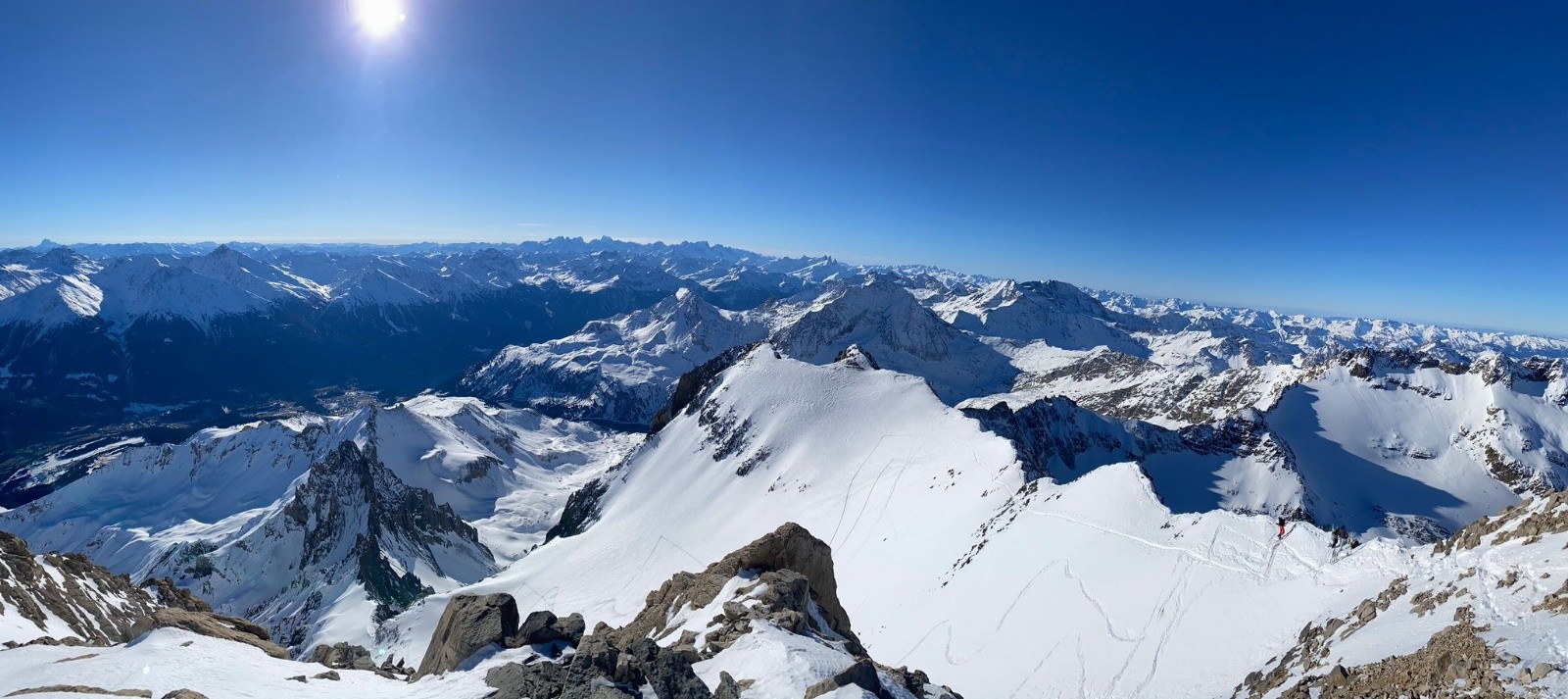 Arrivé au sommet, la vue est incroyable, ça fait plaisir d'être de retour dans ces paradis blancs! En face, c'est la grande "piste noire" de la Grande Casse qui nous domine tandis que la vue sur les Ecrins se dévoile au Sud. Sylvain me rejoint bientôt sur le sommet peu large et on profite de la belle aventure du jour. Les sommets connus sont énumérés comme on récite un chapelet, et vient le tour du Mont Blanc.