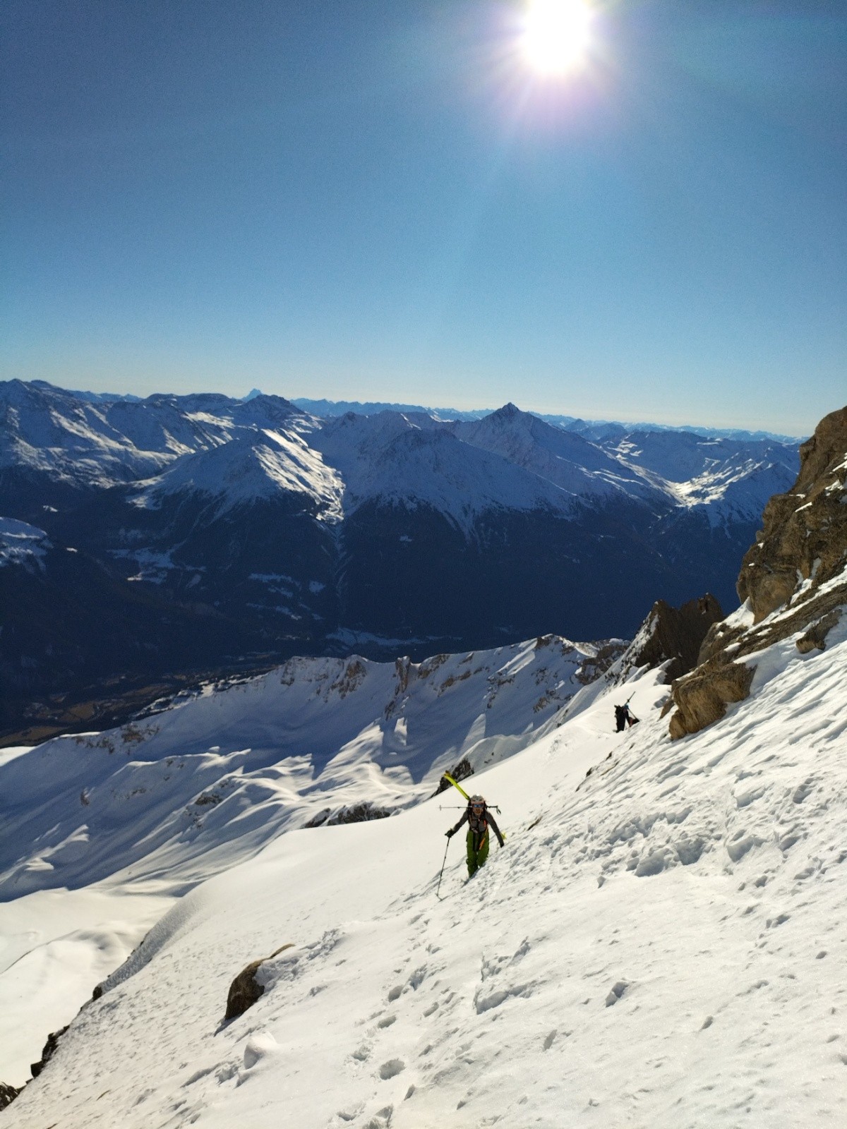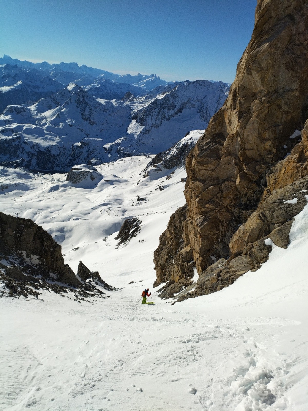 Bref, les premiers virages en neige bien revenue sont satisfaisants, voilà une bonne descente! Un peu d'attention avant la brèche et puis c'est parti dans le couloir!