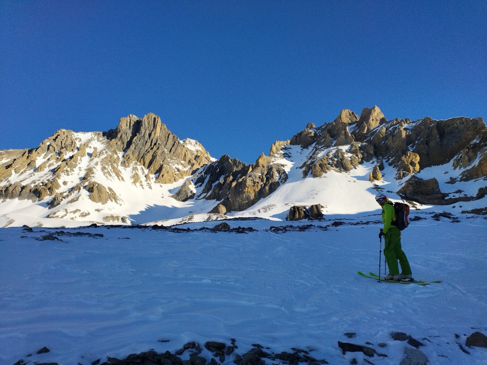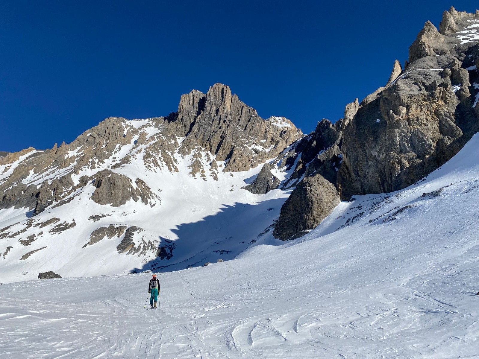 skitour.fr/sorties/181687), nous attire le regard. Ca semble être la destination parfaite, orientée sud, petit couloir et un beau sommet à 3700m. Sauf que nous on y va le jour de l'ouverture de la station, ce qui transforme un 2100m de dénivelé un peu secos d'entrée de jeu, en un petit 1100m largement plus débonnaire.