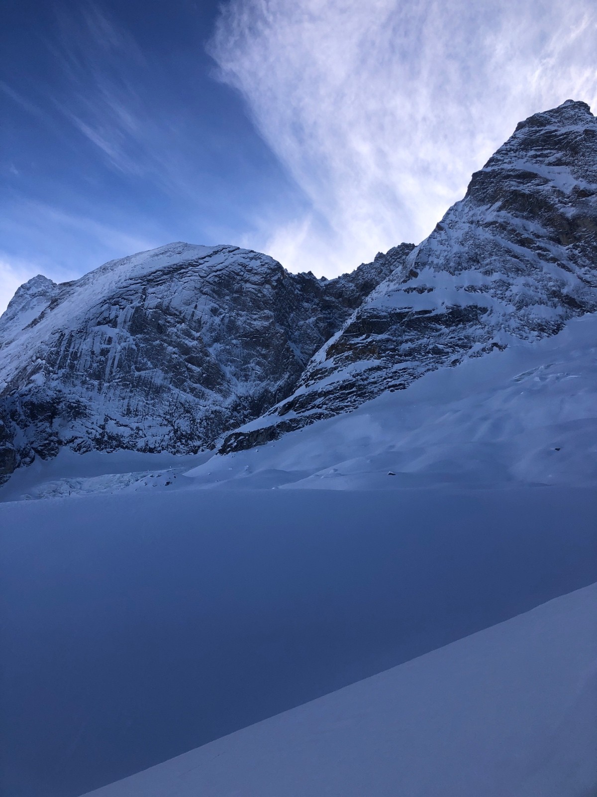 A l'approche du glacier, on retrouve les 2 à 3 cm tombé hier sur une neige globalement densifié par le vent. Il y a quelques patchs de neige durcie par le vent un peu piégeux mais c'est plutôt bien meilleur que ce qu'on peut trouver ailleurs en ce moment.