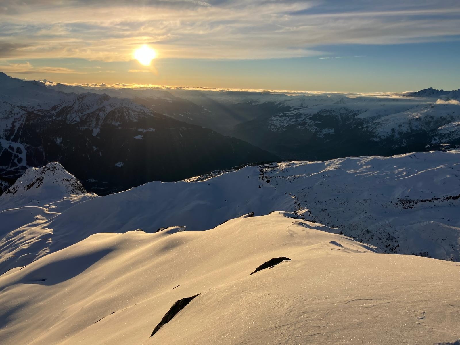 Conditions pour le ski : neige soufflée en altitude, poudre compacte jusqu'à 2800 puis alternance neige dure, croûtée.