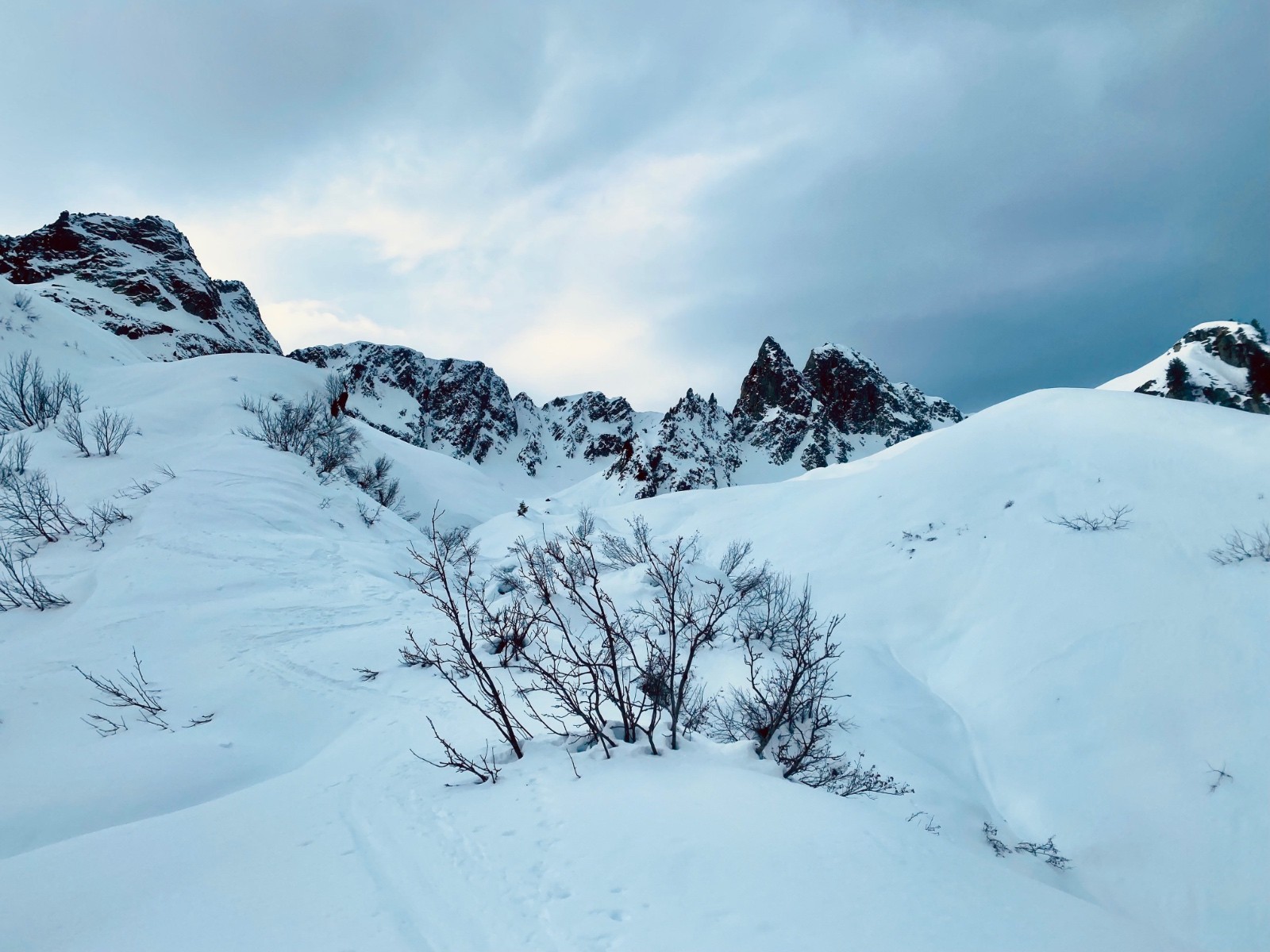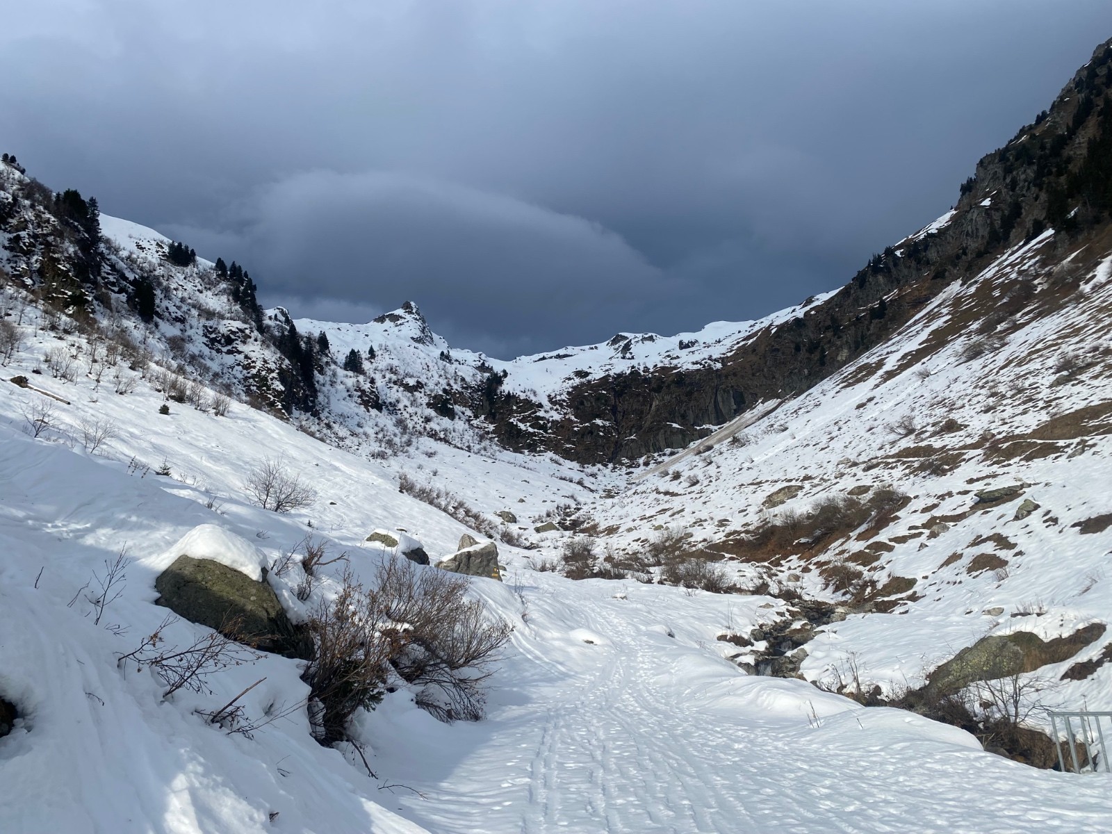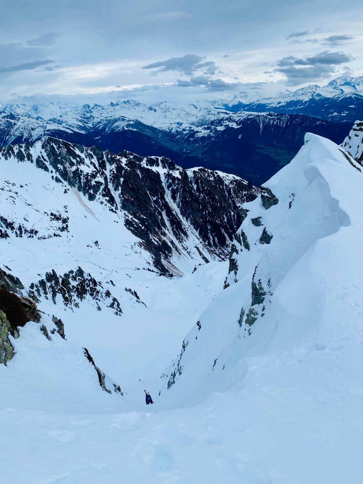 On remet les peaux direction le couloir NE de la pointe, il y a une vieille trace de montée de quelqu’un en meilleure forme que moi 🤣 mais merci quand même ! On déchausse au pied du couloir. Ça monte bien on s’enfonce un peu mais pas trop. Perso j’ai mis les crampons pour les tester mais ce n était pas vraiment nécessaire. Le couloir doit être à peu près skiable à la descente mais ce serait pas du grand ski. A la montée franchement je suis sure que c’était bien mieux !