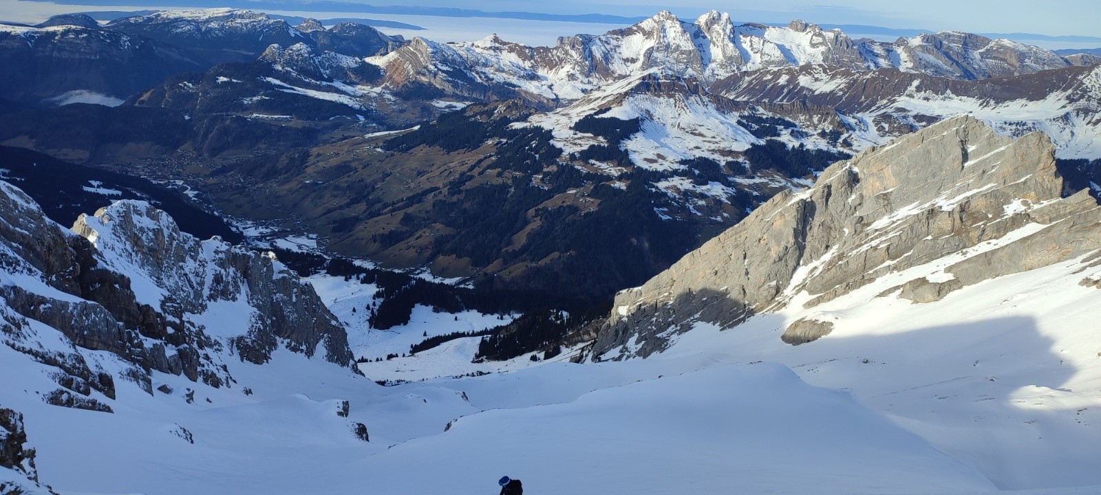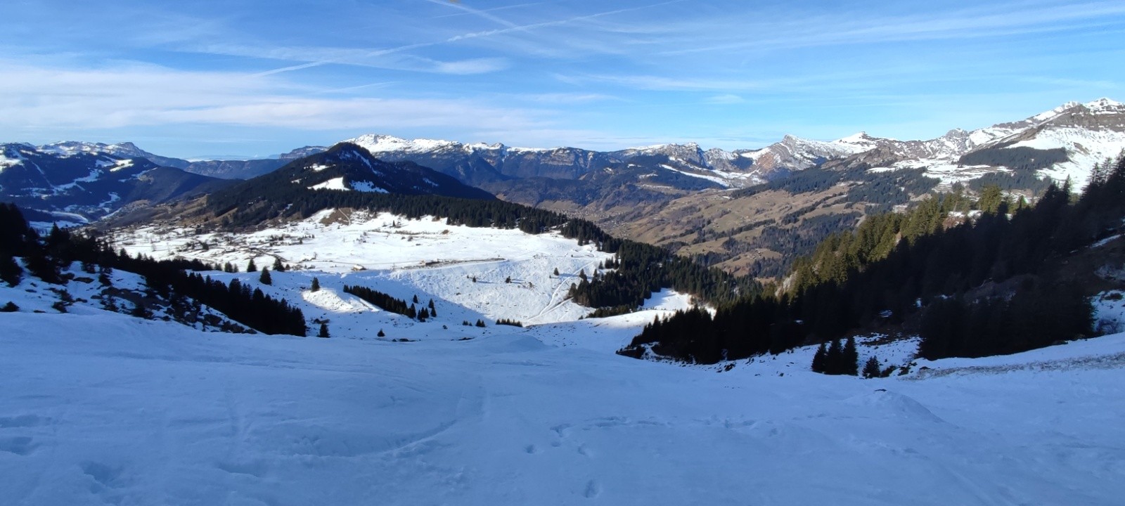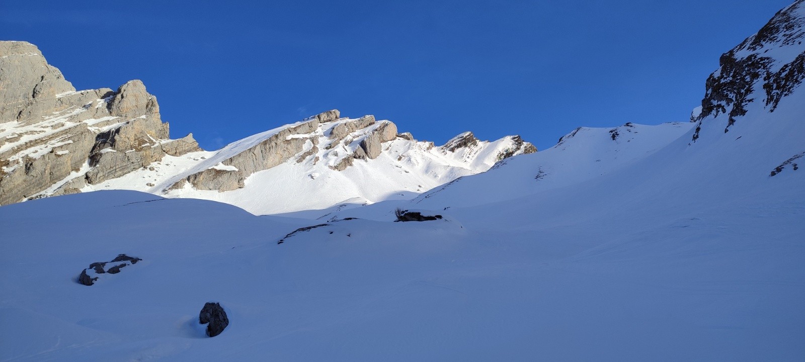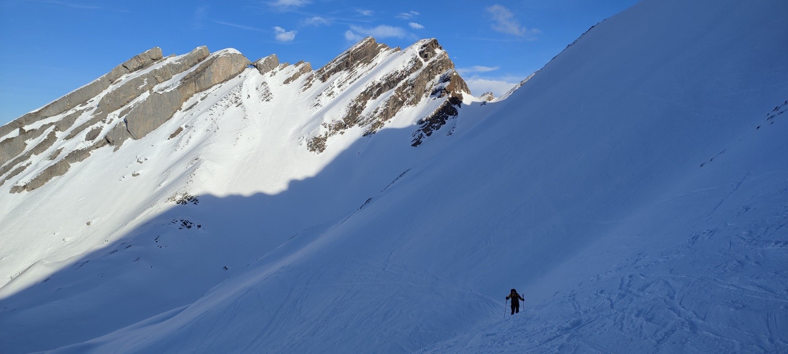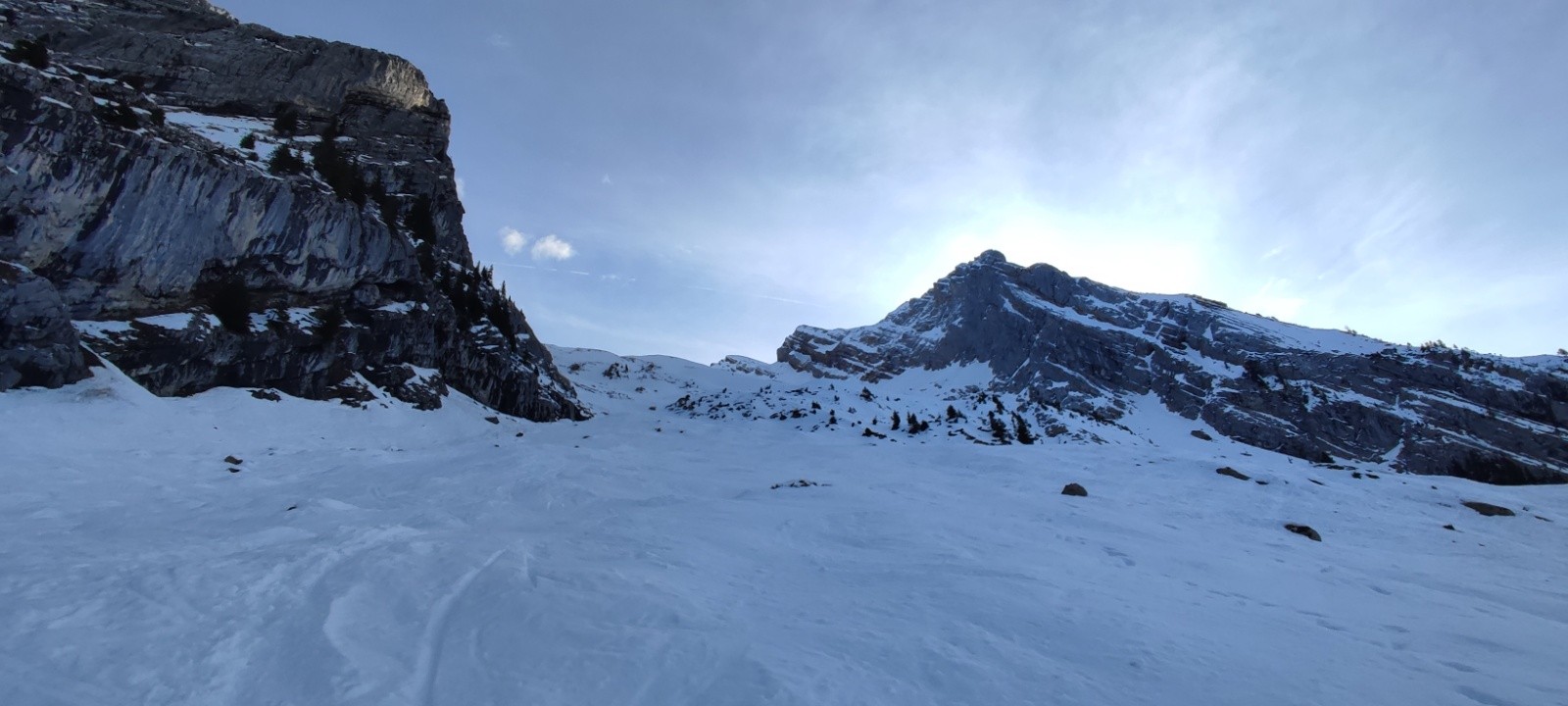 Partis un peu en retard sur l'heure prévue, on se refait tête pelouse avec Charles comme l'an dernier, mais beaucoup plus tôt dans la saison. Je me dis que rien ne sert de partir trop tôt, la neige aura bien le temps de transformer pour la descente. Oui... Sauf qu'on est le 21/12 et j'avais pas tilté que la combe ne prend pas du tout le soleil sur la trace classique... Du coup, ce sera du béton du béton et encore du béton sur plus de 800m des 1100 de D+ de la rando 😅