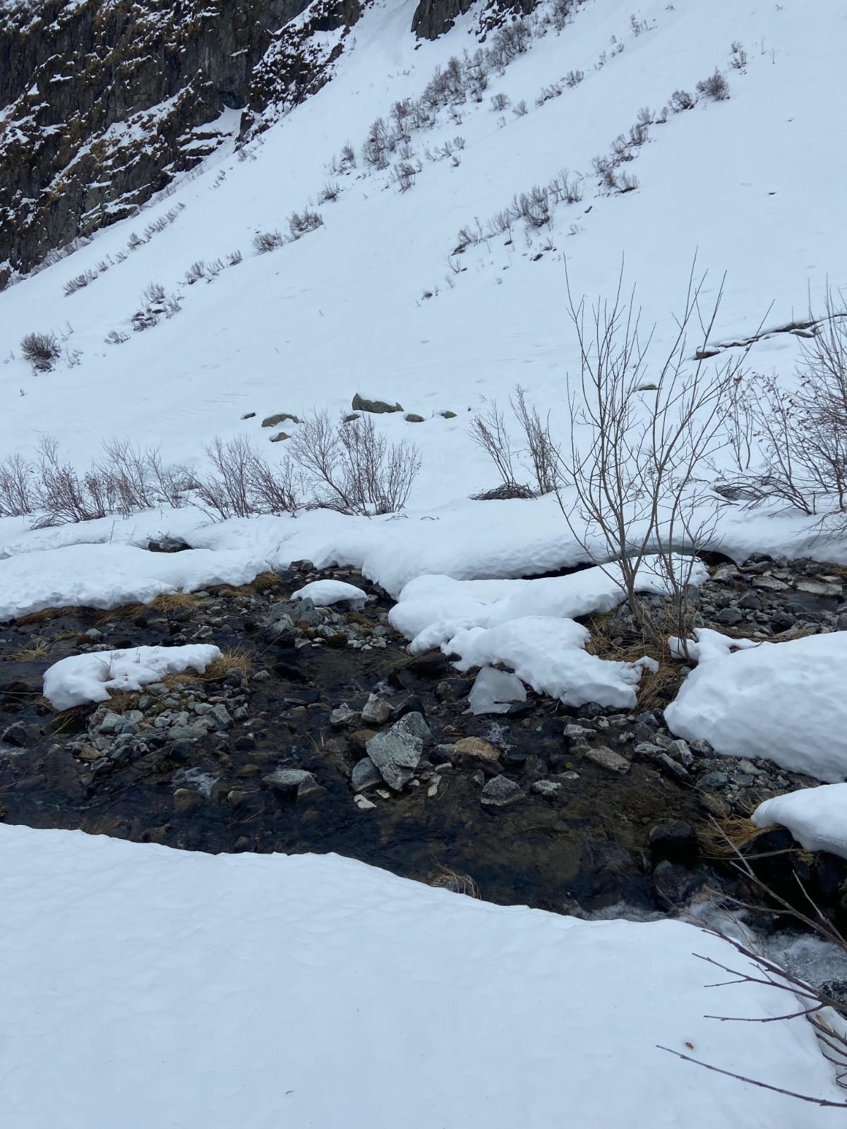 topo - et on aurait clairement pas dû car le topo indique de monter rive gauche (versant sud) du vallon. Après discussion on a suivi le topo craignant de ne pas pouvoir traverser le torrent plus en amont, et donc on s’est tapé moults déchaussages et franchissements de ruisseaux jusqu’à l’Orselle. Tout ça pour s’apercevoir que la rive droite passait sans problème à ski tout du long … erreur rattrapée à la descente donc