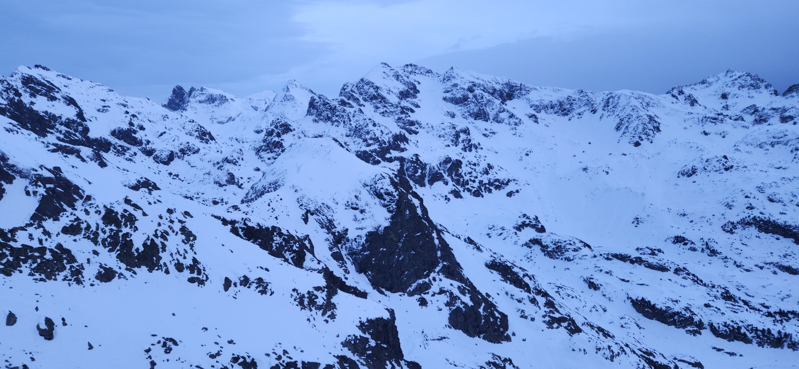 Sortie test, veni vedi pleuri, c'est bien infâme comme prévu, neige à partir de la cabane, relativement inskiable entre croûte, carrelage et béton. Et gros manque un peu partout, le crux entre l'épaule et le sommet nécessite de déchausser dans les 2 sens.