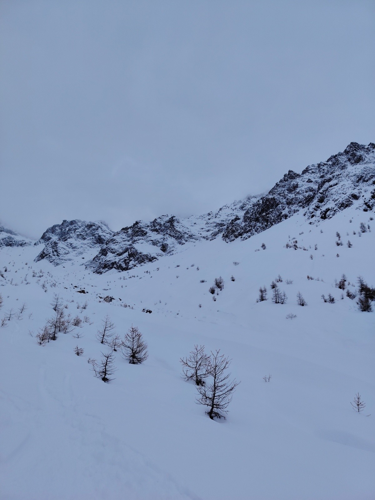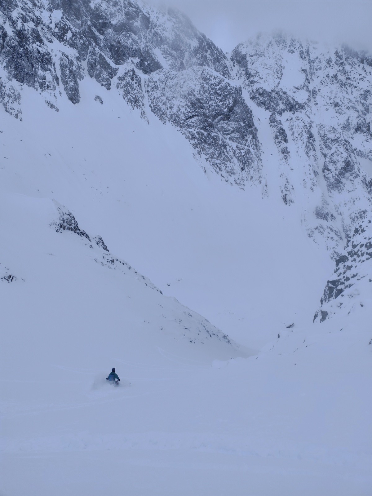 On est allé voir au fond du Tabuc si le retour d'Est était passé par là. Mon traceur attitré s'est bien fatigué à la montée, mais quel luxe de tracer le vallon ! Pas eu besoin d'aller bien loin dans le couloir sud pour voir que c'était pourri, donc redescente pour un petit avant goût de comment sont les virages. Ça repeaute, et direction le fond du vallon, "pour voir". Après une exploration de grotte de glace et un sandwich de qualité, on va s'amuser à taper sur des pelles dans le couloir des scouts, et c'est surprenant de stabilité. On remonte le couloir, on regarde les nuages arriver de partout, donc on file rentrer au chaud. Descente pas mal skiante mais au vu de l'absence quasi complète de visibilité ça dépassera pas le point jaune, les pillows surprise c'est pas spécialement plaisant.