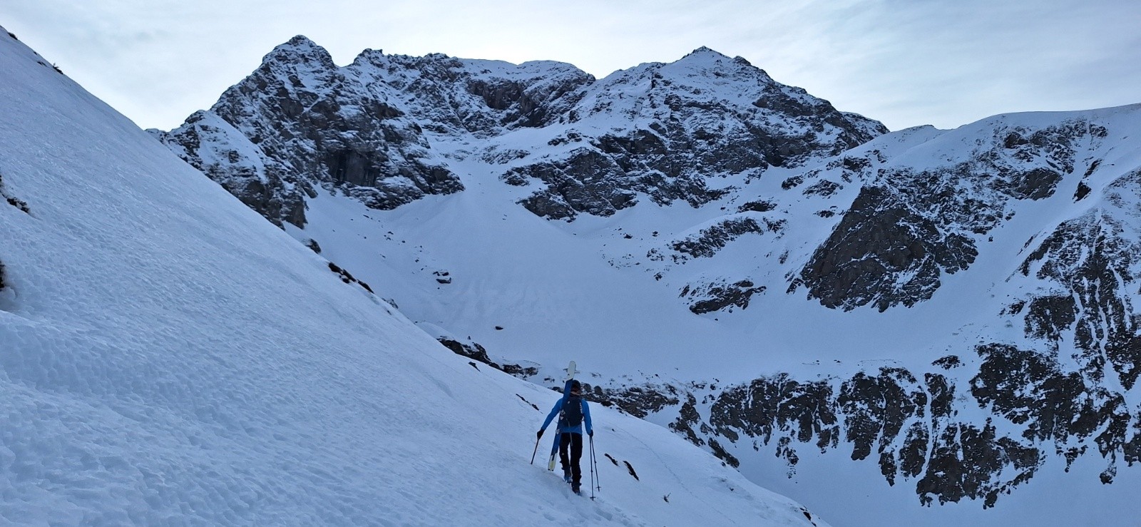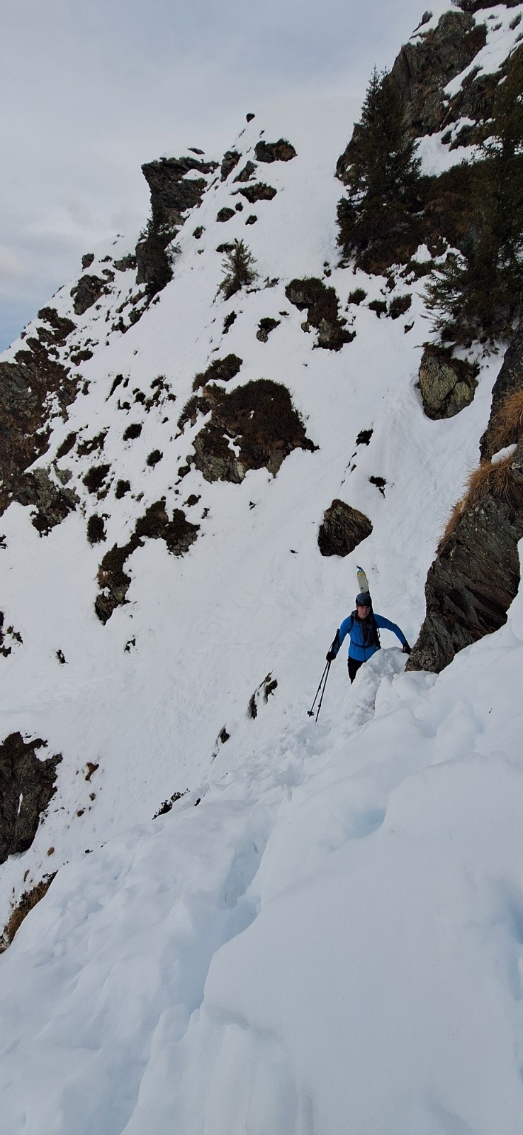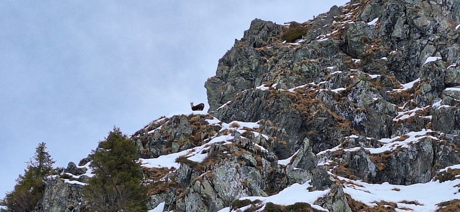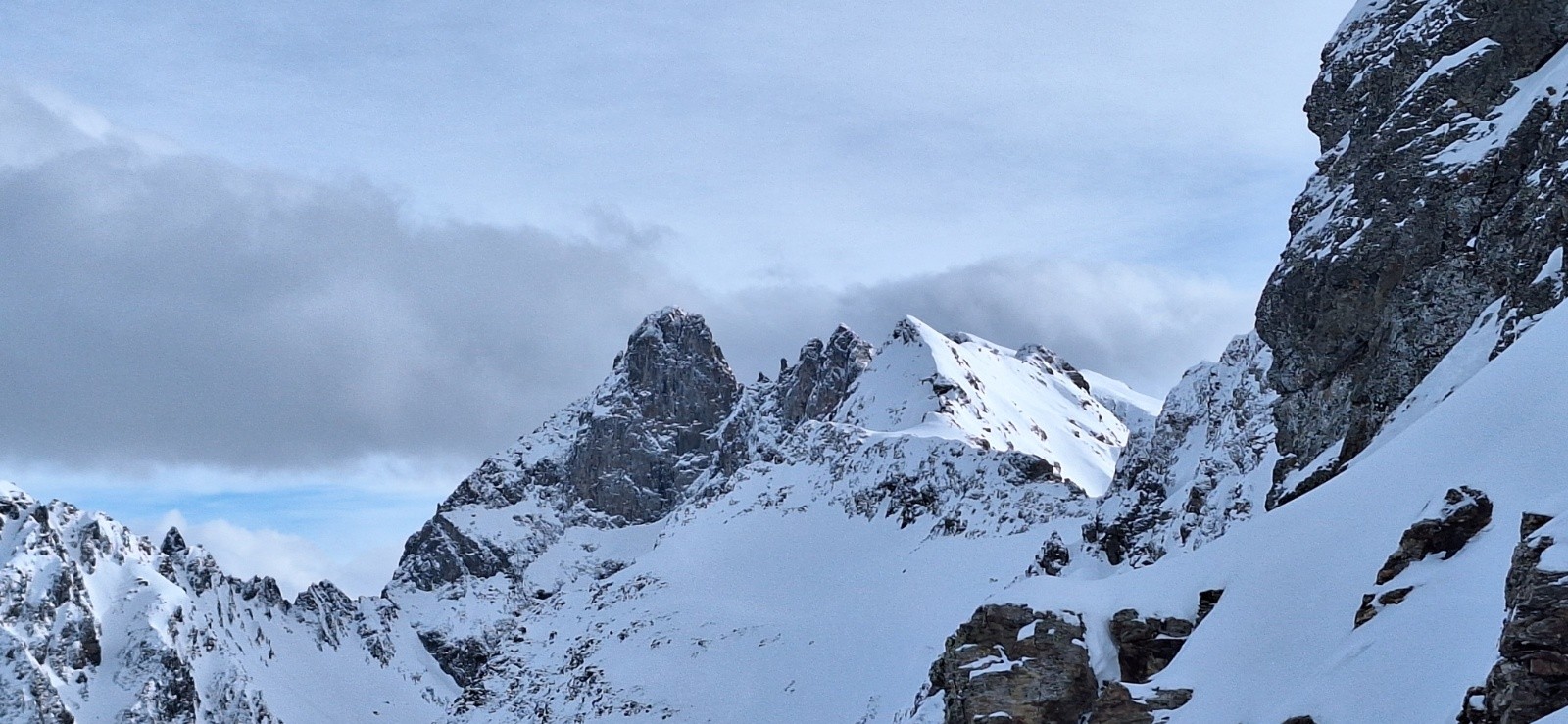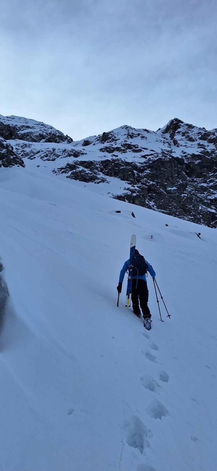 Après un peu d'avancée ski aux pieds on les met sur le sac au Mont St Mury pour une longue longue traversée en neige dure jusqu'au pied de la pente qui mène au col des Lances. Il y avait déjà des traces, c'était bien pratique et ça a bien facilité notre tâche. On a eu une belle interaction avec un chamois qui était plutôt curieux de notre présence😉. Par contre pour monter au col des Lances c'était vierge, il fallait tracer et étonnamment dans une bonne neige fraîche. On a pas mal brassé en se relayant mais ça a quand même été un plaisir😁.