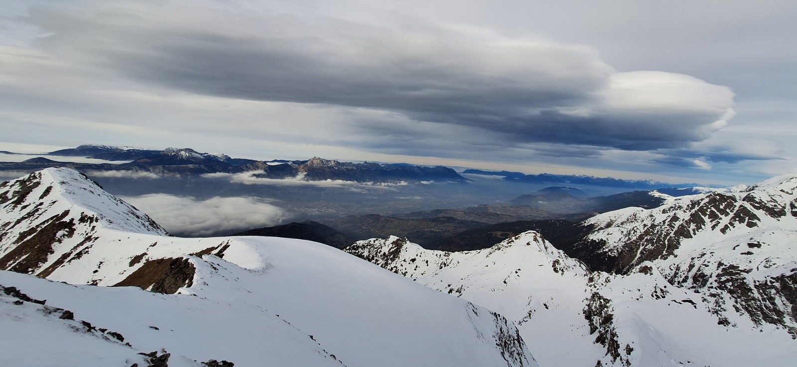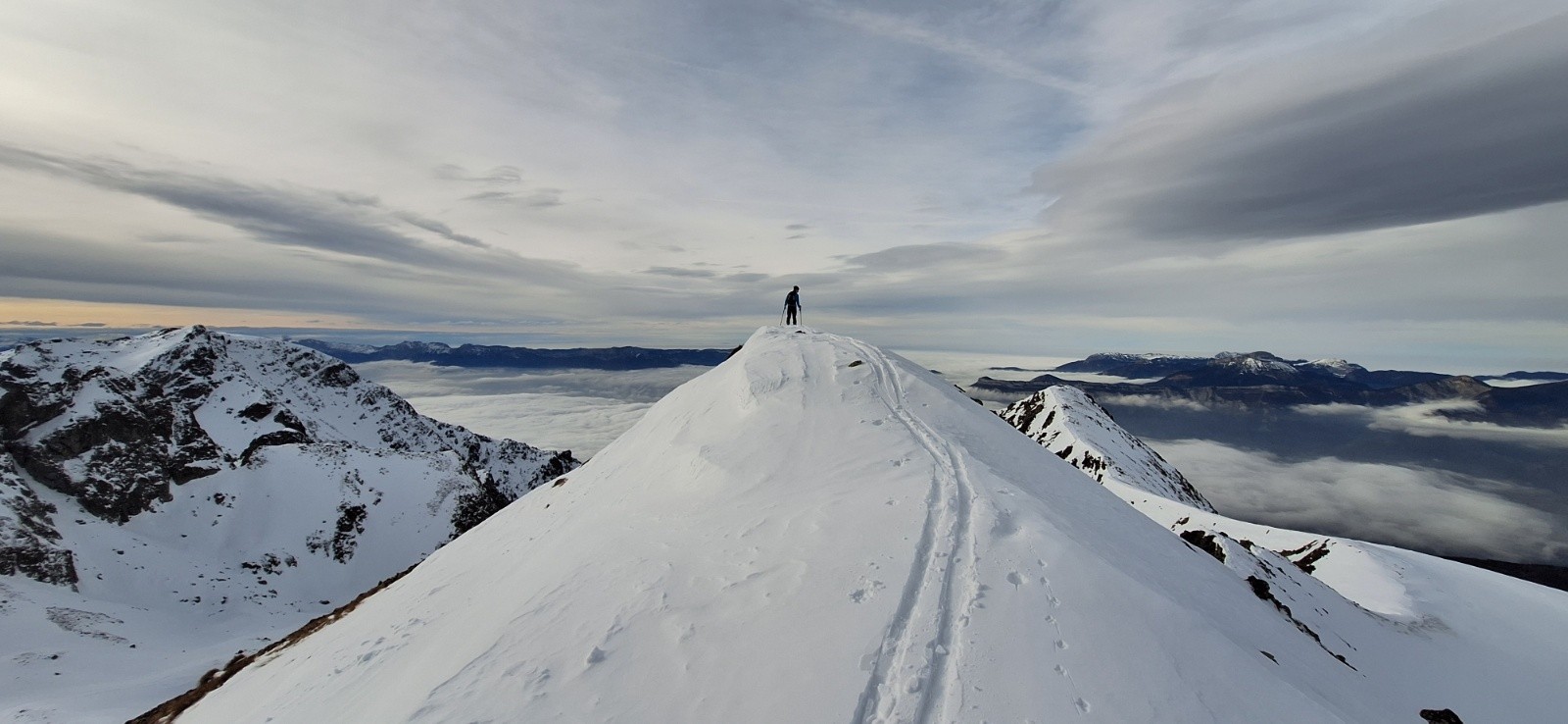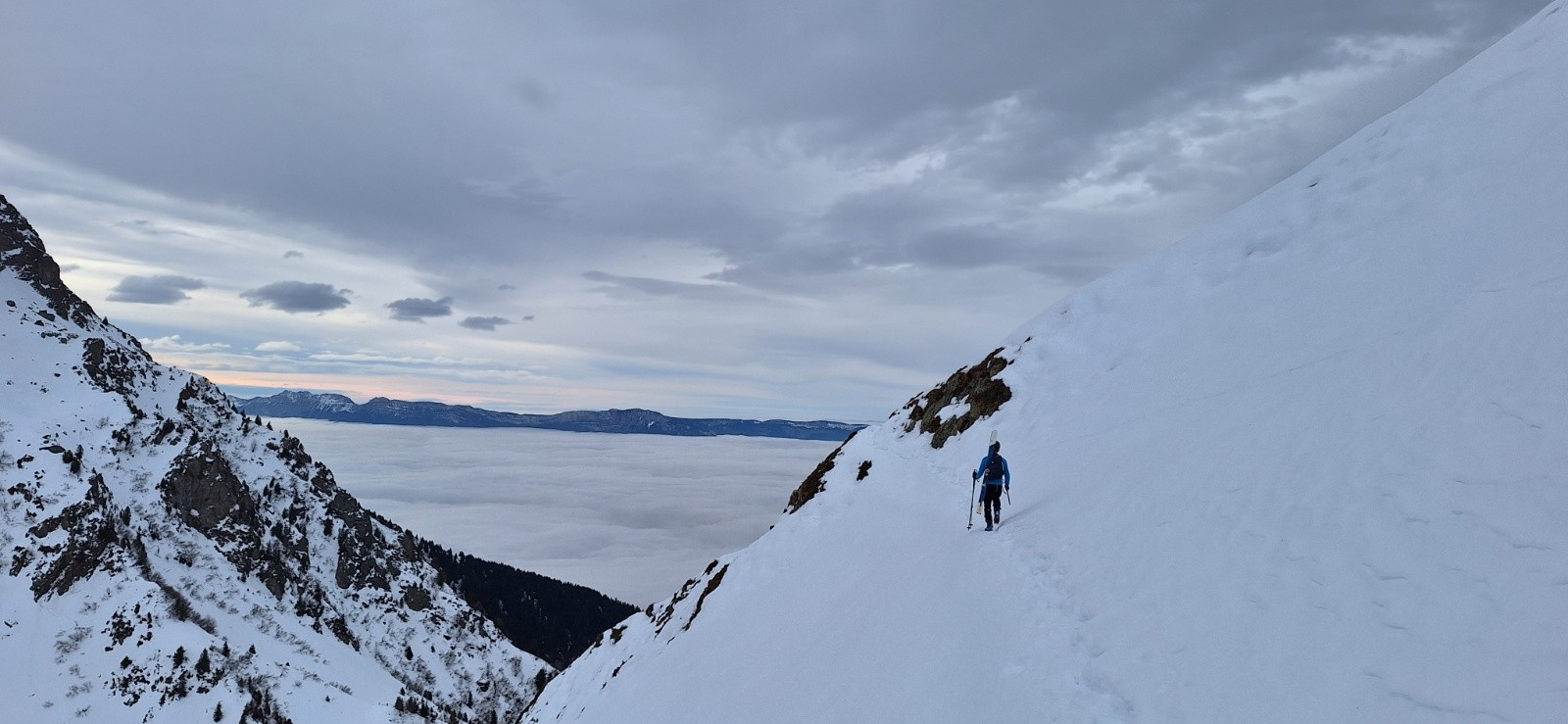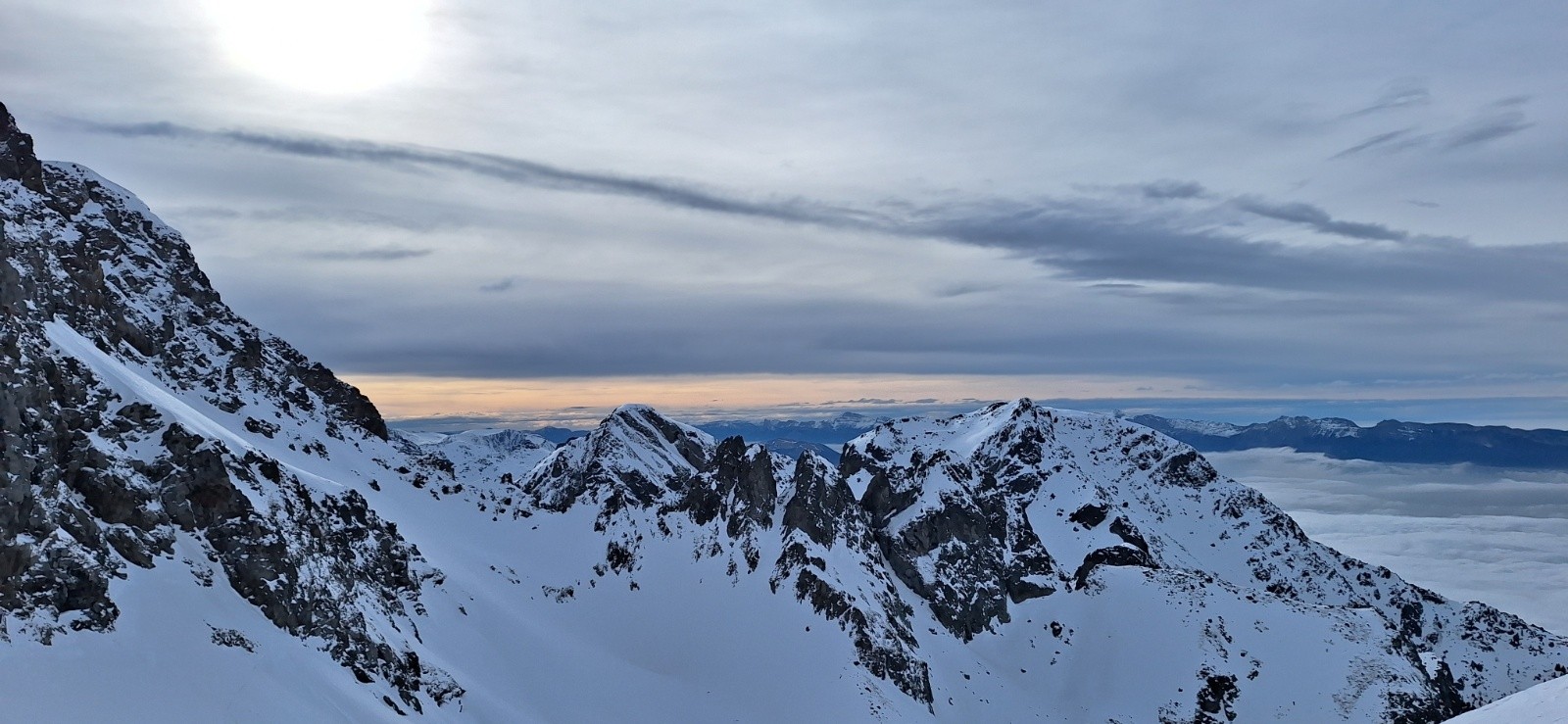 Encore une énième contemplation du paysage et de la mer de nuages qui au fur et à mesure de la journée s'est densifiée😍. On n'a encore croisé personne mais on a entendu des voix au col. Il y avait des gars qui étaient en train de sortir le Pic du Loup par un des difficiles couloirs Ouest.