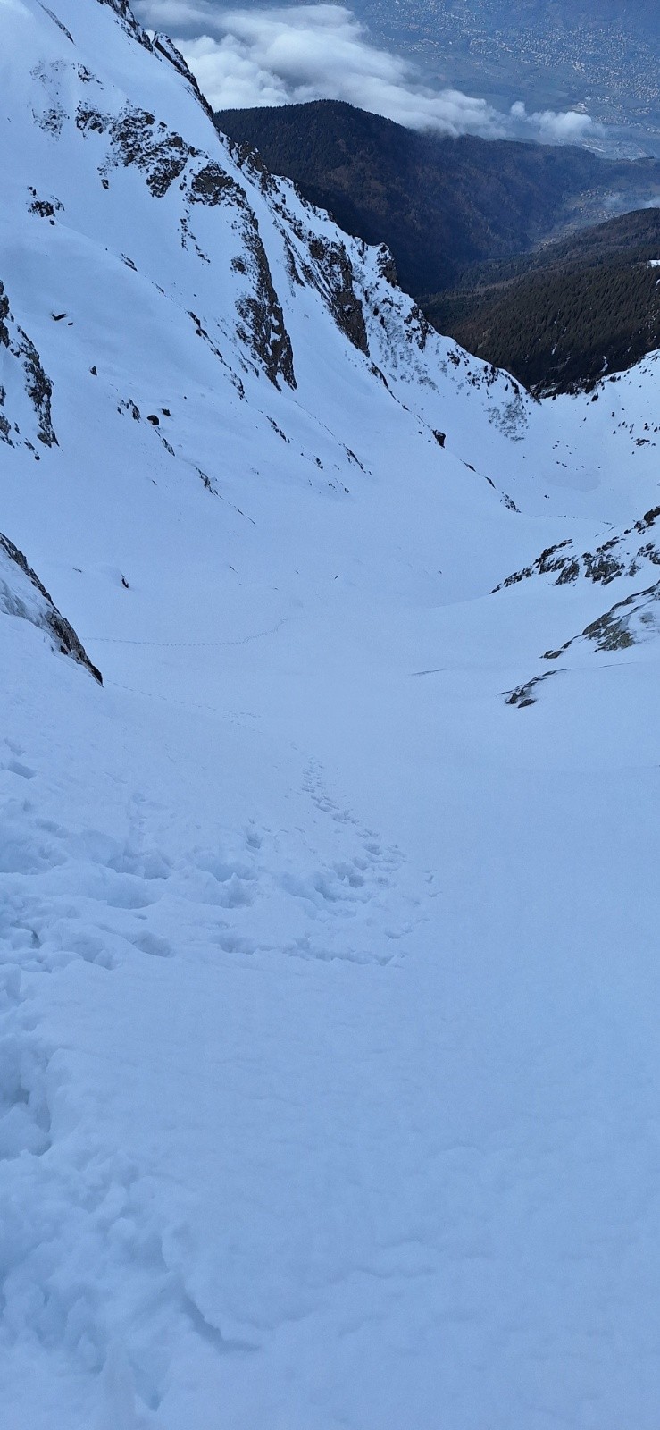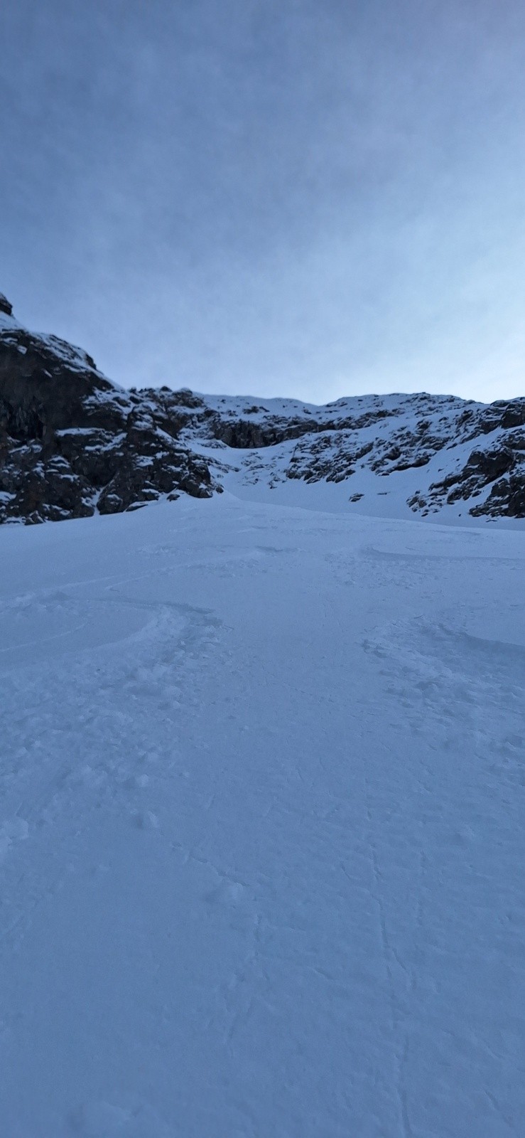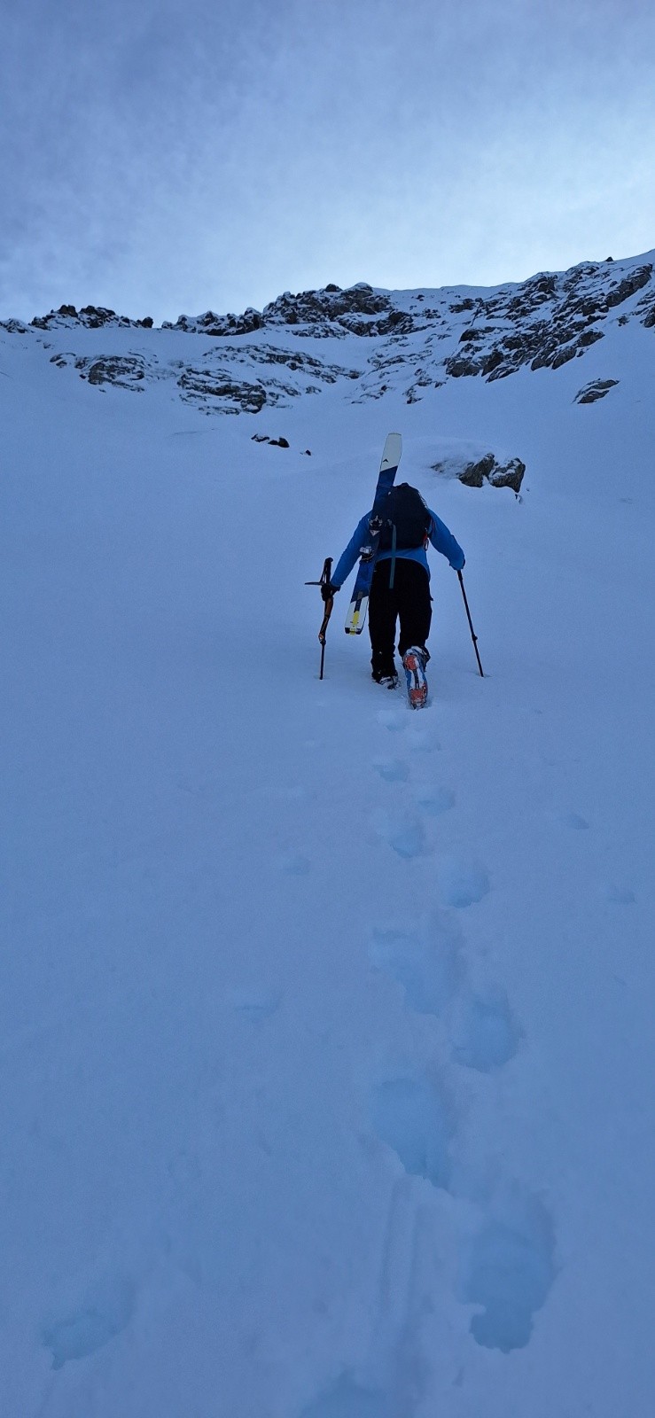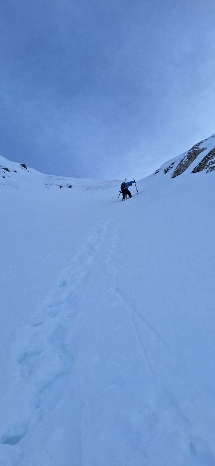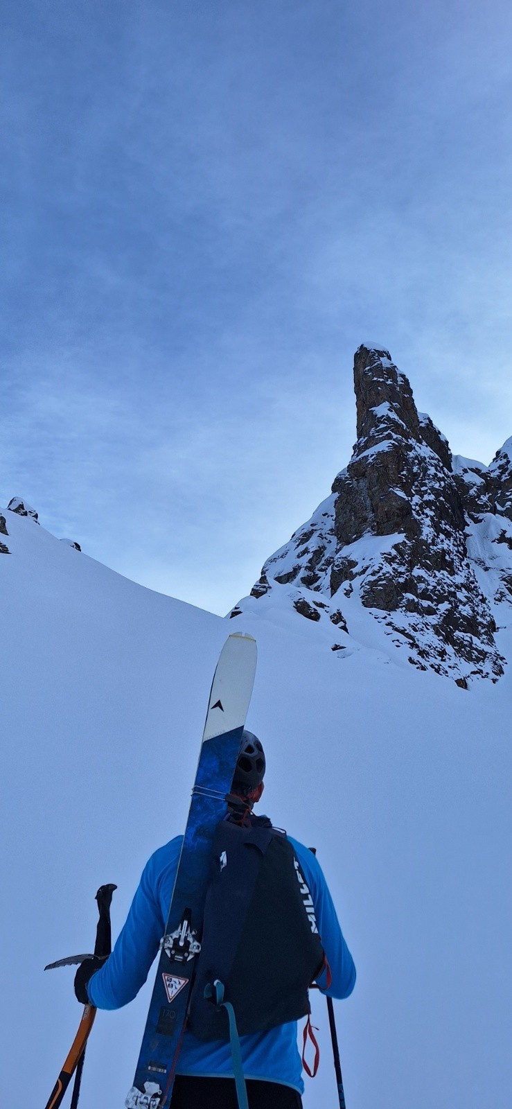Cette fois-ci c'est Raphael qui passe devant pour tracer ce qui n'est pas dur. Une fois remonté au col le vent s'est levé, il est bien l'heure de repartir. On profite d'une dernière descente encore une fois plutôt bonne puis on repeaute pour 50m. De là-haut on cramponne et une fois les skis sur le sac nous fuyons le vent qui commence à ventiler sévère💨💨. Finalement on n'y a quasiment pas été exposé, protégés par le relief...