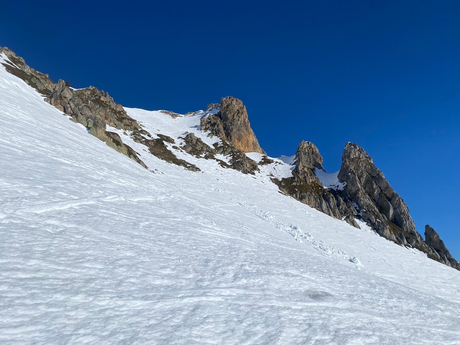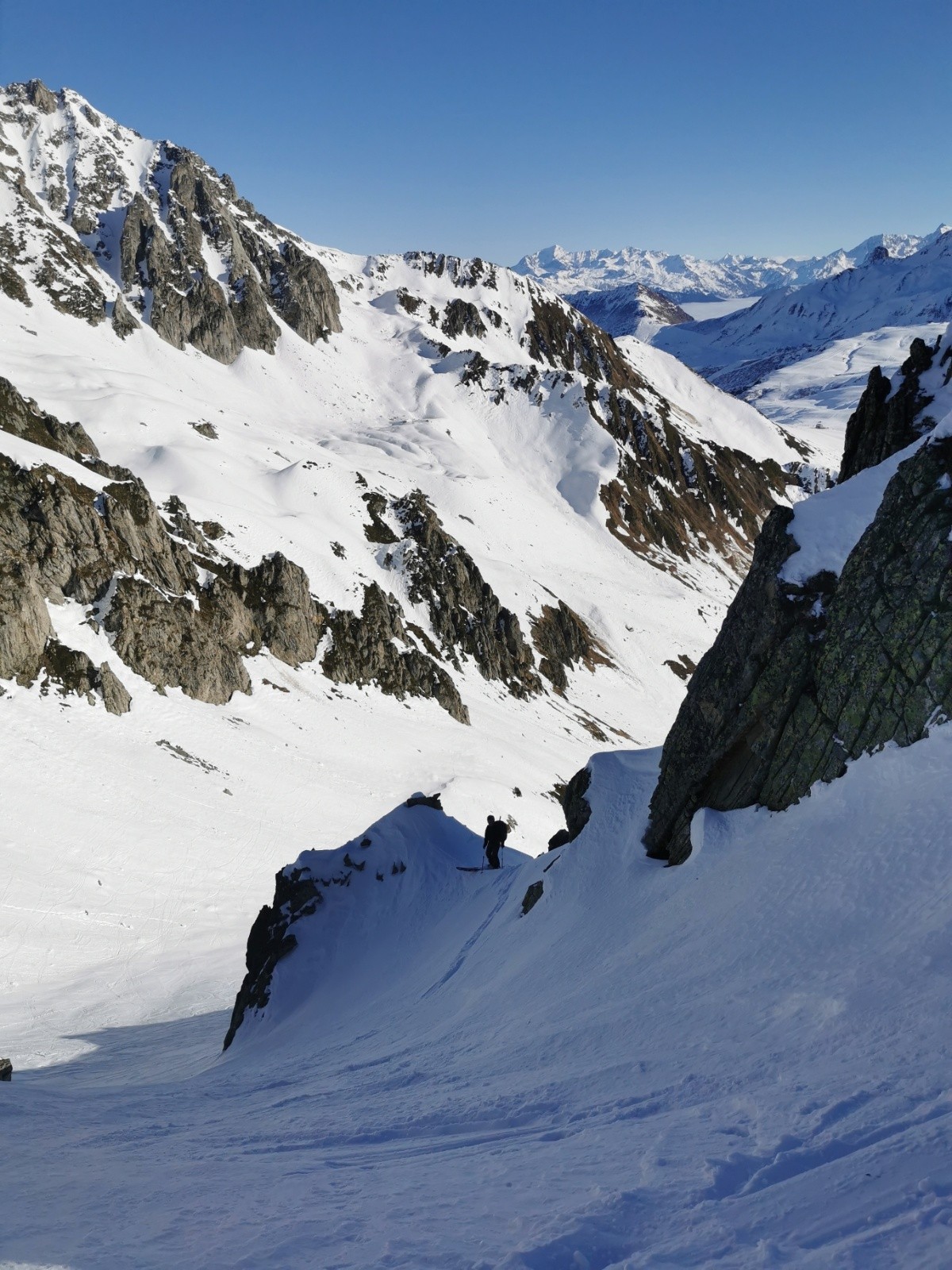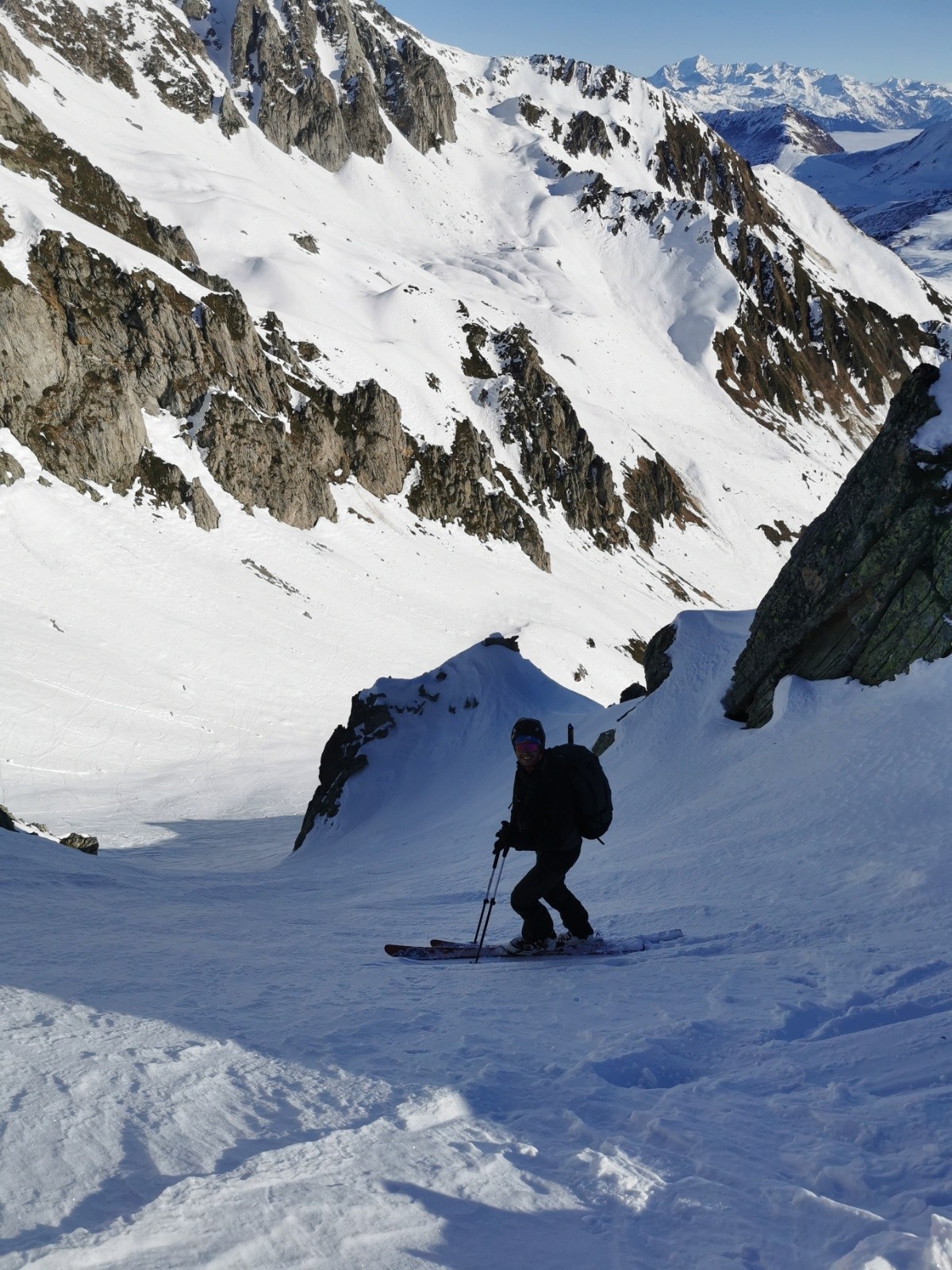 Conditions pour le ski : croûte gelée, léger décaillaige en face Sud Est, presque bonne dans couloir Nord