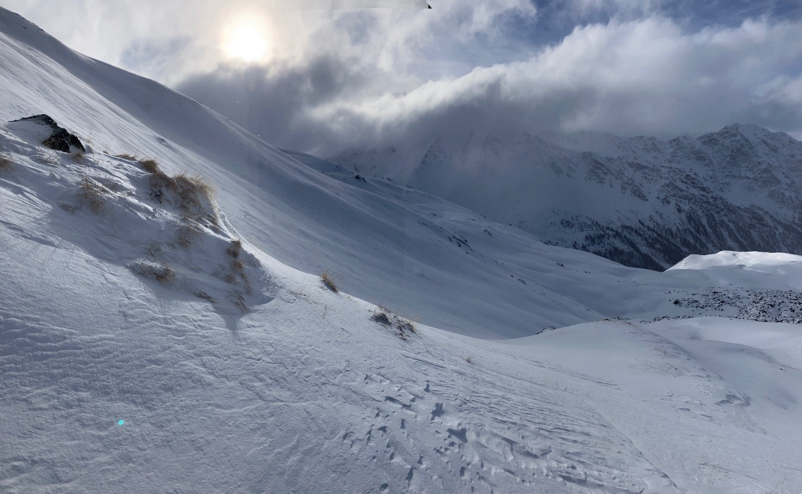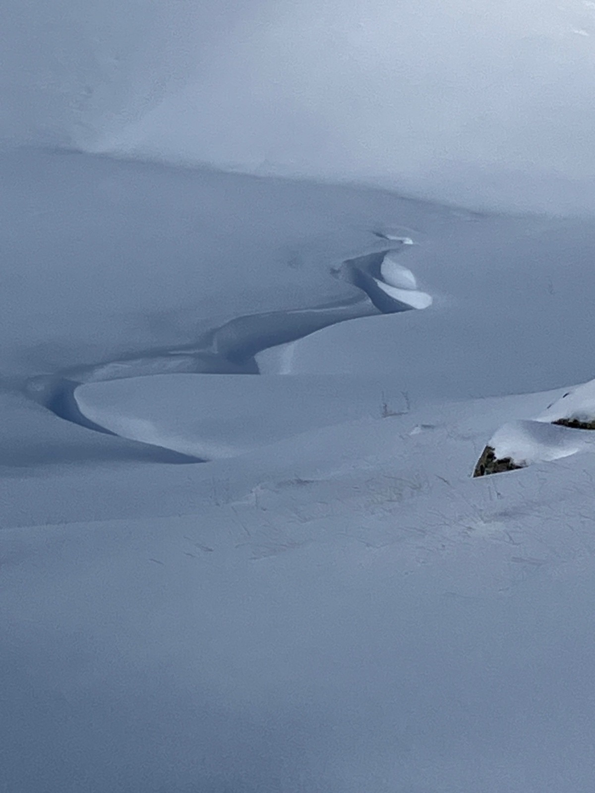 Je me faufile de part et d autre de la crête pour rejoindre le pic traversier, l enneigement n est quand même pas top sur cette portion , on voit les touffes d herbes . À mesure que je passe sous le vent de la crête j entends de bons whoofs qui m’avertissent qu il va falloir rester très prudent .
