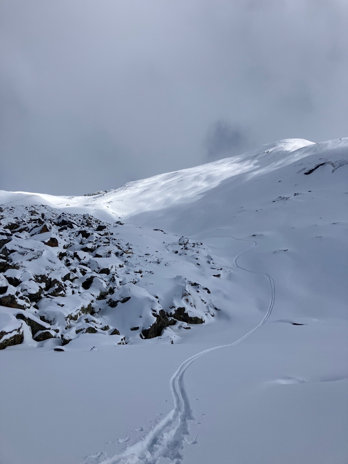 Après avoir dépassé le col longet j’entends quelques whoofs à mesure que je rejoins les contre pentes sommitales. Méffi !!!!