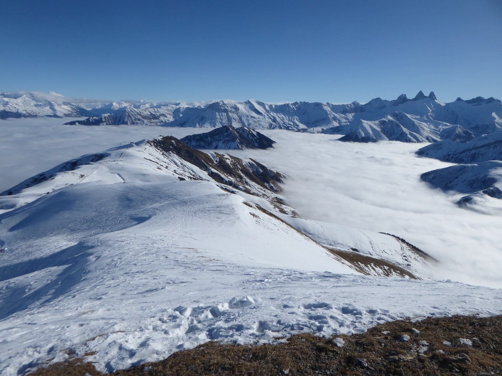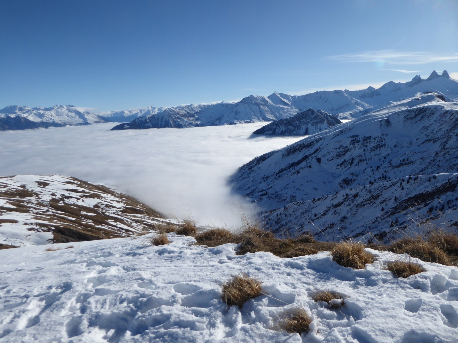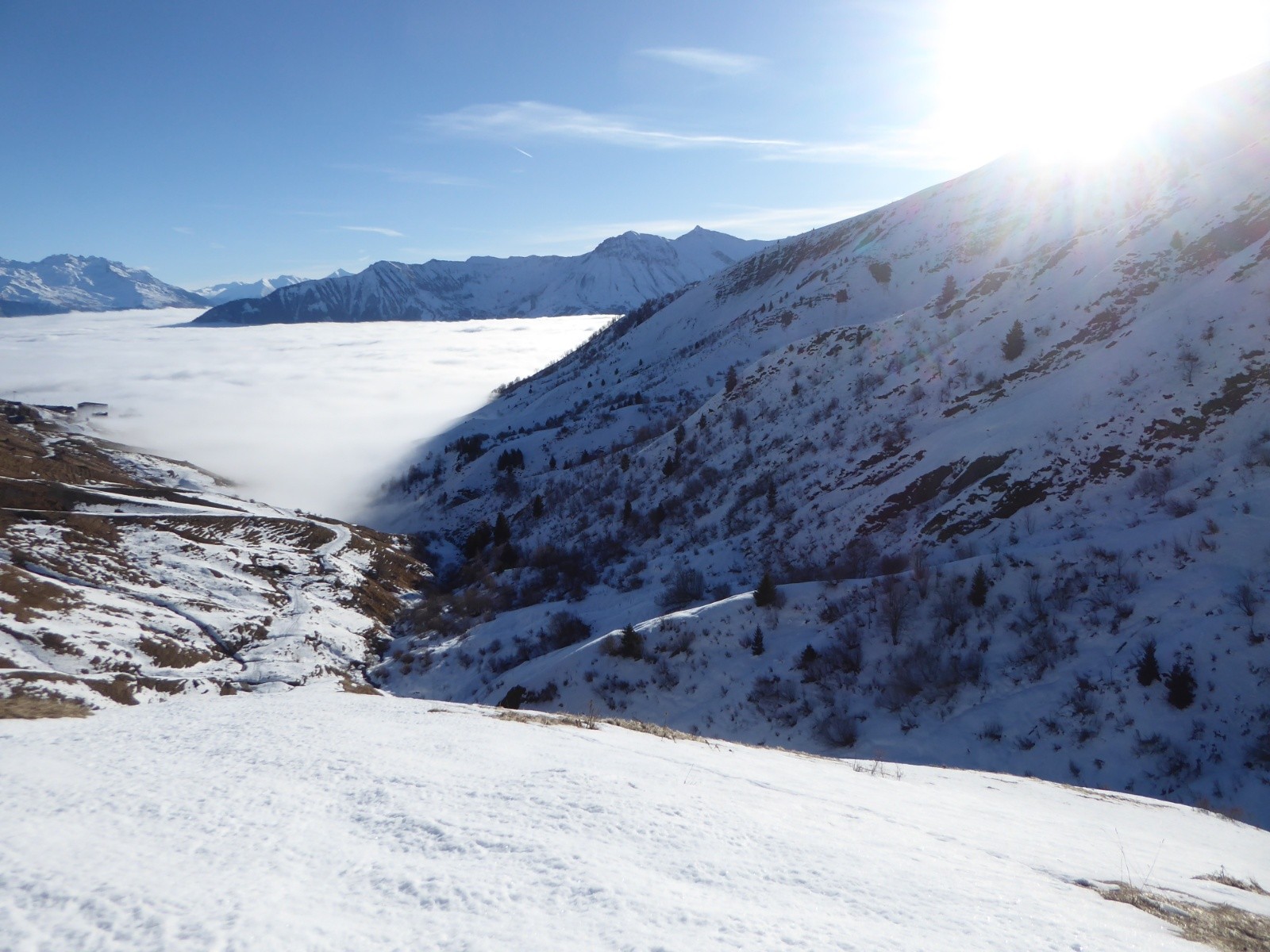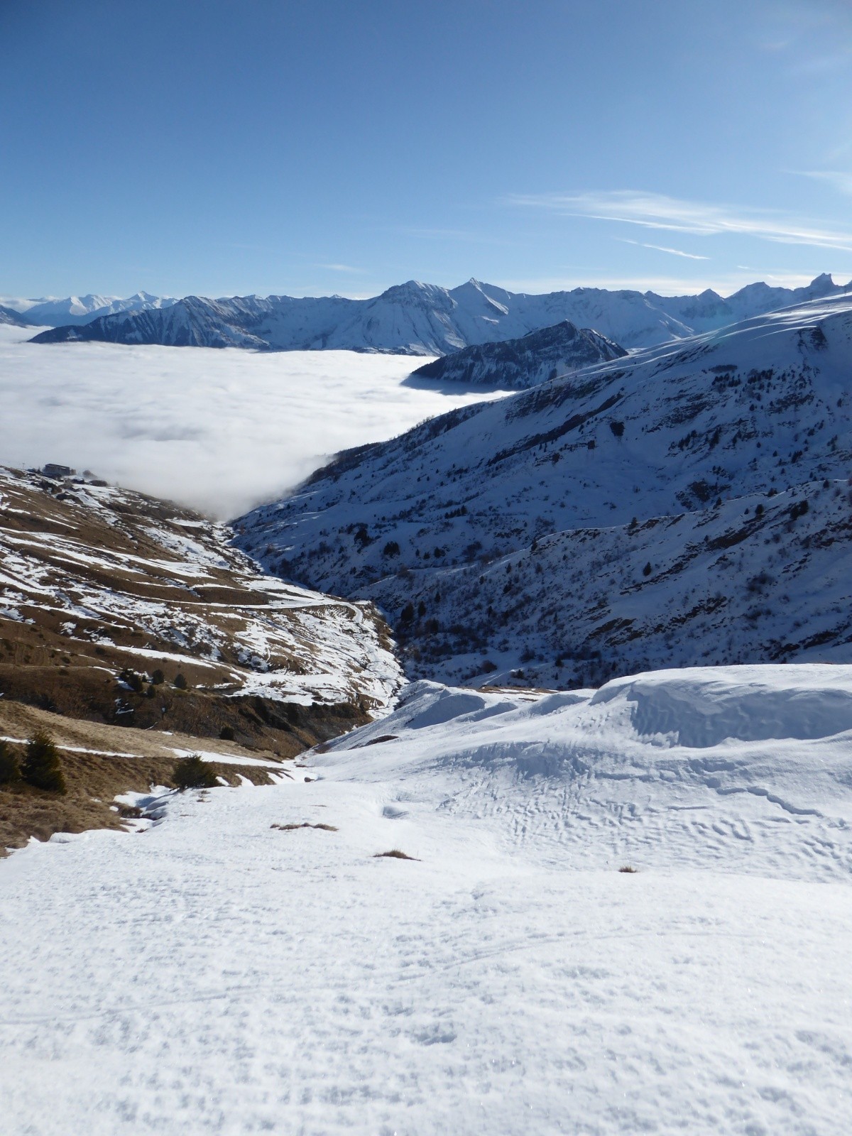 Itinéraire suivi :Je suis partis seul dans le vallon, j'ai suivie l'itinéraire du topos jusqu'à 1850m, puis j'ai monté par une croupe sud est jusqu'à la piste piéton vers 2200, ensuite longer les pistes jusqu'au sommet de l'Ouillon avec une pause pique nique bien mérité, tres jolie vue sur tous les sommets au dessus de la mer de nuage, descente par les pistes et retour au vallon par la piste rouge de l'envers fermée, pas de traces de montée dans le vallon après 1831m et sur la croupe.