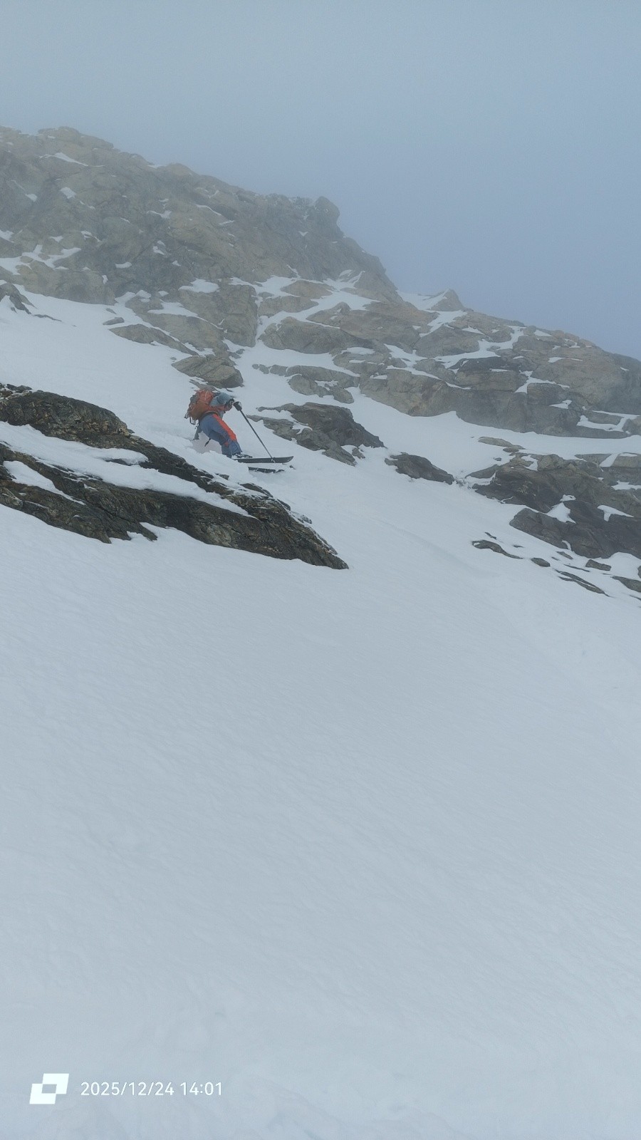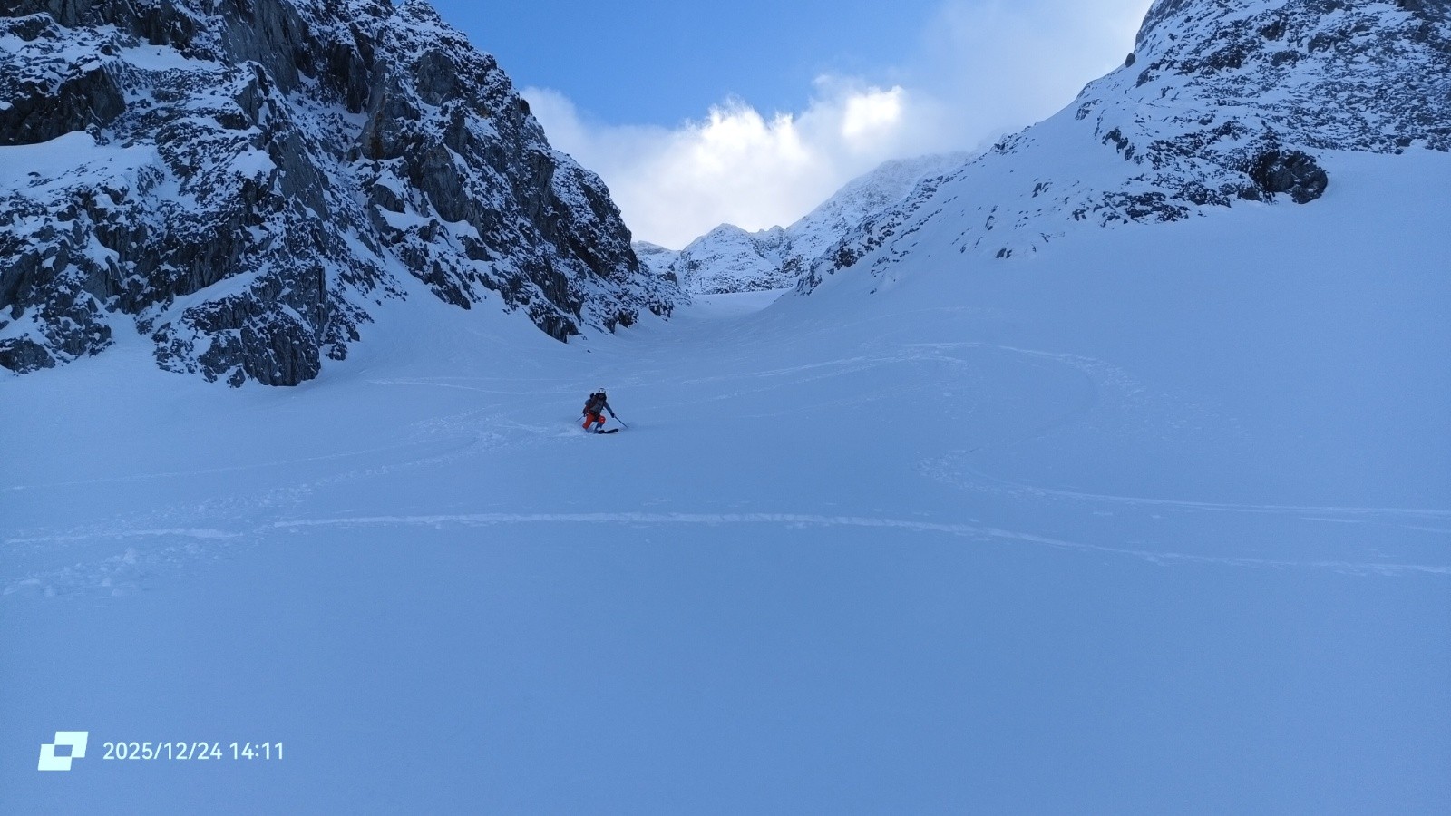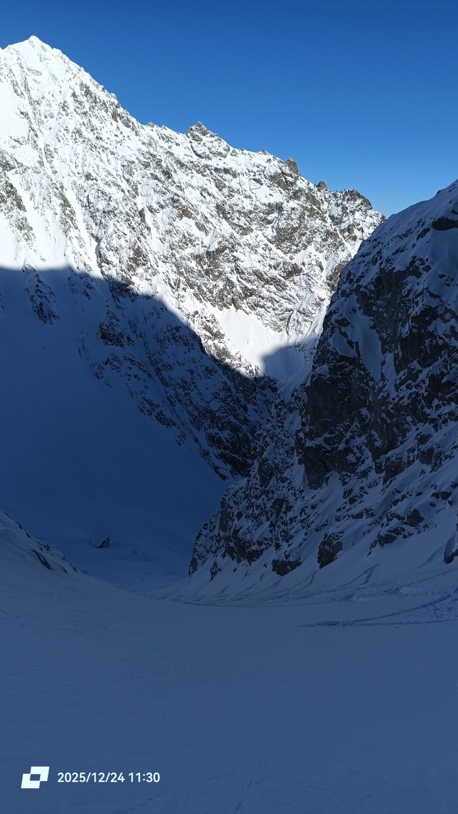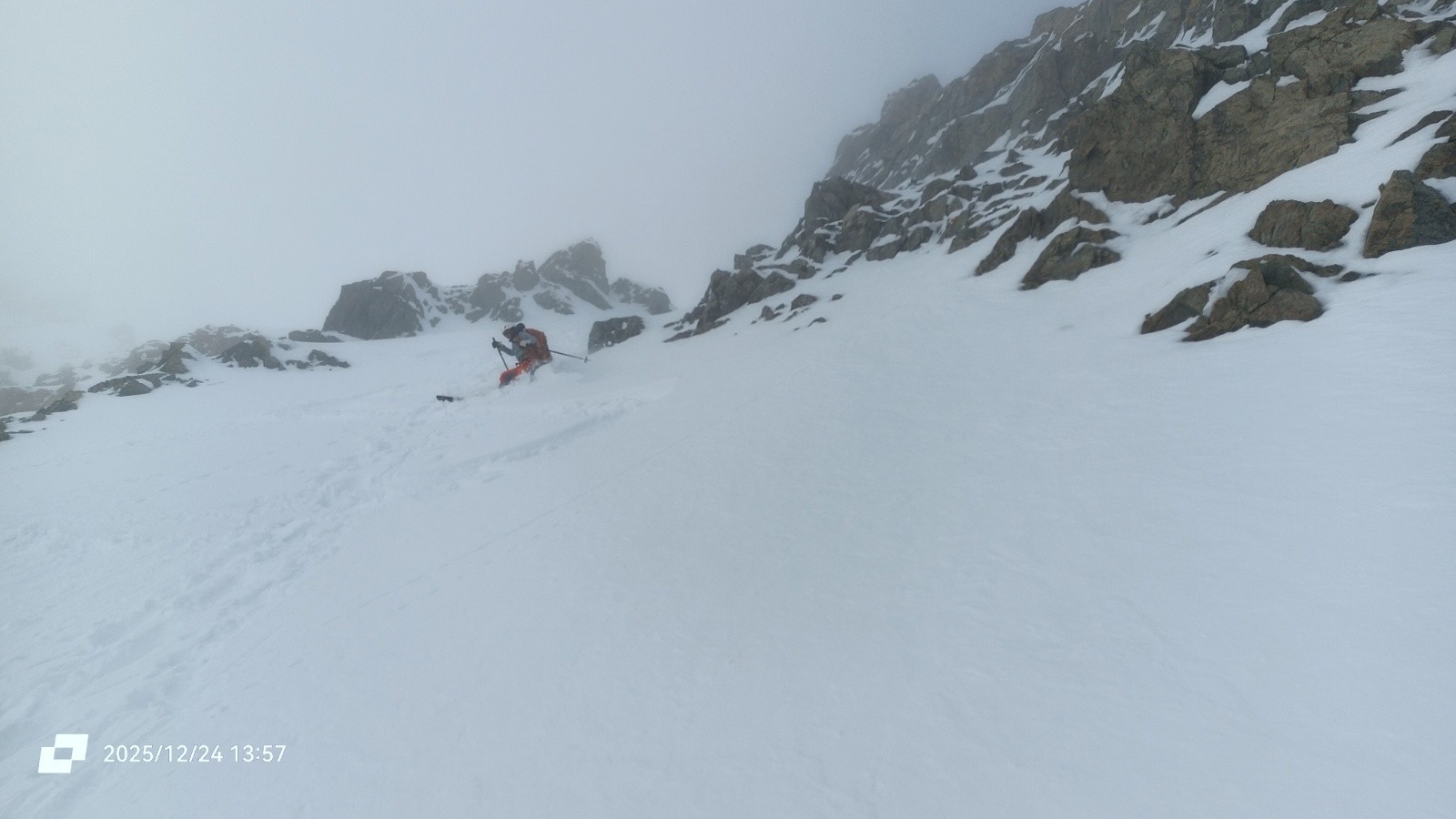 Descente de fou tout poudre jusqu'à 2500m. Il est pas trop tard et c'est pas encore trop jour blanc, on remonte fissa les 300m jusqu'au pied du couloir pour une seconde descente tout aussi folle!