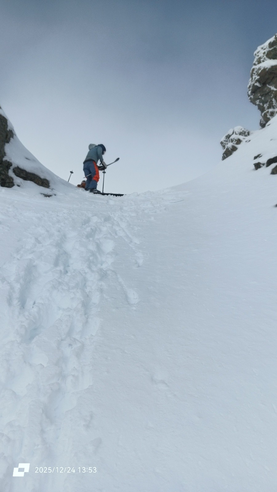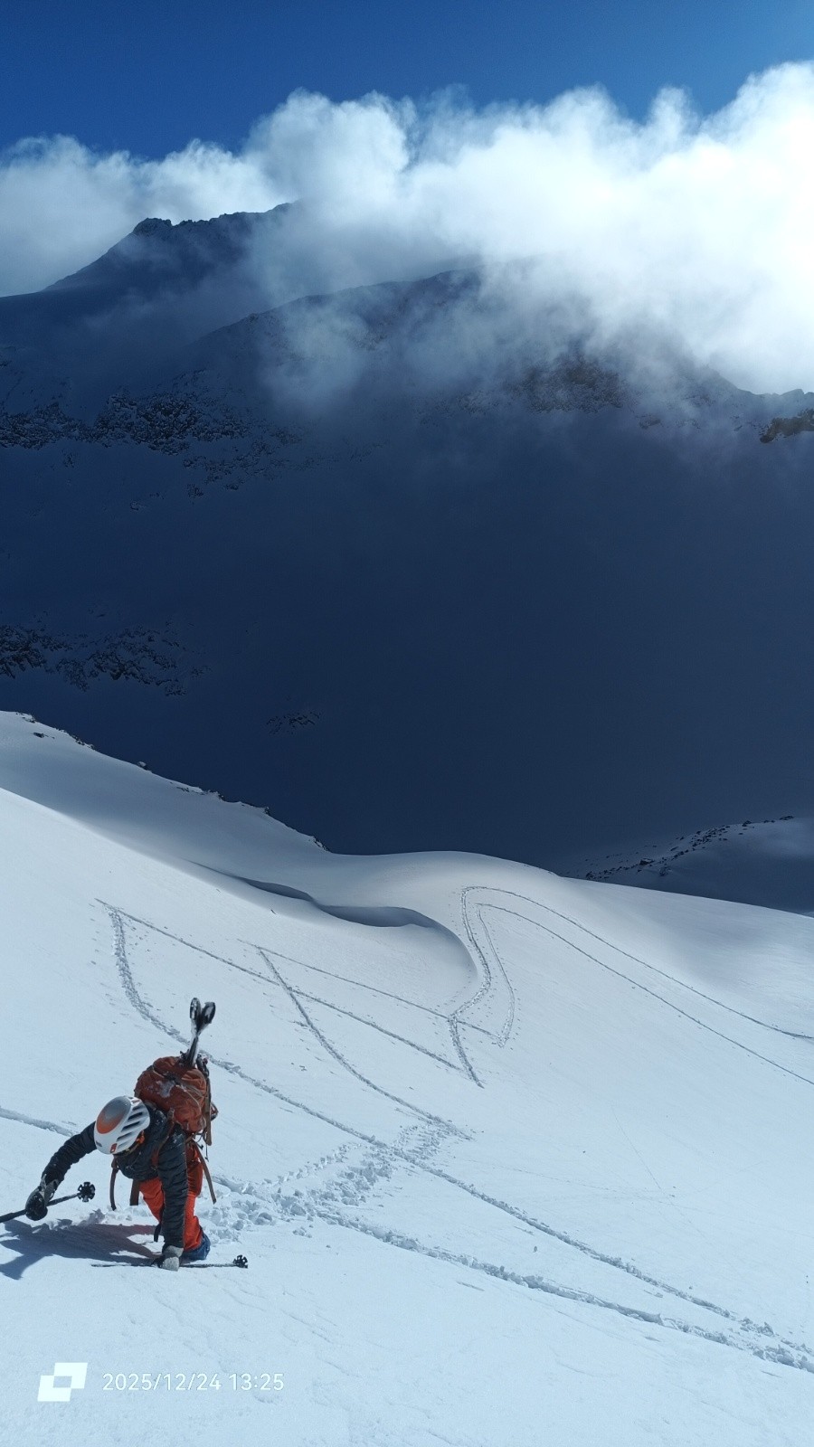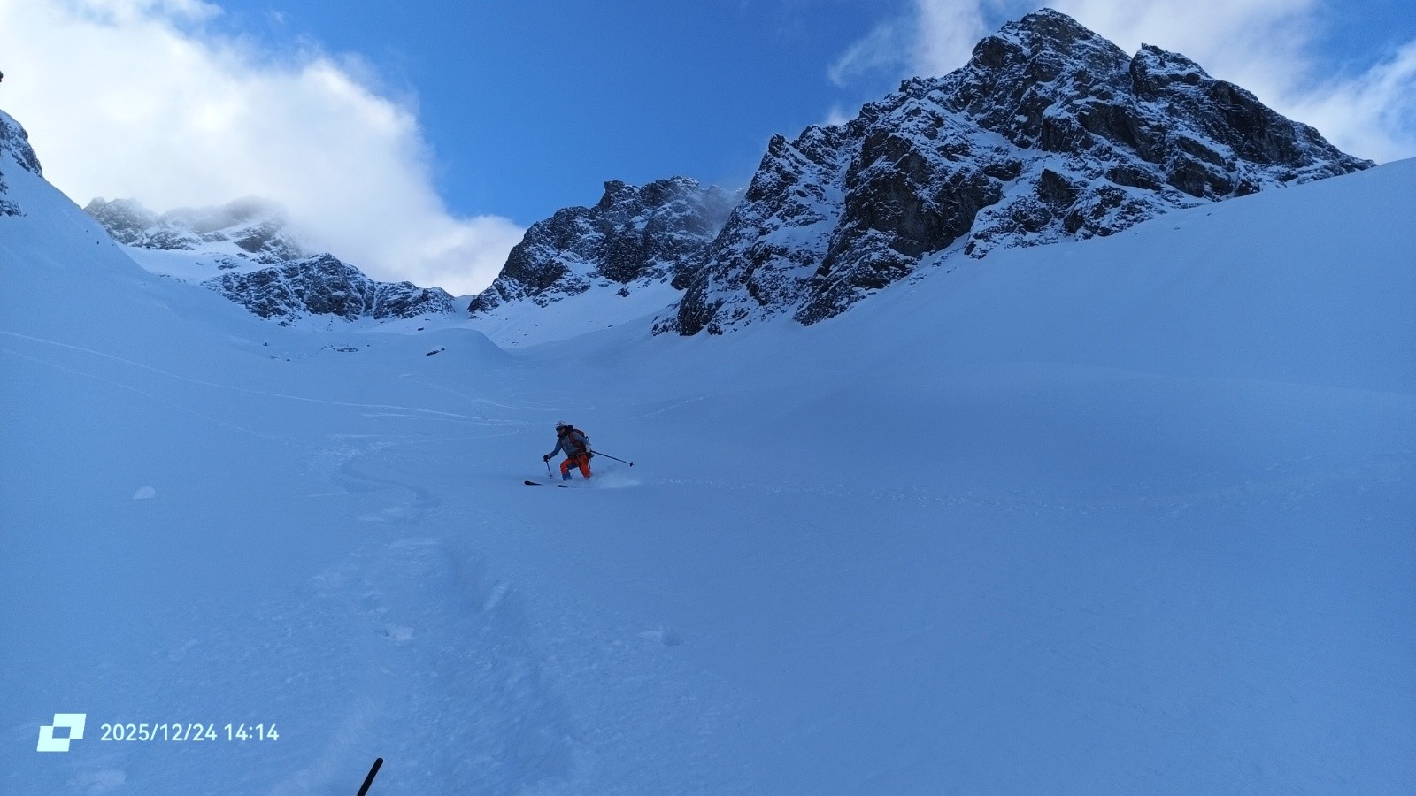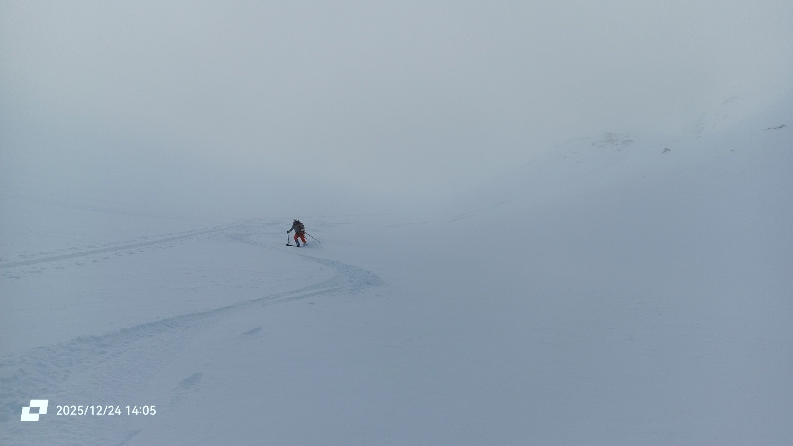 Descente de fou tout poudre jusqu'à 2500m. Il est pas trop tard et c'est pas encore trop jour blanc, on remonte fissa les 300m jusqu'au pied du couloir pour une seconde descente tout aussi folle!