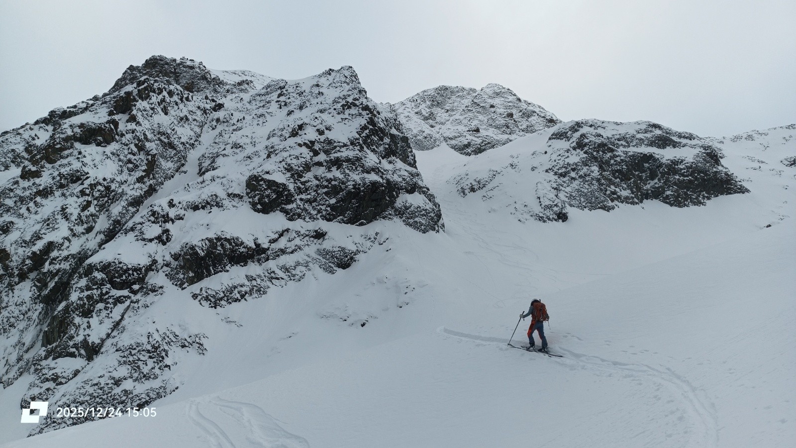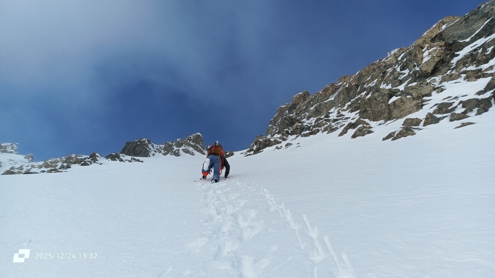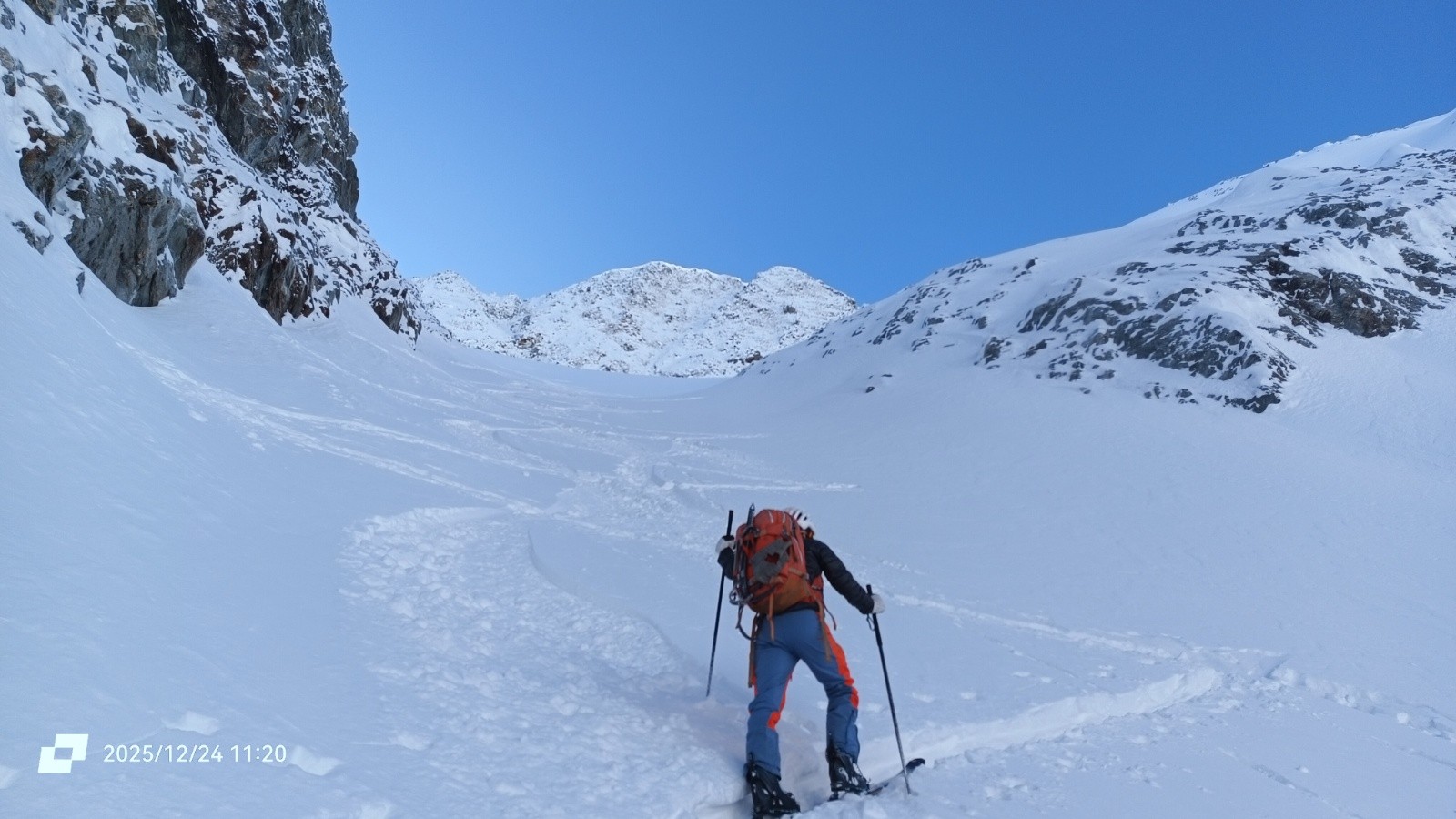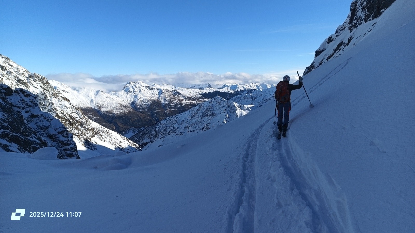 Descente de fou tout poudre jusqu'à 2500m. Il est pas trop tard et c'est pas encore trop jour blanc, on remonte fissa les 300m jusqu'au pied du couloir pour une seconde descente tout aussi folle!