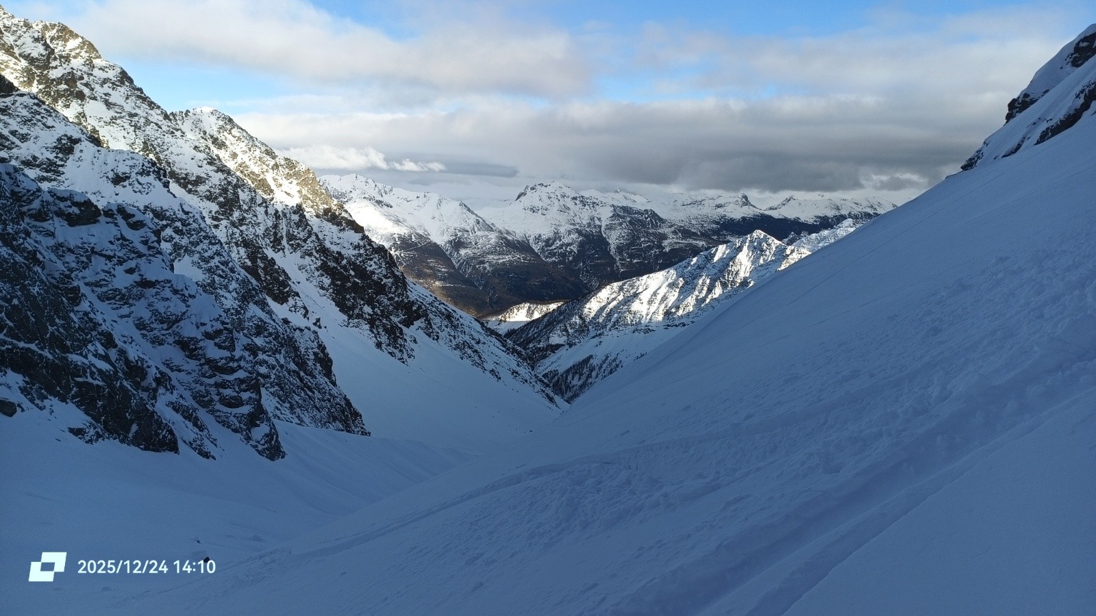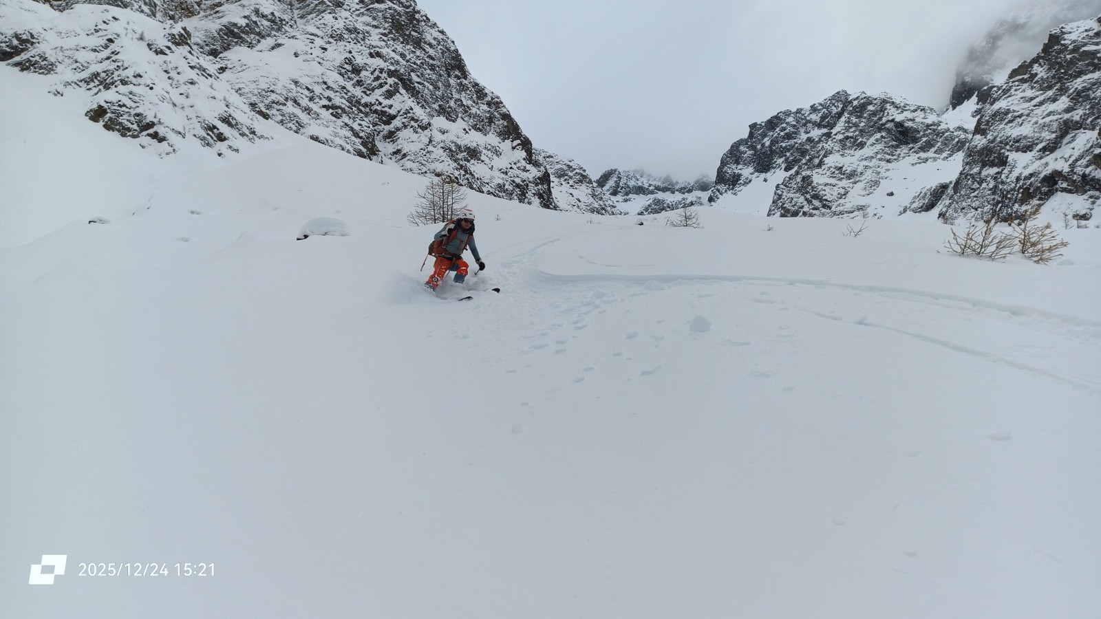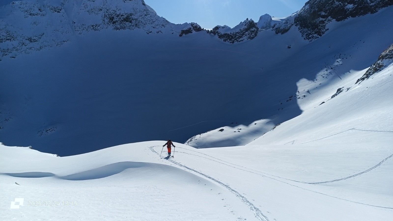 Conditions pour le ski : neige damée par le hors piste de la station jusqu'à 1950, poudre légère dans le vallon. Environ 1m10 à 2700m.