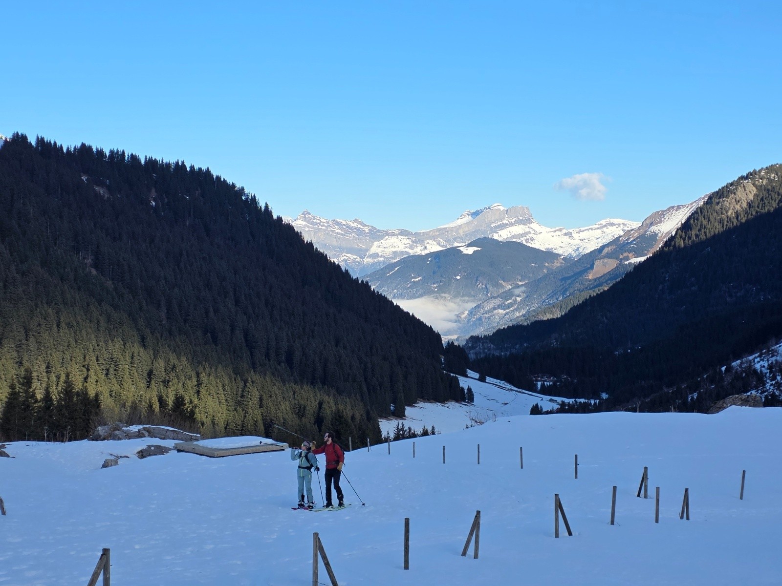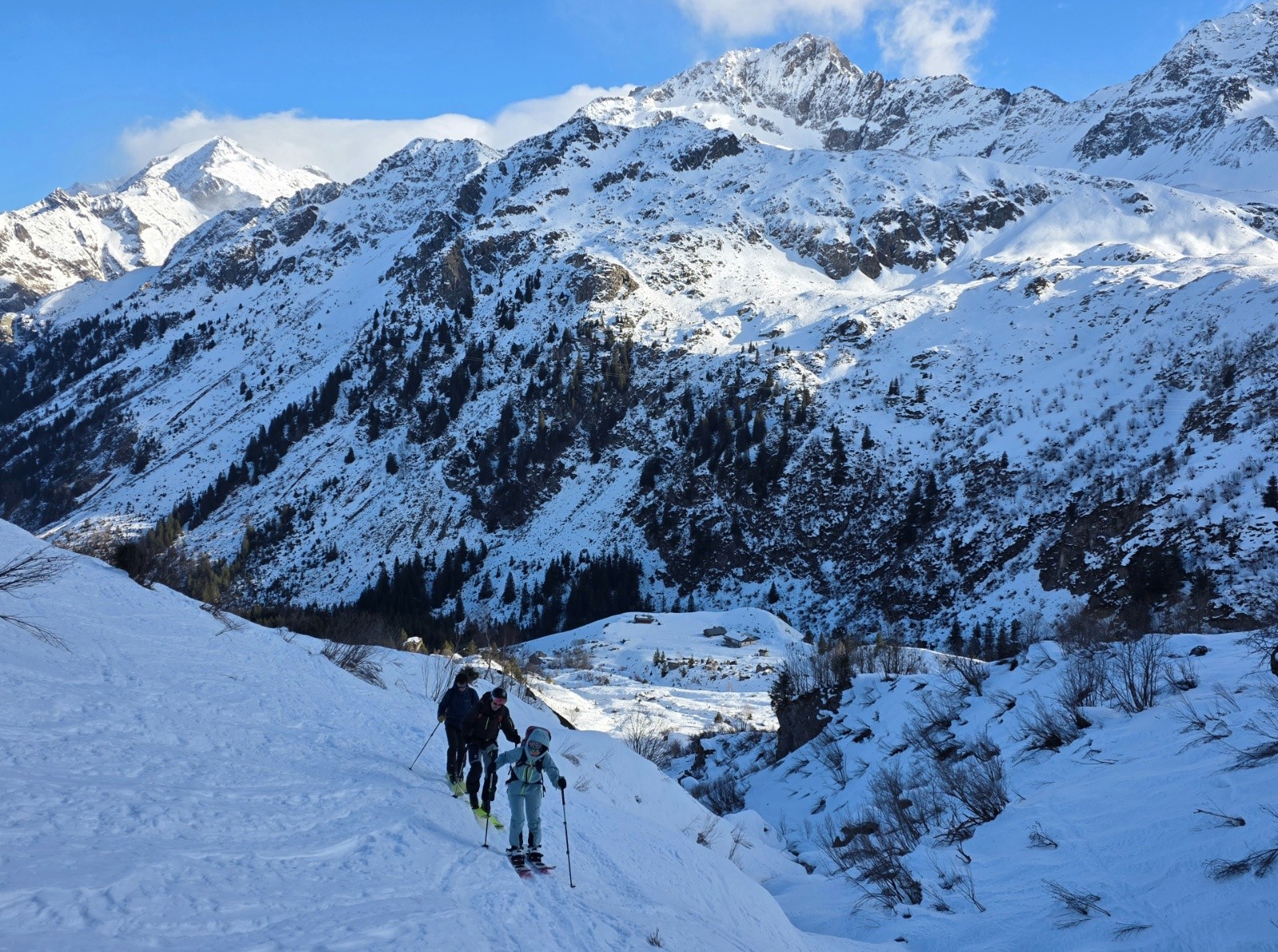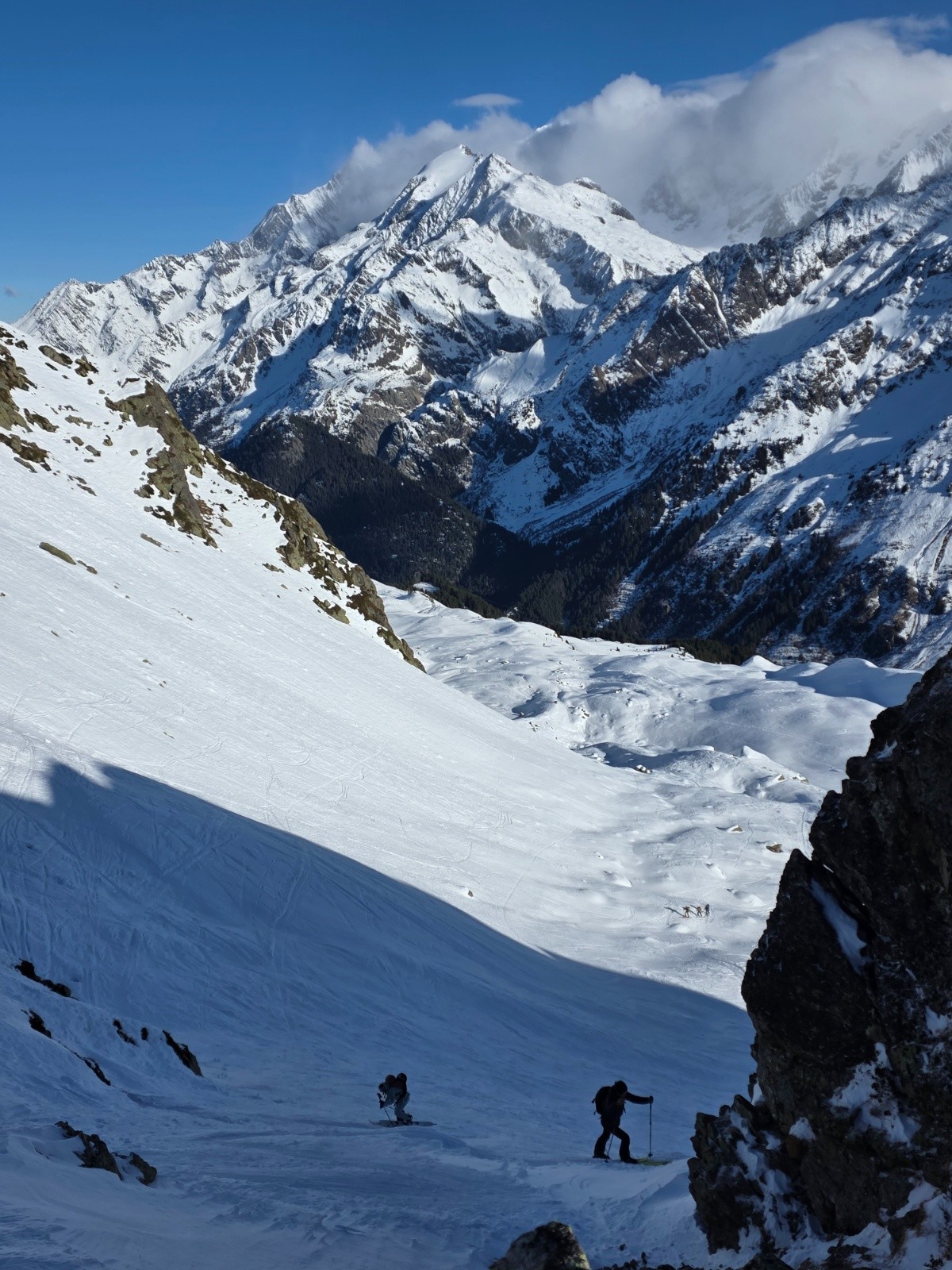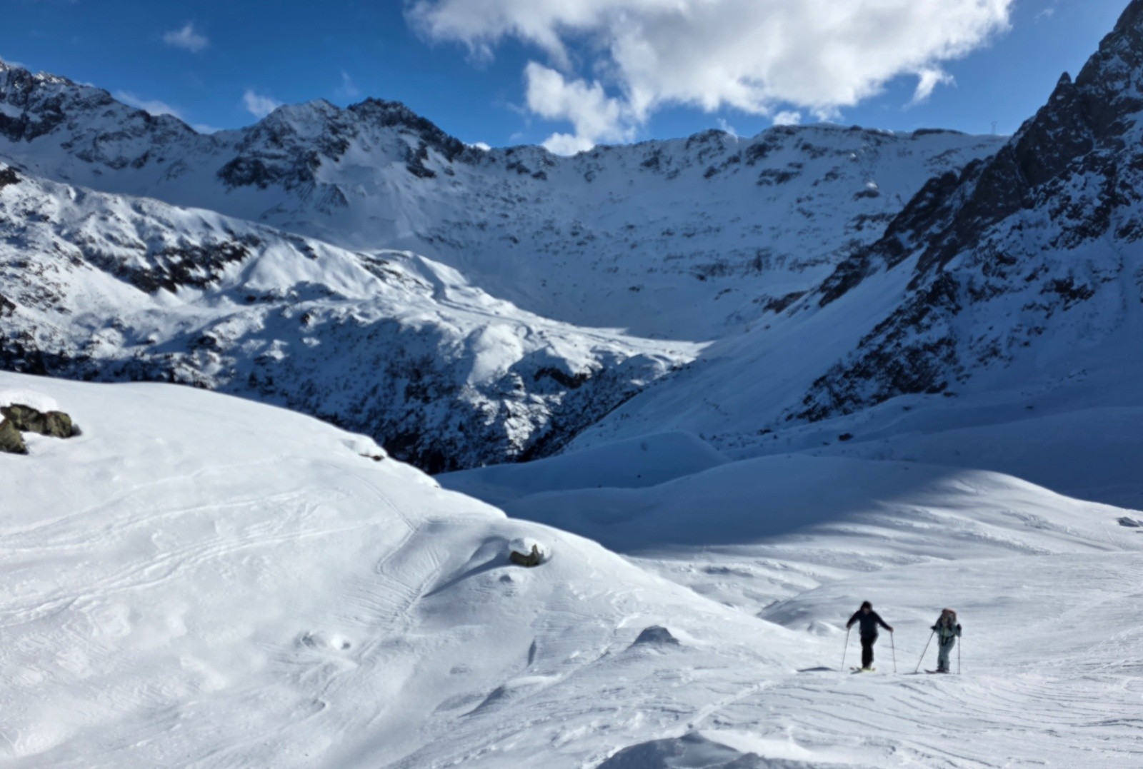 Pas vraiment de neige ou a peine sur la voie romaine jusqu'au pont romain. On n »est pas nombreux ce matin au départ de la Gorge. Apres, neige sur le chemin à Plan Joran mais pas de neige en forêt au dessus de 1500 donc on passe par la Balme et on remonte le vallôn vers le pied de la Cicle qu'on évite a cause du vent a décorner les bœufs en haut. Le fœhn sur les crêtes du Miage souffle a plein. Neige vitrifiée en versant sud On passe le col de la fenêtre dans des conditions tres correctes (vent soutenu en haut). On prolonge un peu vers la tête de la Cicle mais on abandonne vite car vent trop fort sur les crêtes. Descente dans le goulet OK puis.retour vers les Conta et les pistes pour éviter une descente trop galère. Une belle sortie en montagne malgré un ski dans ûe neige mediocre et malgré le vent parfois tres violent entre 60 et 100. Une ambiance du tonnerre , comme d hab dans le coin.