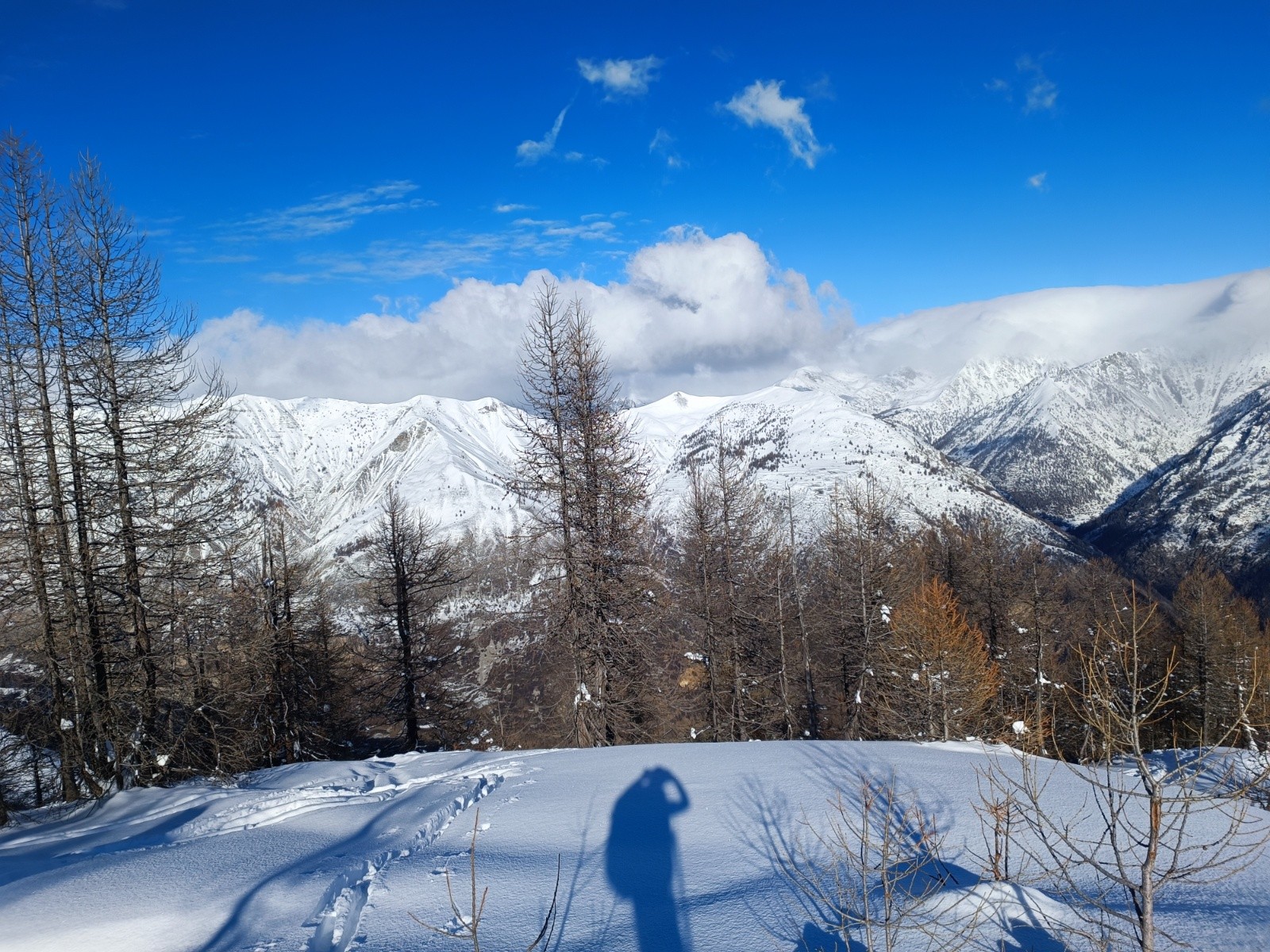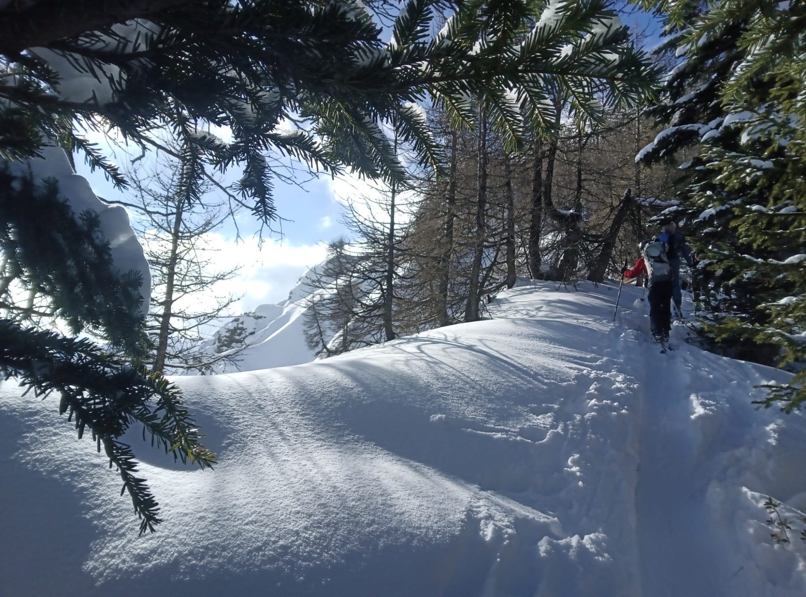 des que la portion de piste verglacée est finie, la neige fraiche est de plus en plus épaisse.le bas de la foret manque de neige, nous avons pris la piste a partir de 1700.
