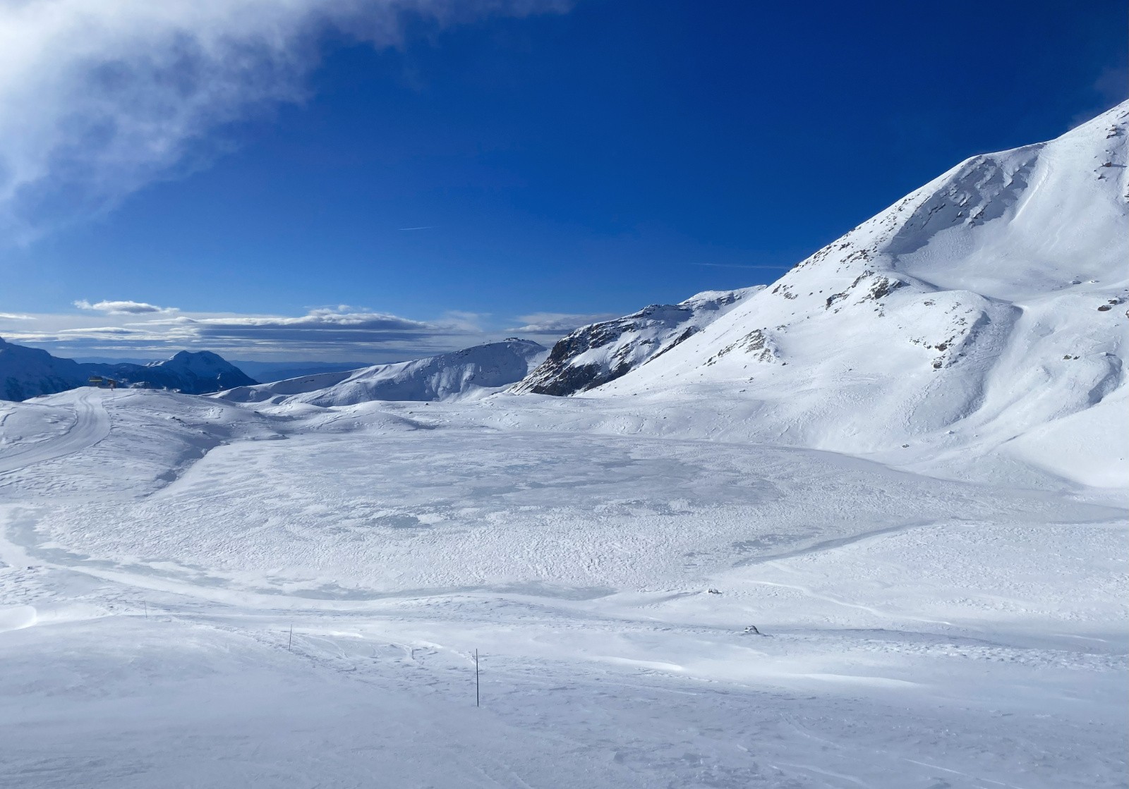 Conditions pour le ski : Bonnes tout en haut au dessus de 2600, en dessous mieux vaut rester sur les pistes (fermées ce jour): neige très dure, quand il y en a, quelques zones en carton plus agréables.