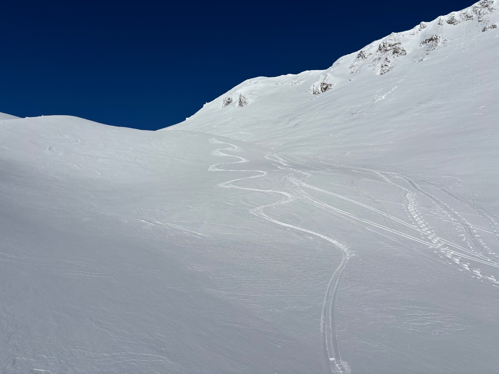 Conditions pour le ski : franchement pas mal du tout! Toute la partie haute jusqu’à 2400m est en neige petite poudreuse sur fond portant, sommet et contre pentes très agréables à skier. En dessous ça passe même si c’est pauvre en neige on peut couper la route à la montée comme à la descente