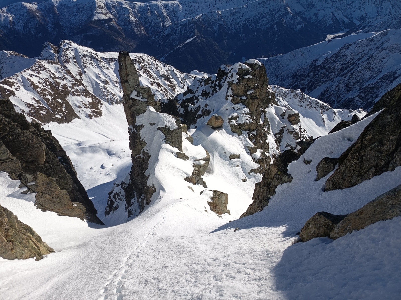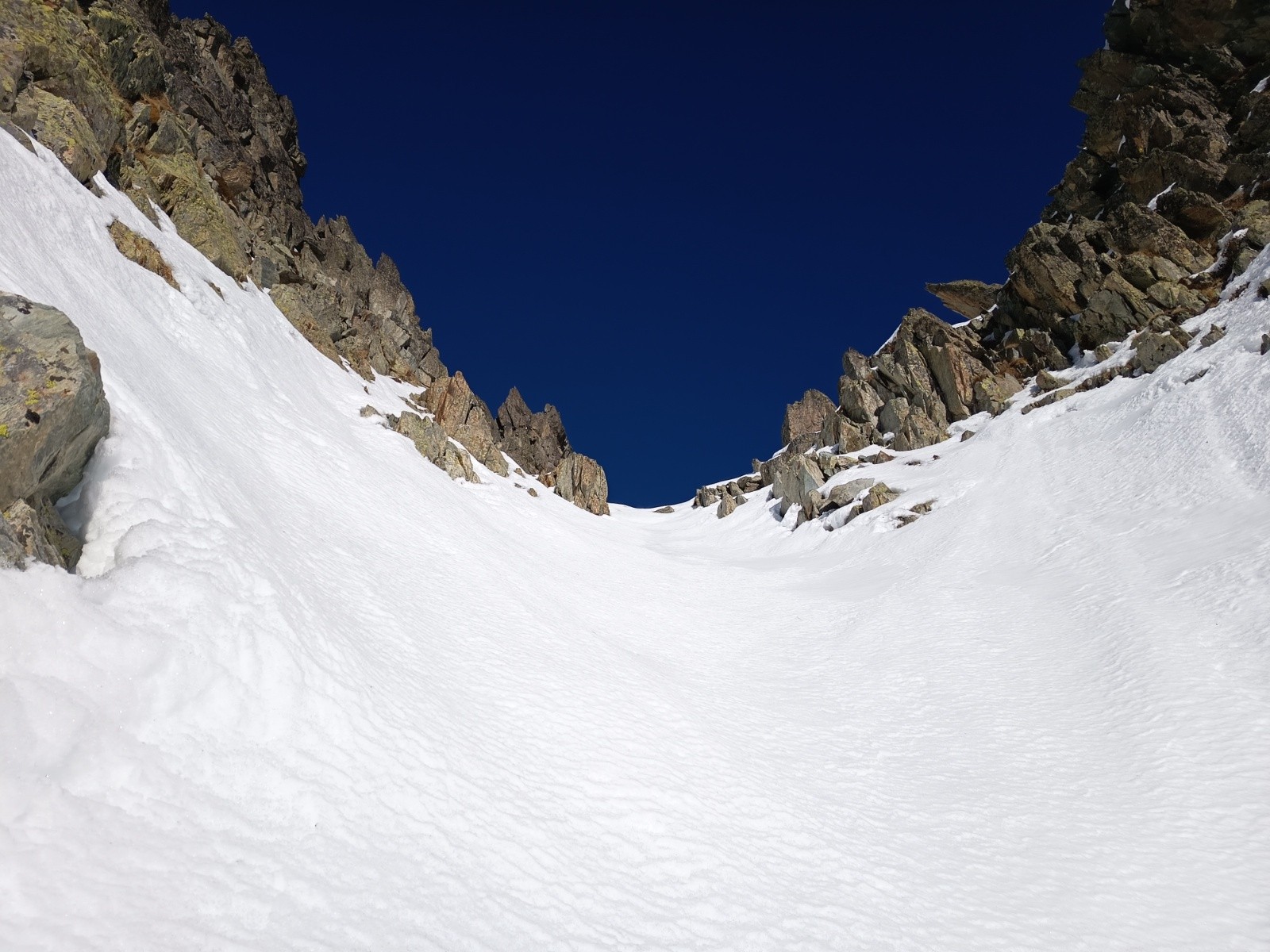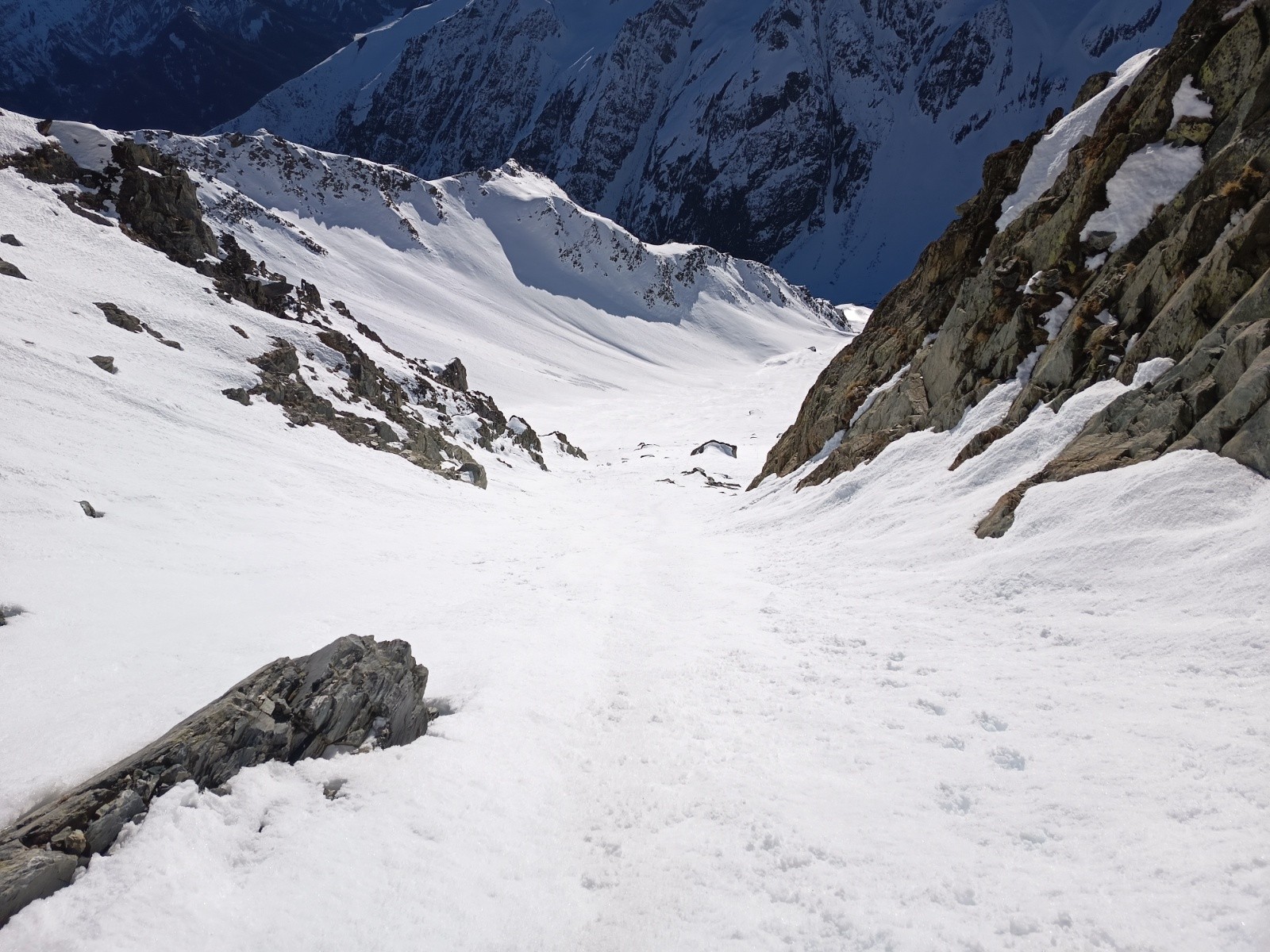 Conditions pour le ski : très bon regel, couloir juste décaillé, très bon entre 2500 et 1800, en dessus neige dure soufflée avec bon grip, en dessous neige verglacée qui n'a pas bougée de la journée