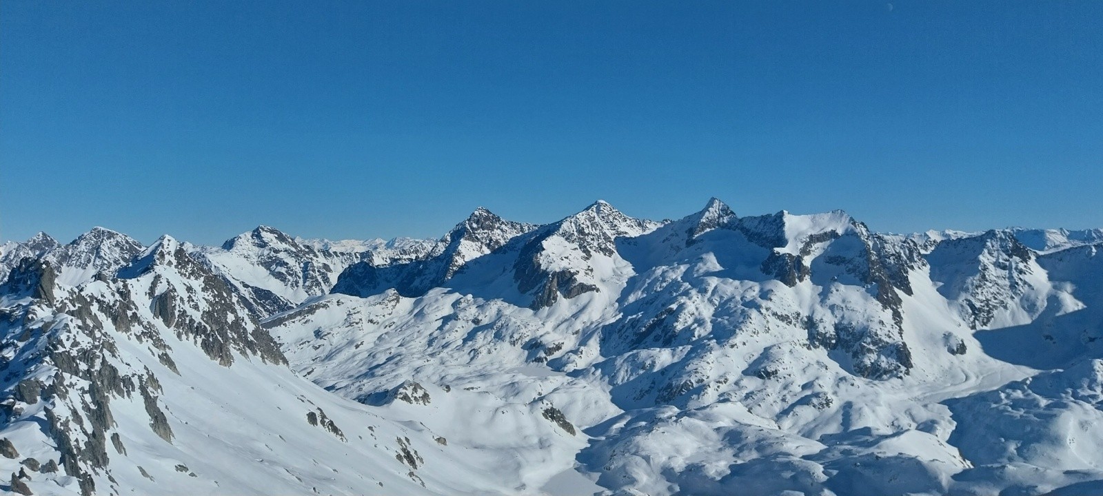 J'ai remonté la première partie avec les couteaux en prévention mais la neige s'est nettement améliorée, ça annonce du bon pour la suite😁. Je recroise un des deux binômes, il me conseille un petit couloir orienté SE de la Belle Étoile. Je prends note pour une prochaine fois parce que j'aime bien ce genre de petite variante plus difficile mais pas de folie aujourd'hui. On se sépare à nouveau et de manière définitive cette fois car je prends la direction de la Belle Étoile et eux du Dôme de Vouteret. Bien sympa quand même ces petites rencontres, ça ajoute un peu de vie à ma solitude que j'ai pourtant choisie aujourd'hui🙃. Je me suis ensuite présenté devant le couloir Sud de la Belle Étoile, j'ai eu du mal à sortir le sommet. J'ai eu un sacré coup de mou, je n'avais plus de rythme. Par contre ce couloir est toujours aussi agréable. En plus la vue en haut gratifie bien les efforts fournis😍. J'ai dû redescendre à l'entrée du couloir pour manger le sandwich à cause du vent😢. Une fois le sandwich avalé je repars, la descente du couloir était super bonne. En dessous je me suis mis en rive gauche, c'était lisse et dur mais pas désagréable. Ensuite ça avait bien ramolli mais pas de moquette à cause des traces un peu partout. Plutôt bon quand même ! Ensuite je suis descendu encore plus bas, sous le pic du Pin et là j'y ai enfin trouvé de la moquette. Bonne mais un poil trop revenue, je prends avec plaisir quand même😉.
