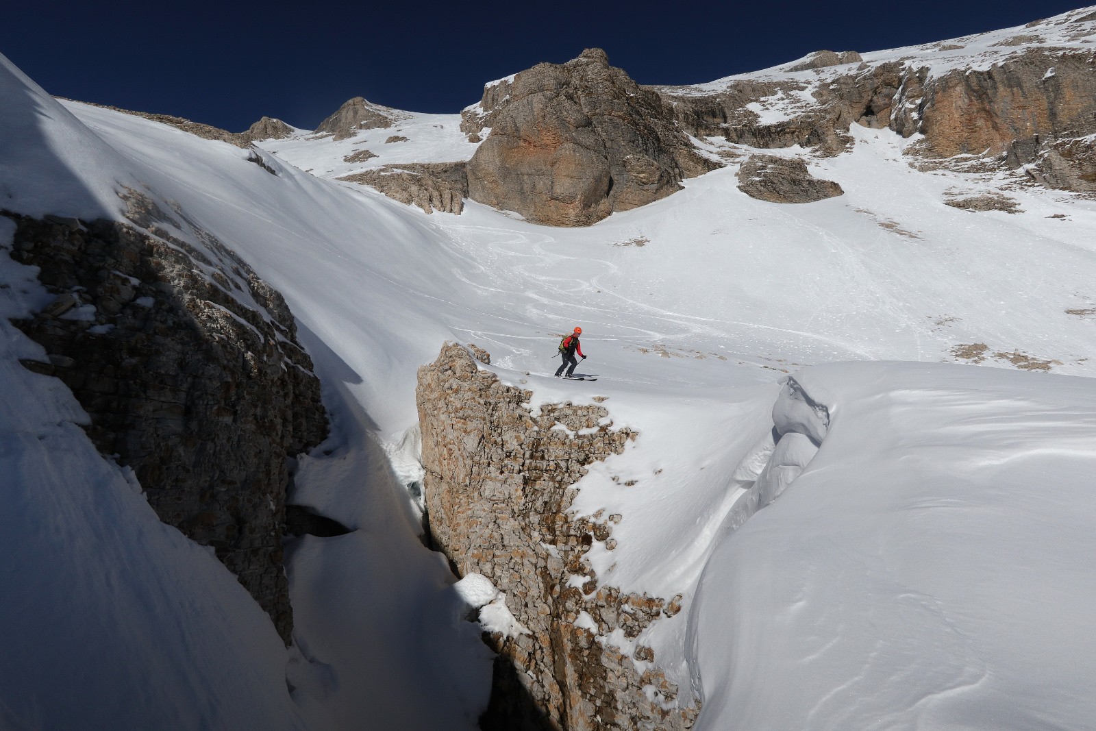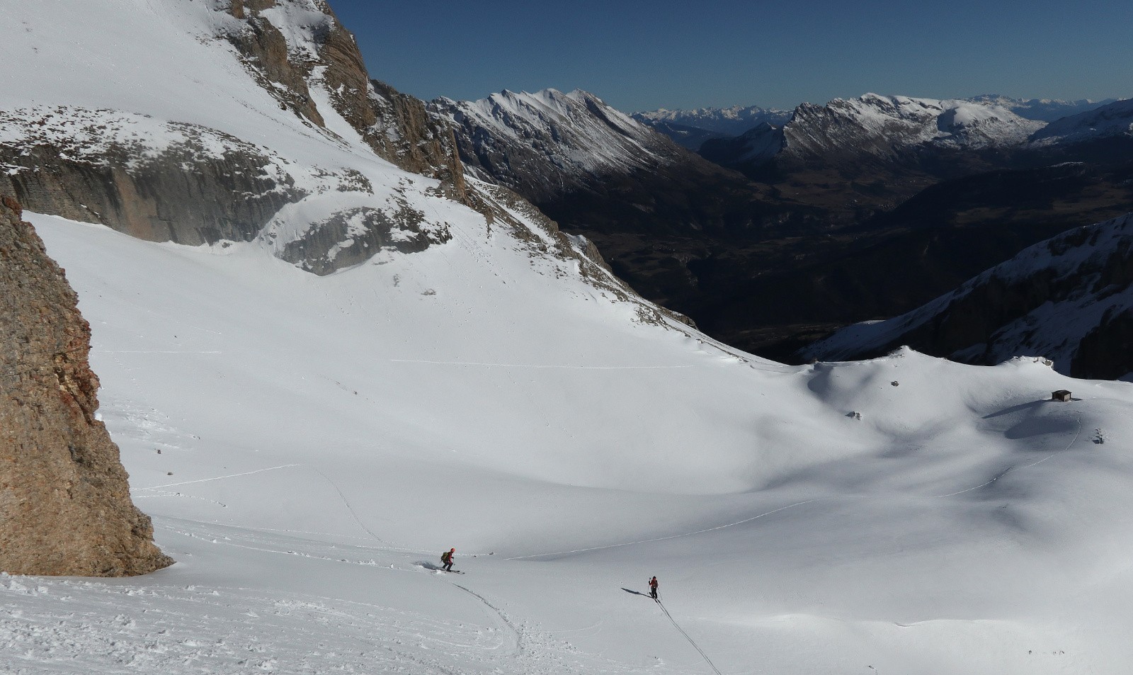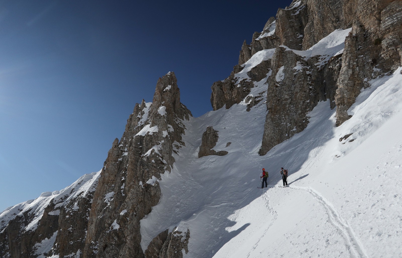 Après avoir plongé dans la Combe de la Prison, on abandonne l’itinéraire du Col de la Fuvelle et du Bonnet de l’Evêque tracé la veille, pour remonter la combe et aller à la découverte du très secret Col du Portail : superbe !